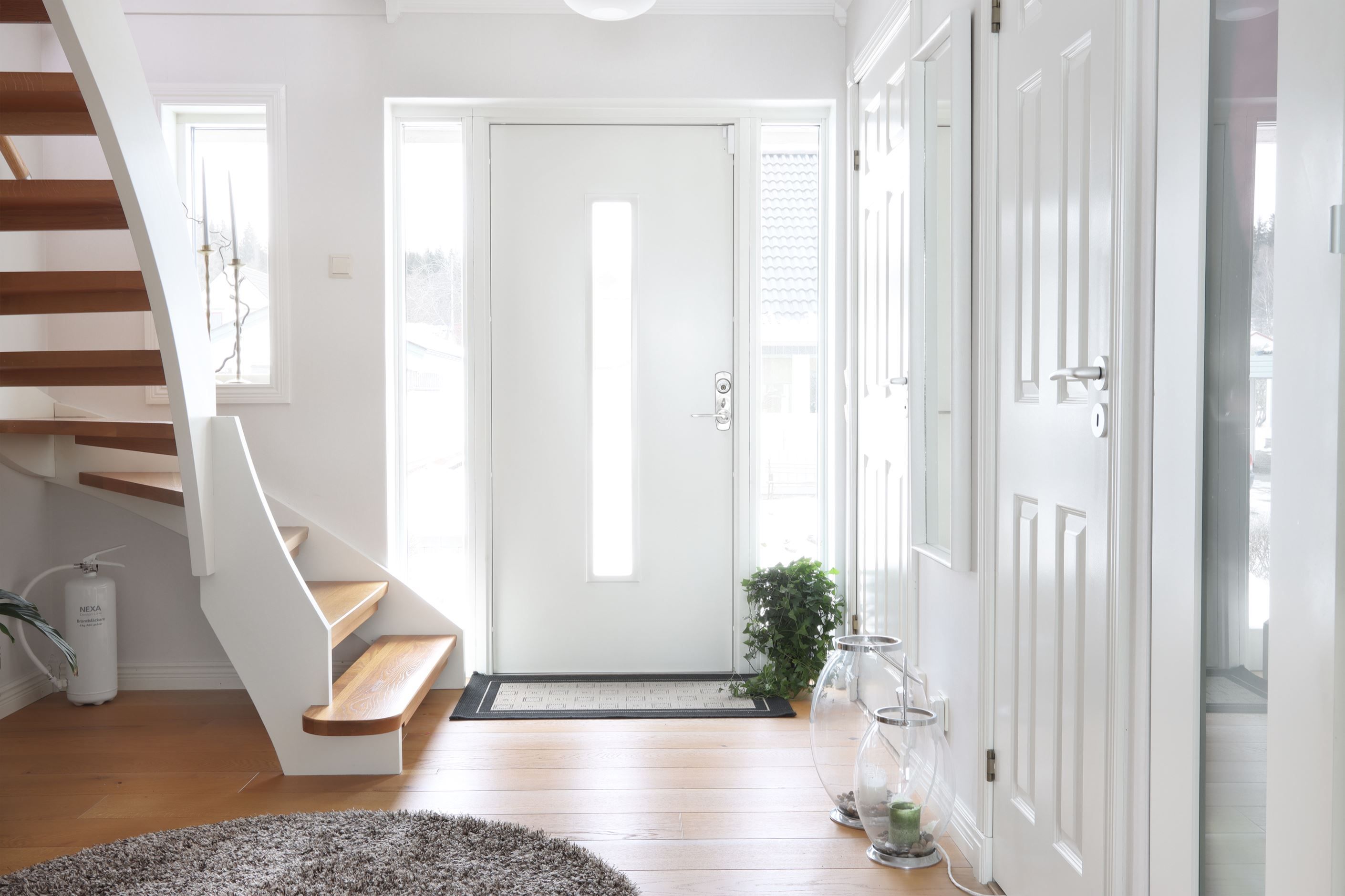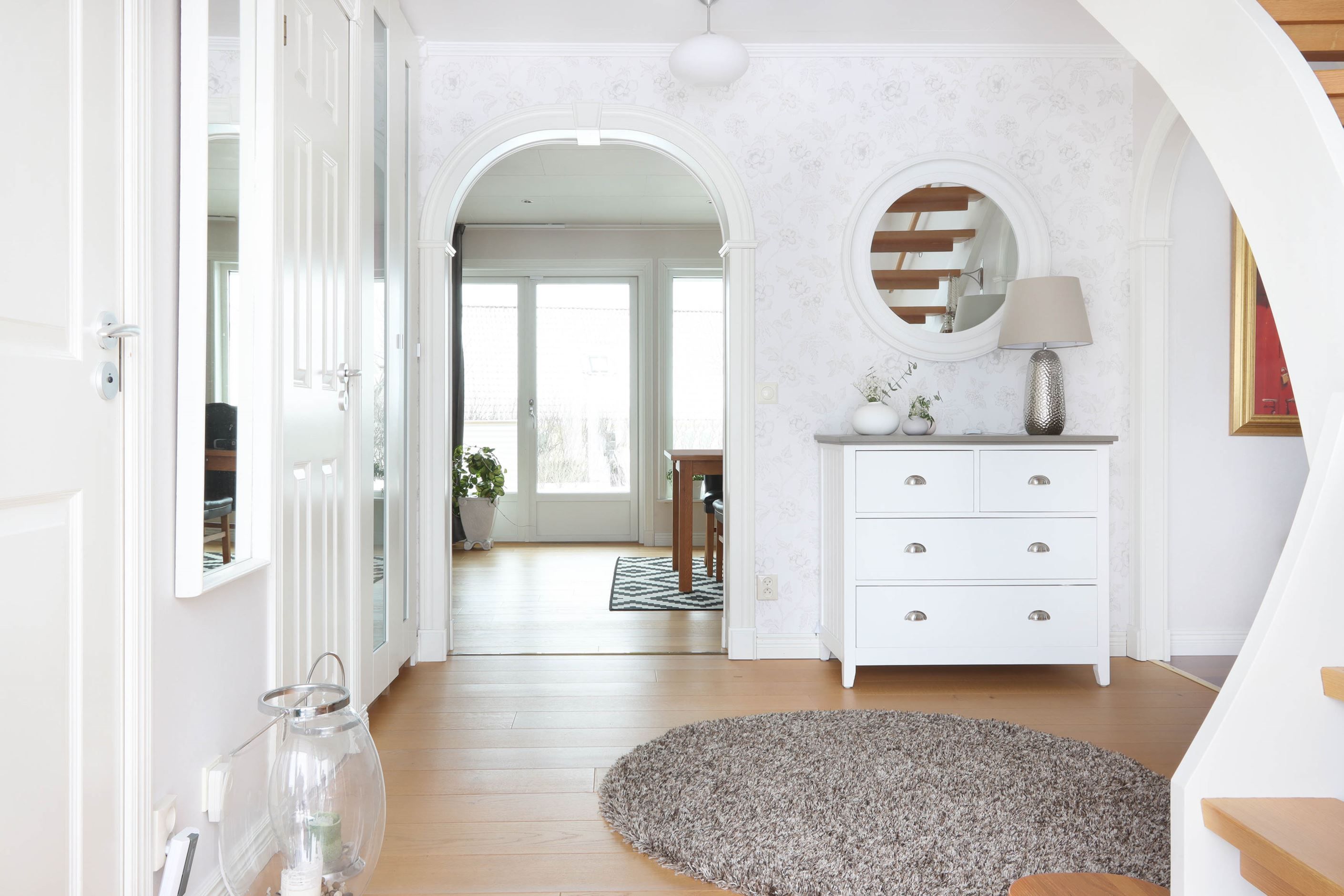 När du kommer in genom den stora entrén möts du av en stor och rymlig hall. Här har du en gästtoalett samt en klädkammare/förråd och en trappa som leder dig upp till övre plan. När du kommer upp för trappan möts du av ett allrum med ett renoverat badrum i anslutning till detta.