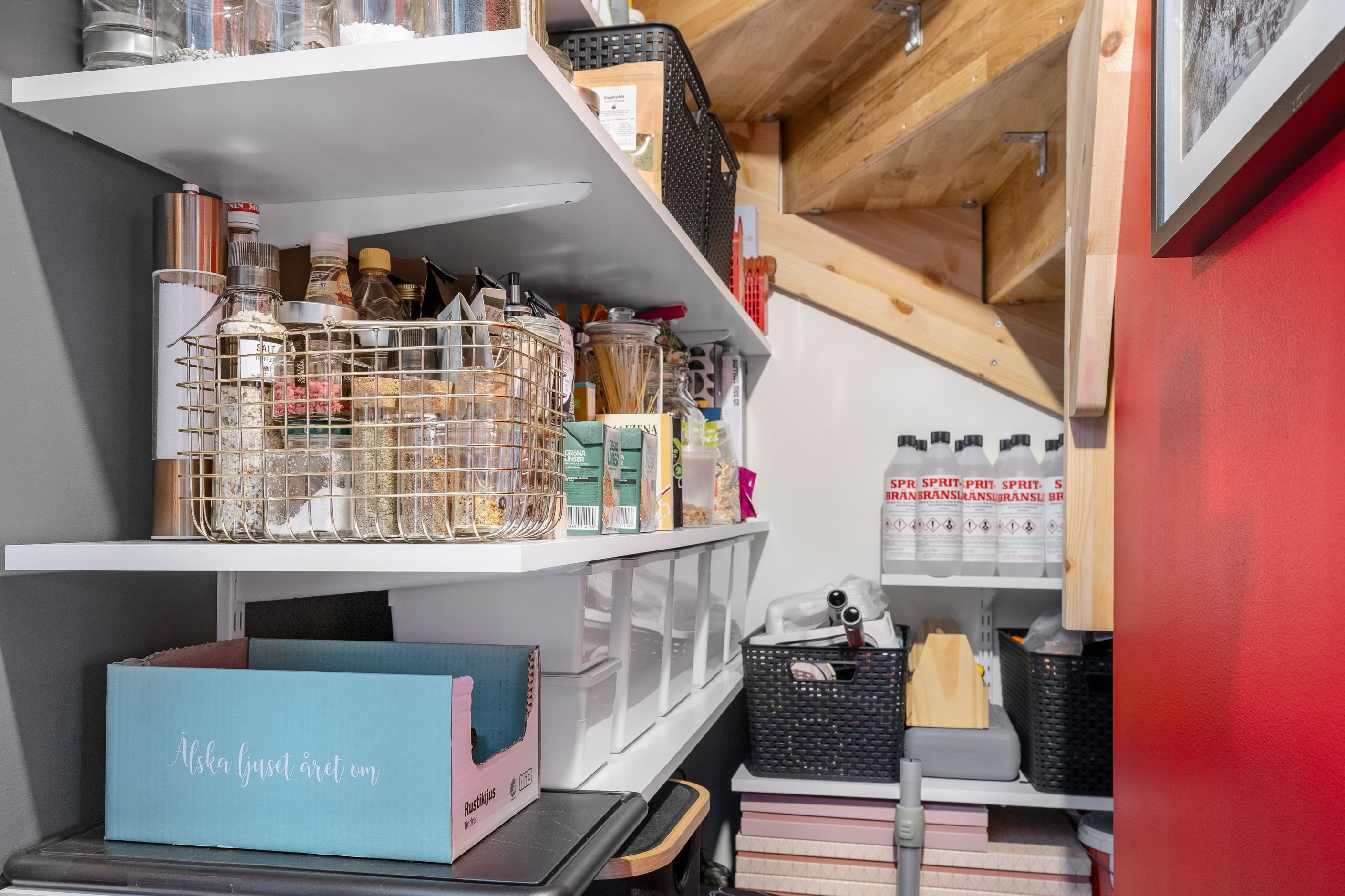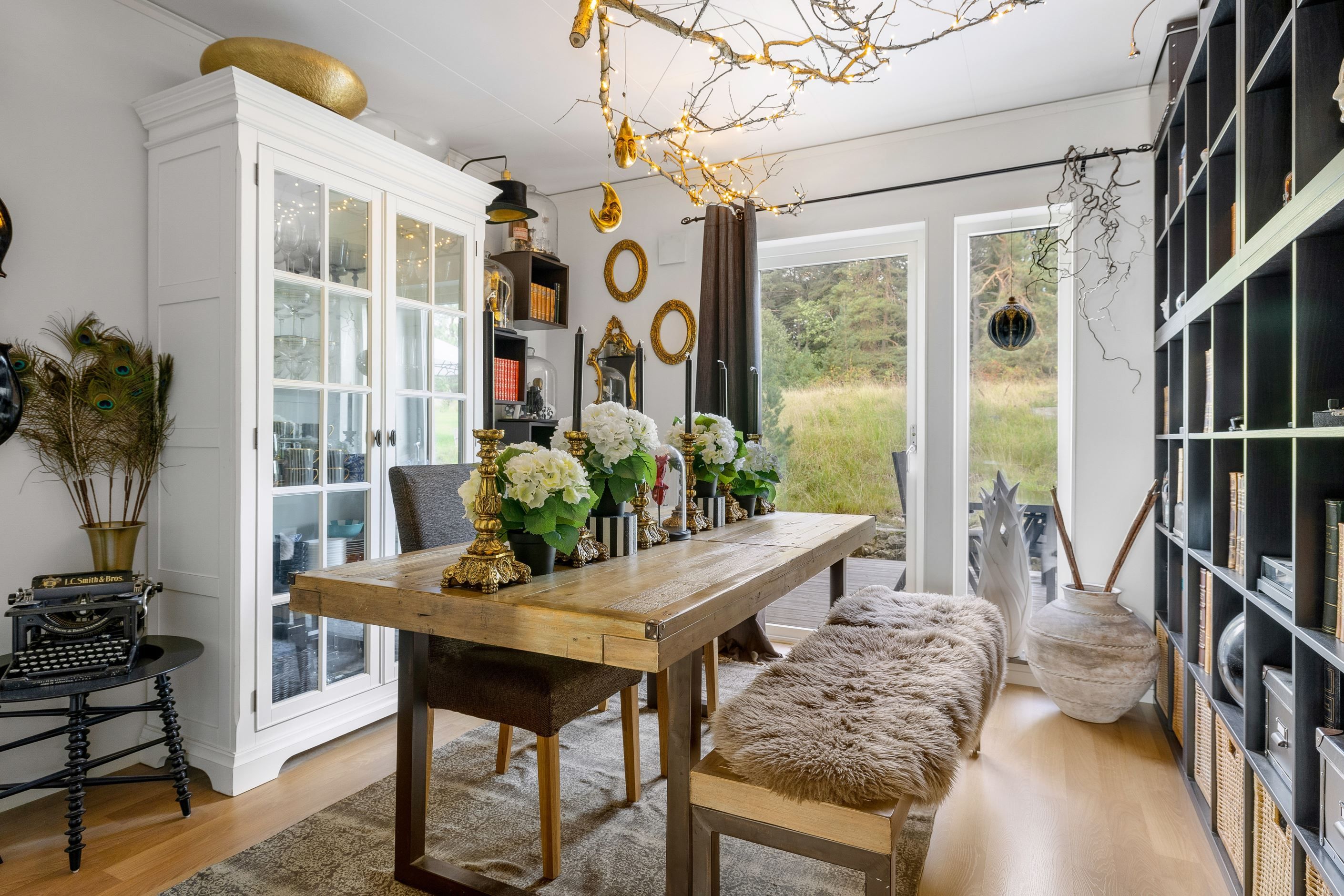 Inuti välkomnas du av en stor hall med gott om förvaringsutrymme och klädkammare samt teknikrum. Köket är med gott om skåp för förvaring. Vardagsrummet är luftigt och har utgång till baksidan där du finner en terrass i soligt läge. På nedre plan finns även ett badrum med dusch och tvättmöjligheter. Praktiskt förråd under trappen.