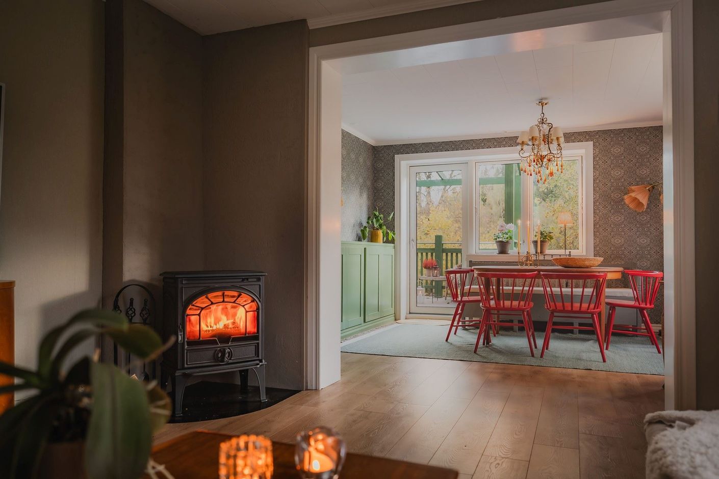 Inne i huset väntar en välkomnande atmosfär med bevarade originaldetaljer, pärlspont, vackra tapeter och en kamin i vardagsrummet som sprider både värme och hemtrevnad.