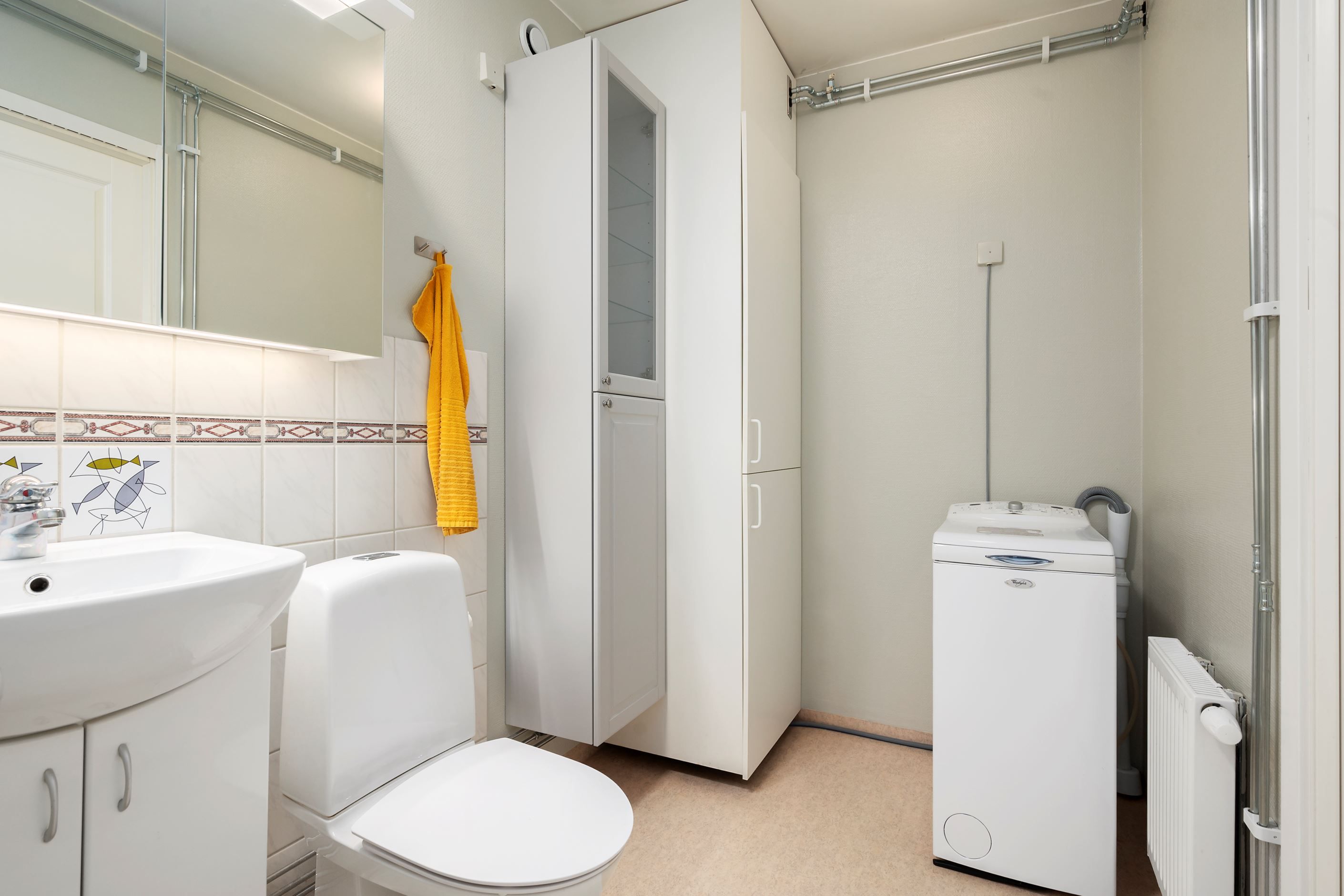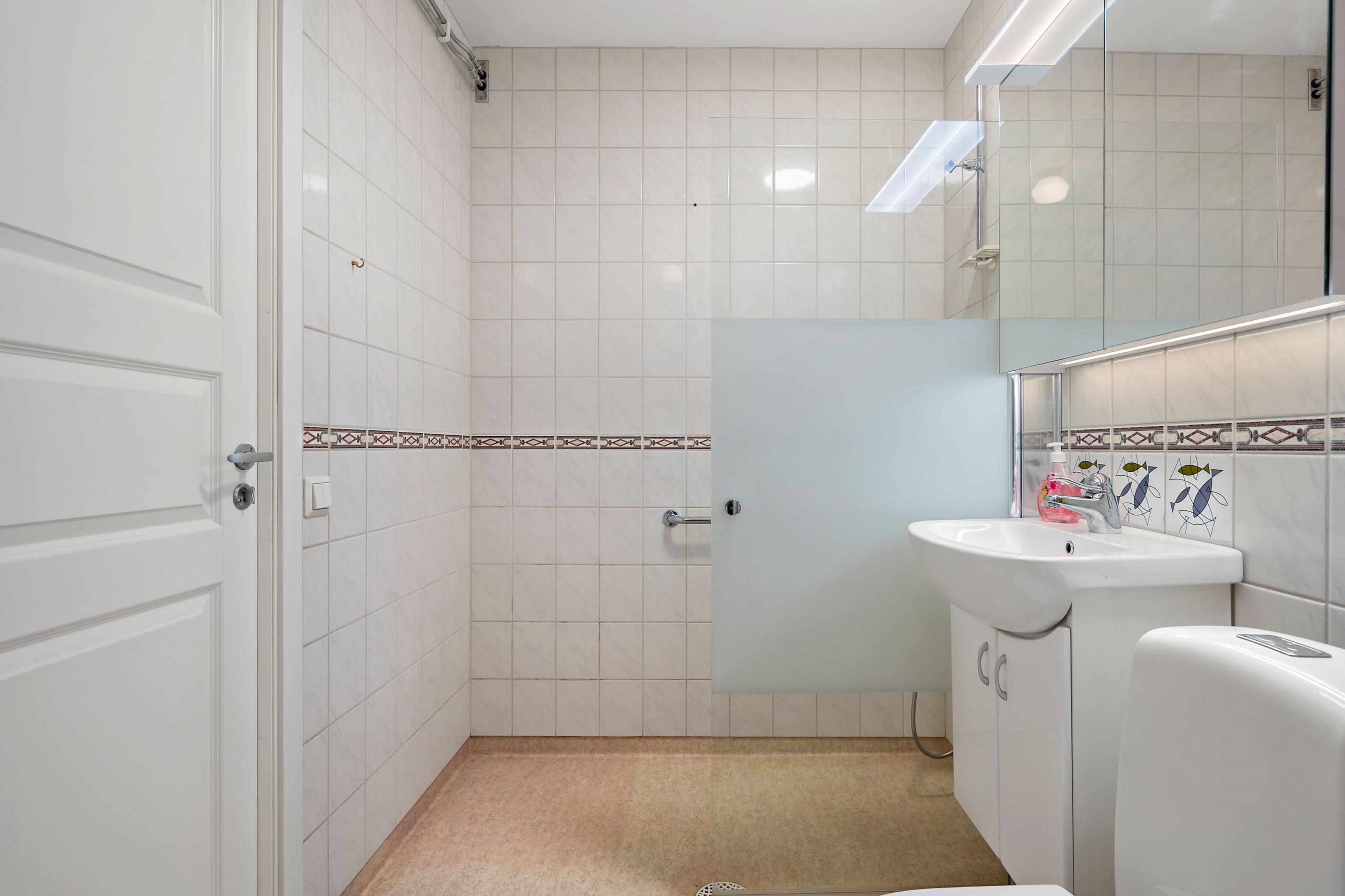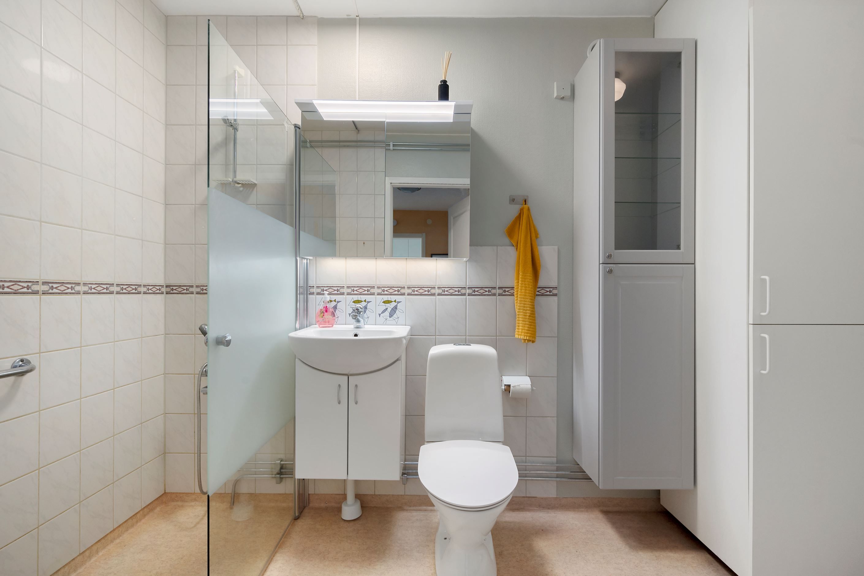 Badrummet är praktiskt utformat med dusch och goda förvaringsmöjligheter. I anslutning finns både klädkammare och garderober som underlättar vardagen.