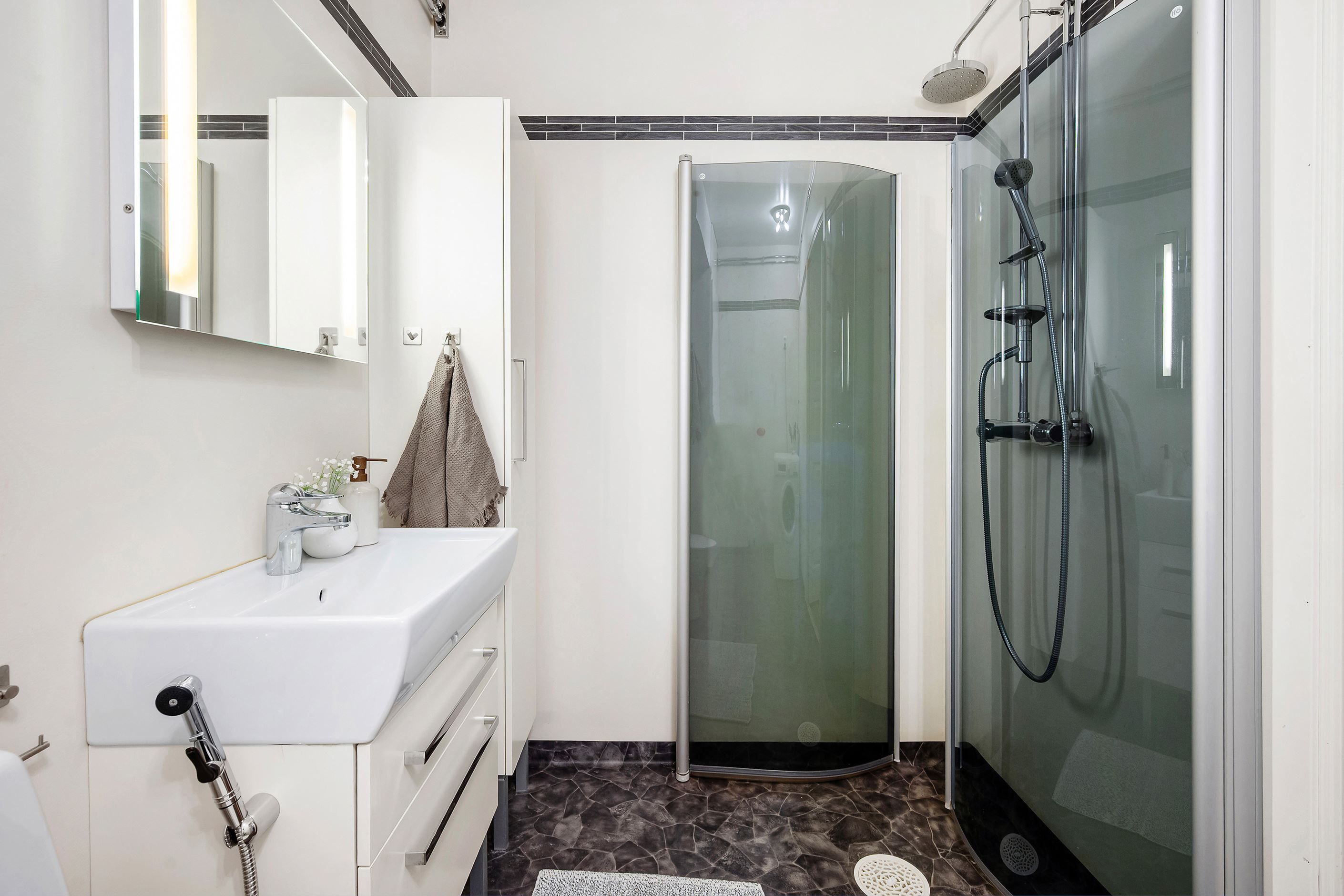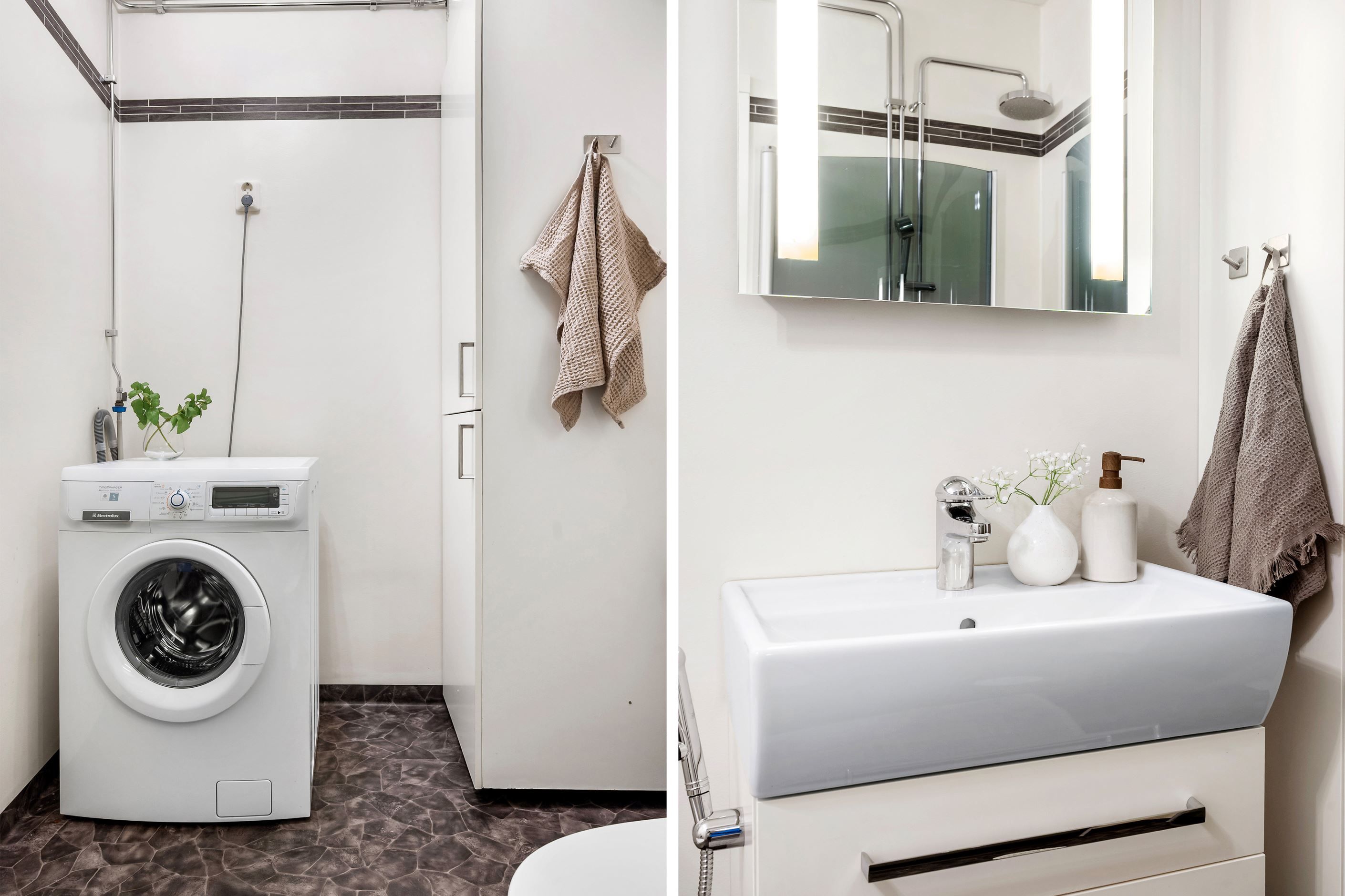 Badrummet är funktionellt utformat med dusch, wc, kommod med förvaring, handdukskåp samt tvättmaskin – ett bekvämt inslag i vardagen.