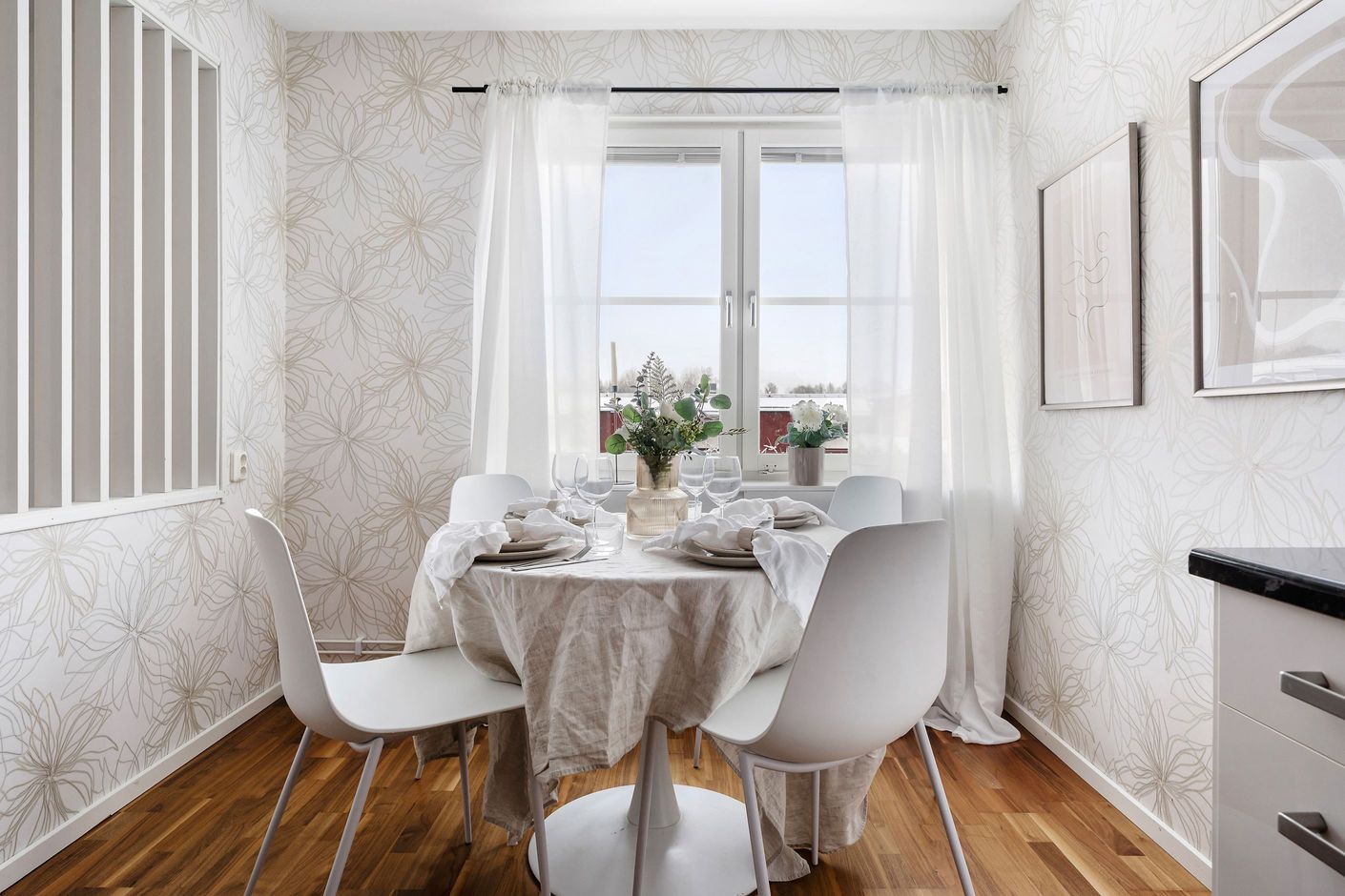 Det rymliga vardagsrummet bjuder in till umgänge och avkoppling, med vita väggar, goda möbleringsmöjligheter och fint ljusinsläpp från fönster och halvglasad altandörr. Härifrån nås den öppna balkongen – en uppskattad plats för morgonkaffet eller ljumma sommarkvällar.