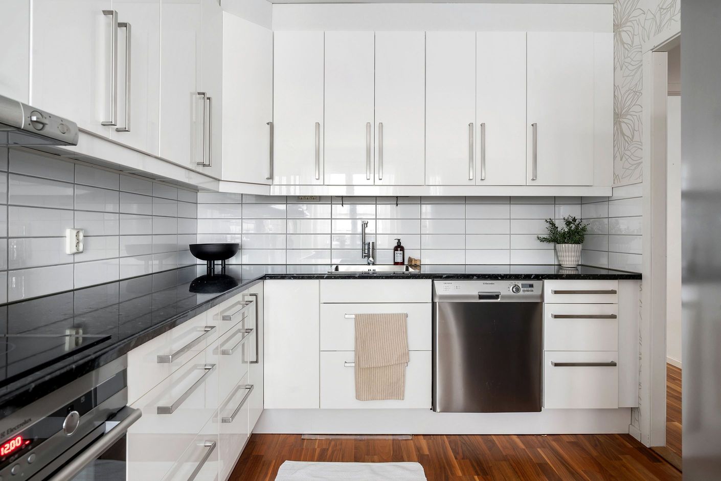 Det stilrena köket går i ljusa toner med vita högglansluckor och svarta arbetsytor som skapar en modern kontrast. Köket är fullt utrustat med fullstor kyl och frys i rostfritt, induktionshäll, ugn, fläkt och diskmaskin. Invid fönsterpartierna finns en naturlig och ljus plats för matgrupp.
