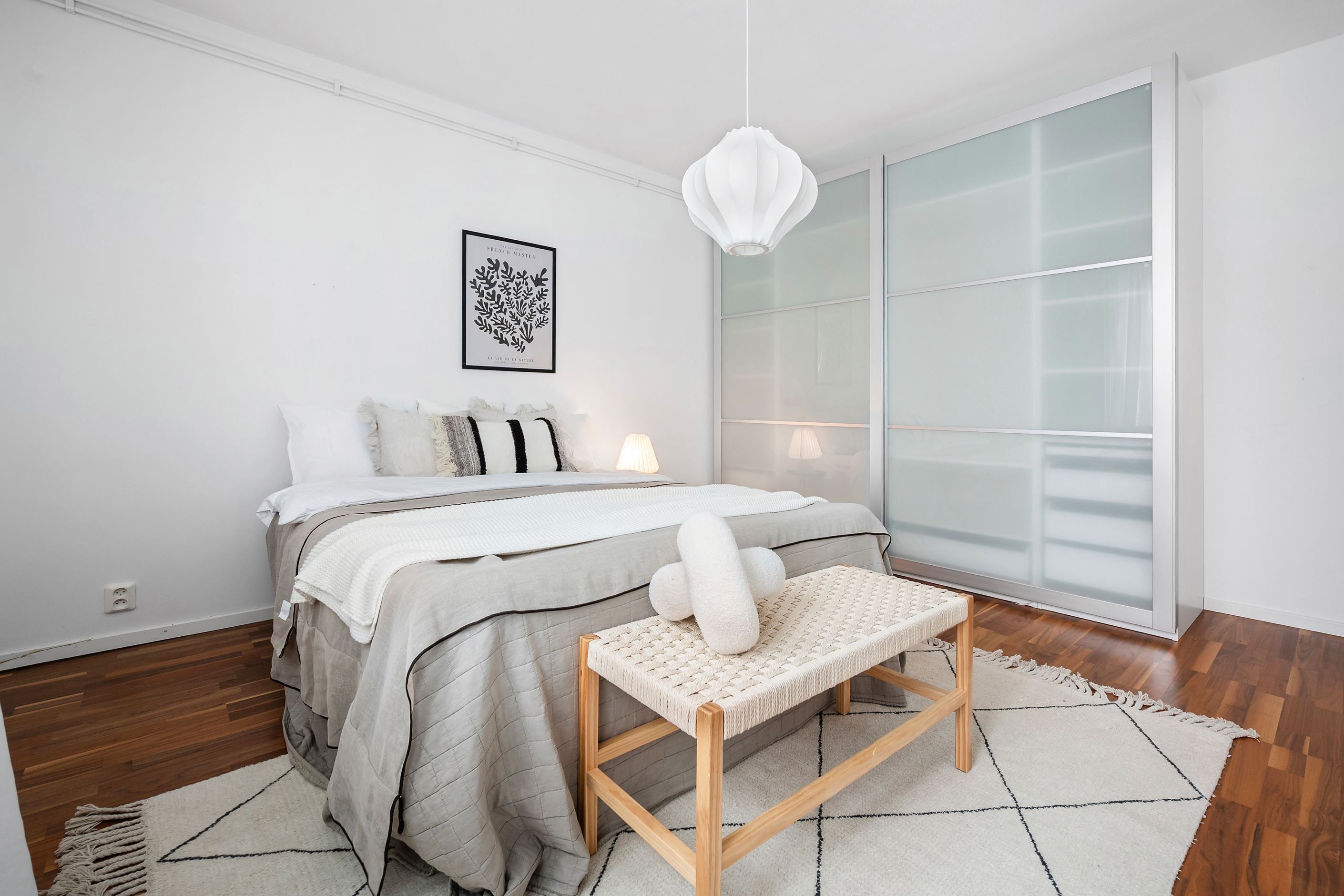 Bostaden rymmer två rogivande sovrum. Huvudsovrummet erbjuder generös förvaring i form av inbyggda garderober med skjutdörrar, medan det andra sovrummet passar utmärkt som barnrum, gästrum eller hemmakontor. Därutöver finns en praktisk klädkammare som ger extra förvaringsutrymme och bidrar till ett ordnat hem.