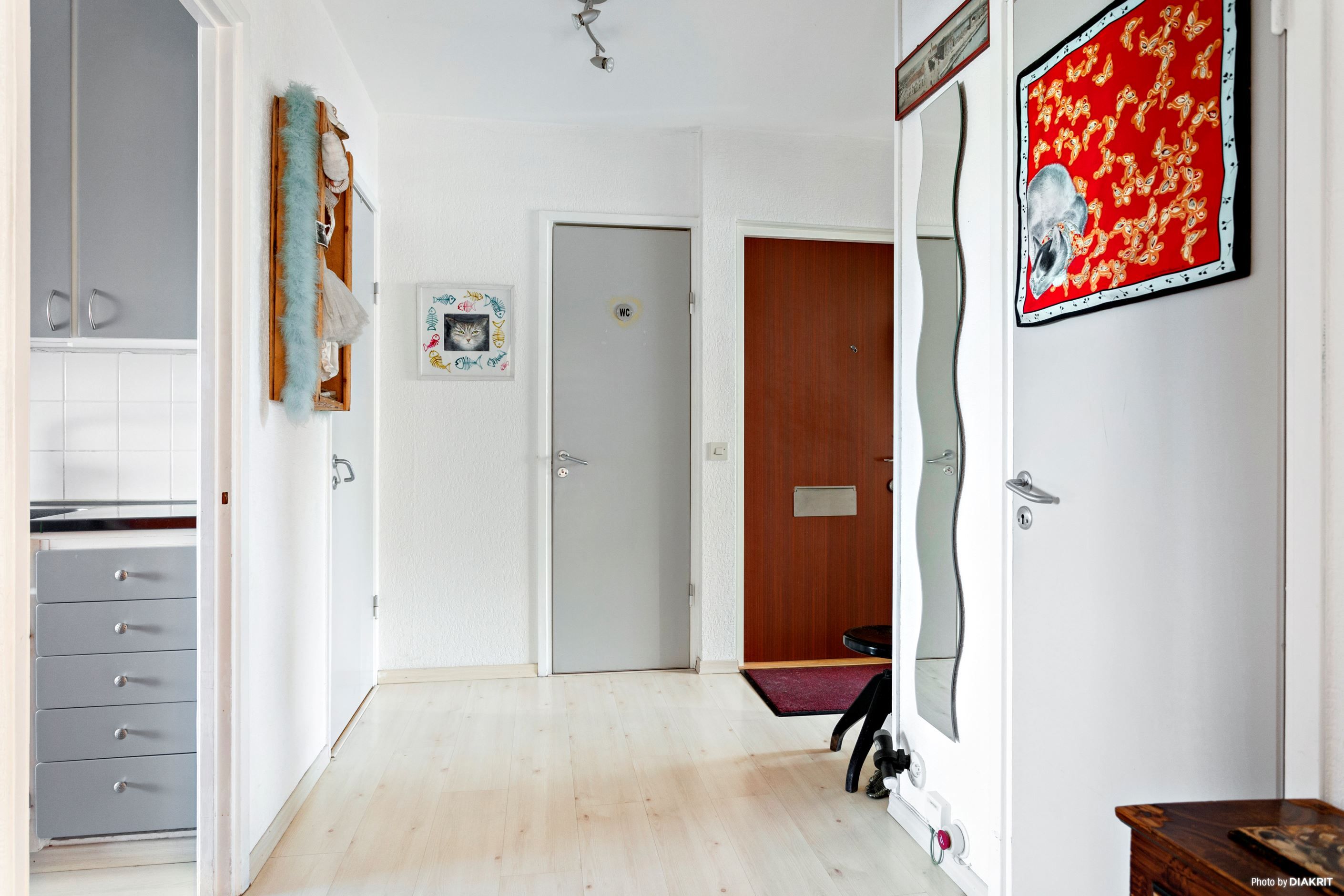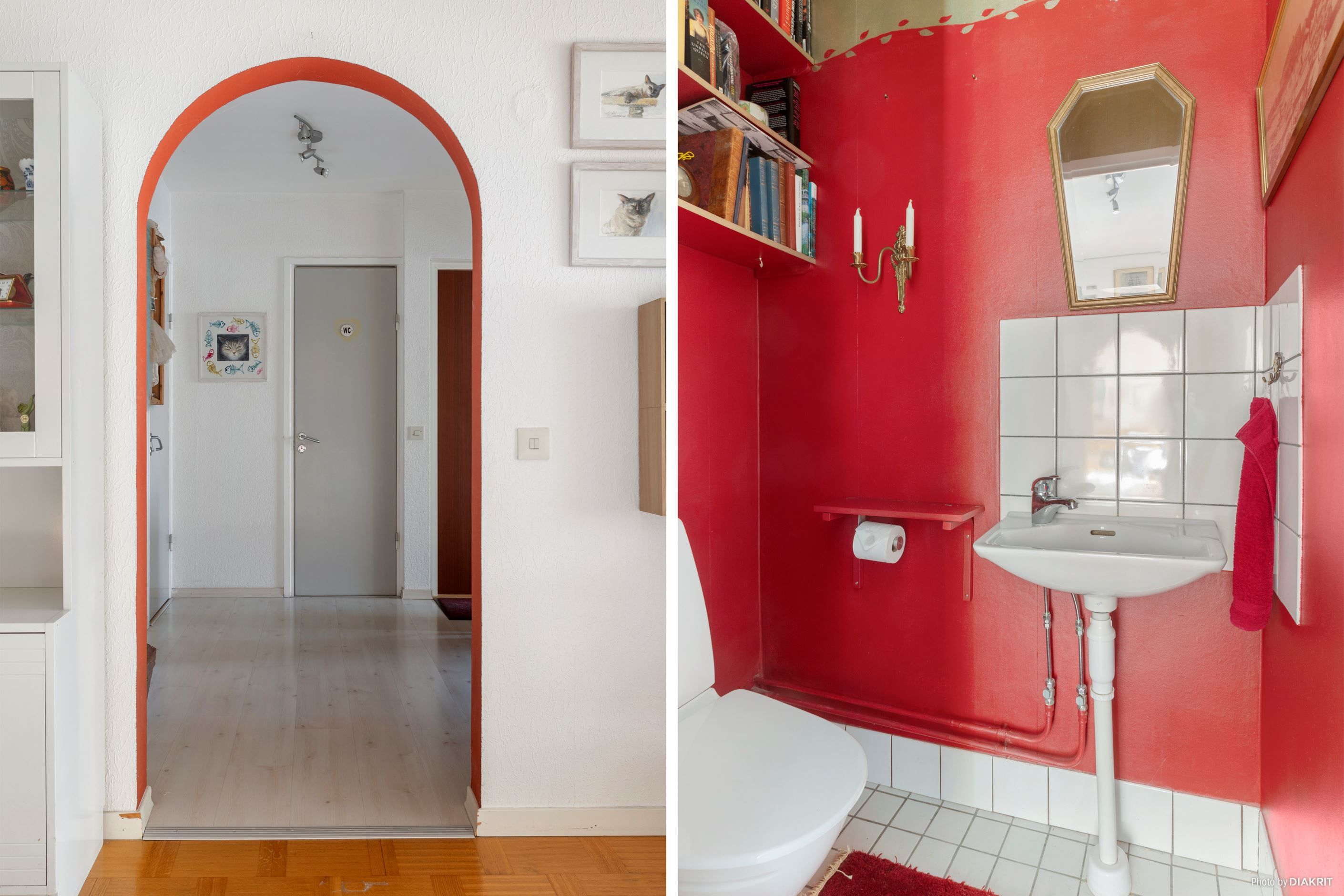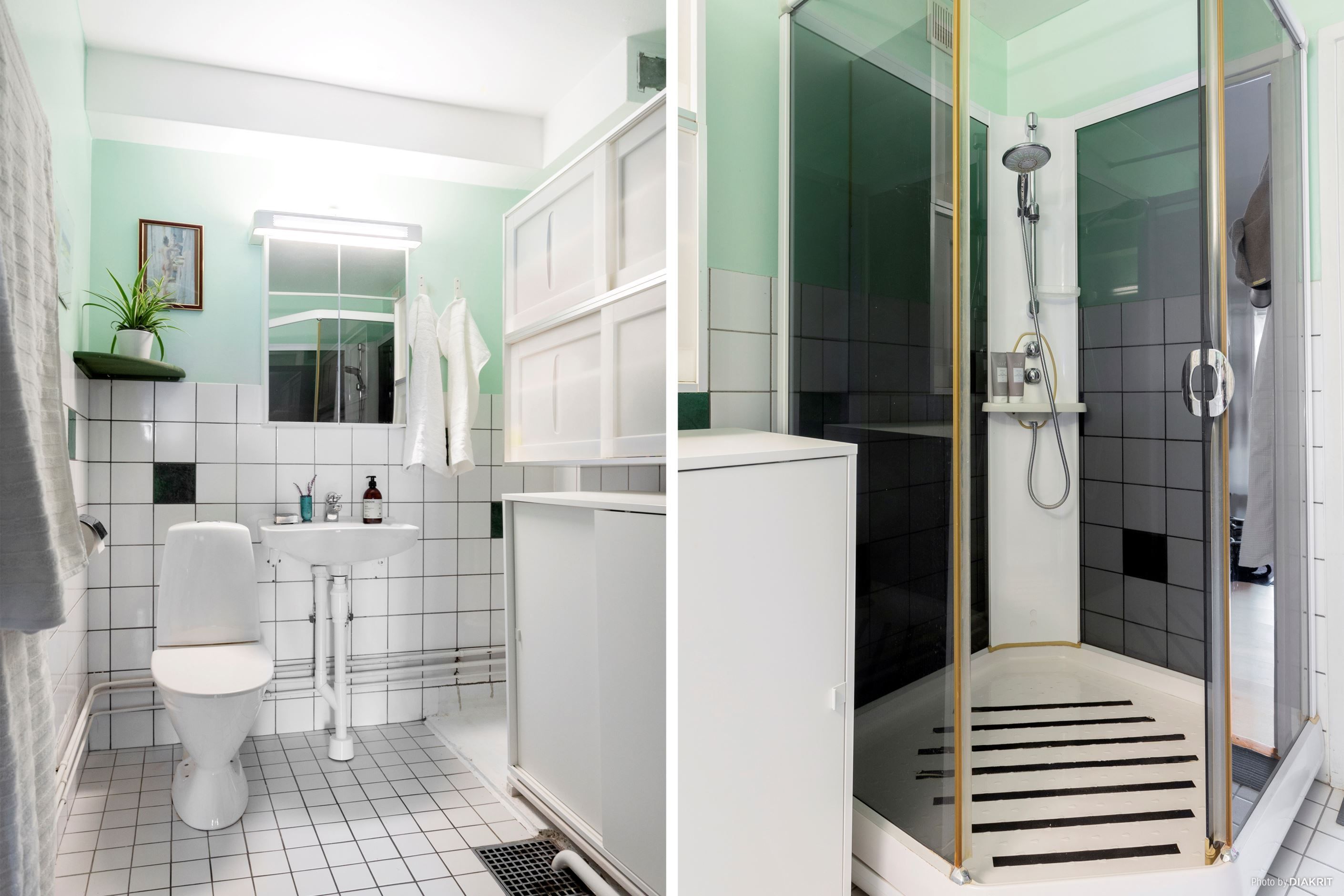 Det rymliga halvkaklade badrummet är utrustat med duschkabin, WC och handfat med kommod. Den välkomnande hallen erbjuder gott om förvaring och bidrar till bostadens praktiska planlösning.
