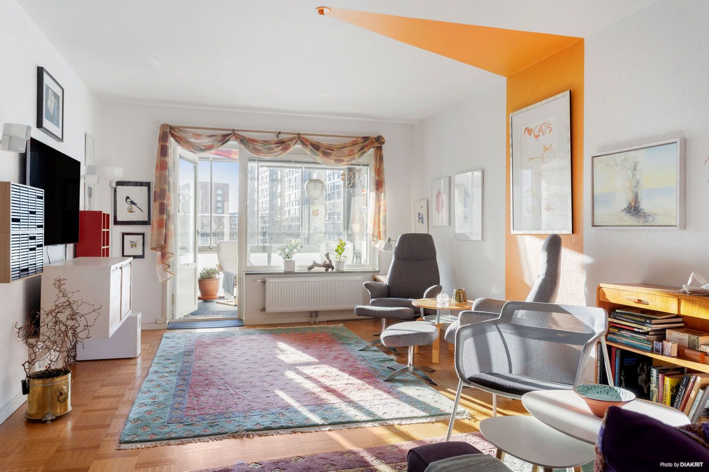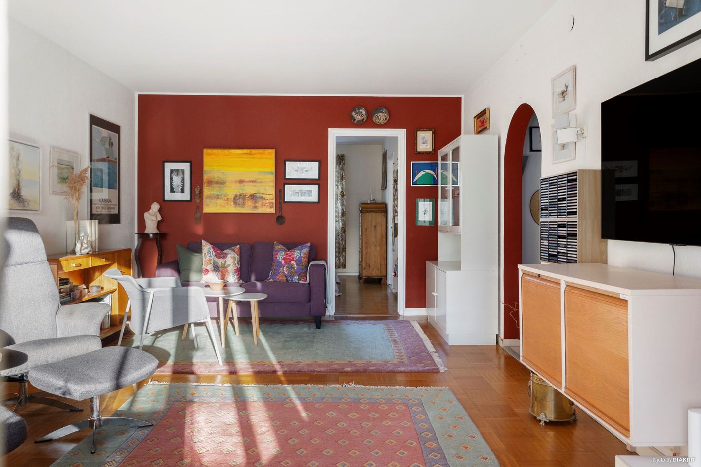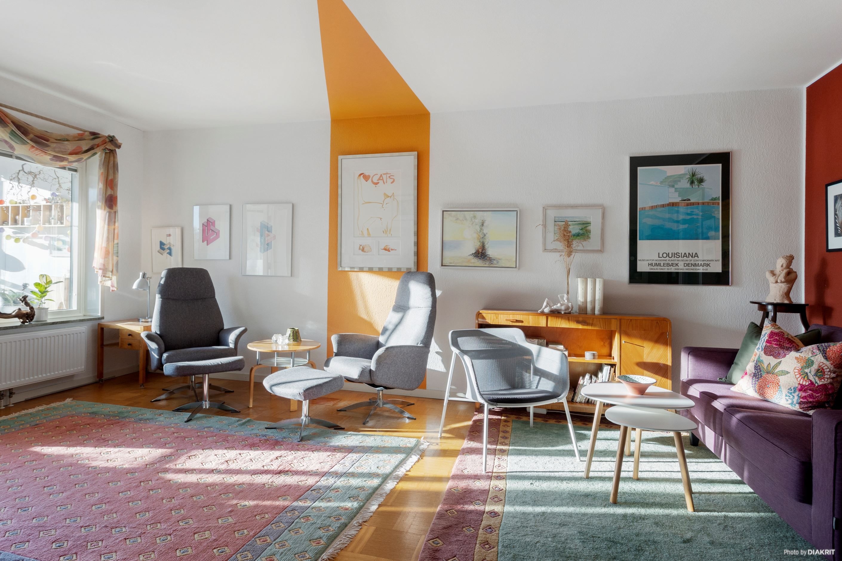 Det stora och ljusa vardagsrummet erbjuder gott om plats för både soffgrupp och matplats. Den vackra stavparketten ger rummet karaktär och härifrån nås den inglasade balkongen som blir ett extra rum och kan användas under större delen av året tack vare skydd mot vind och väder.