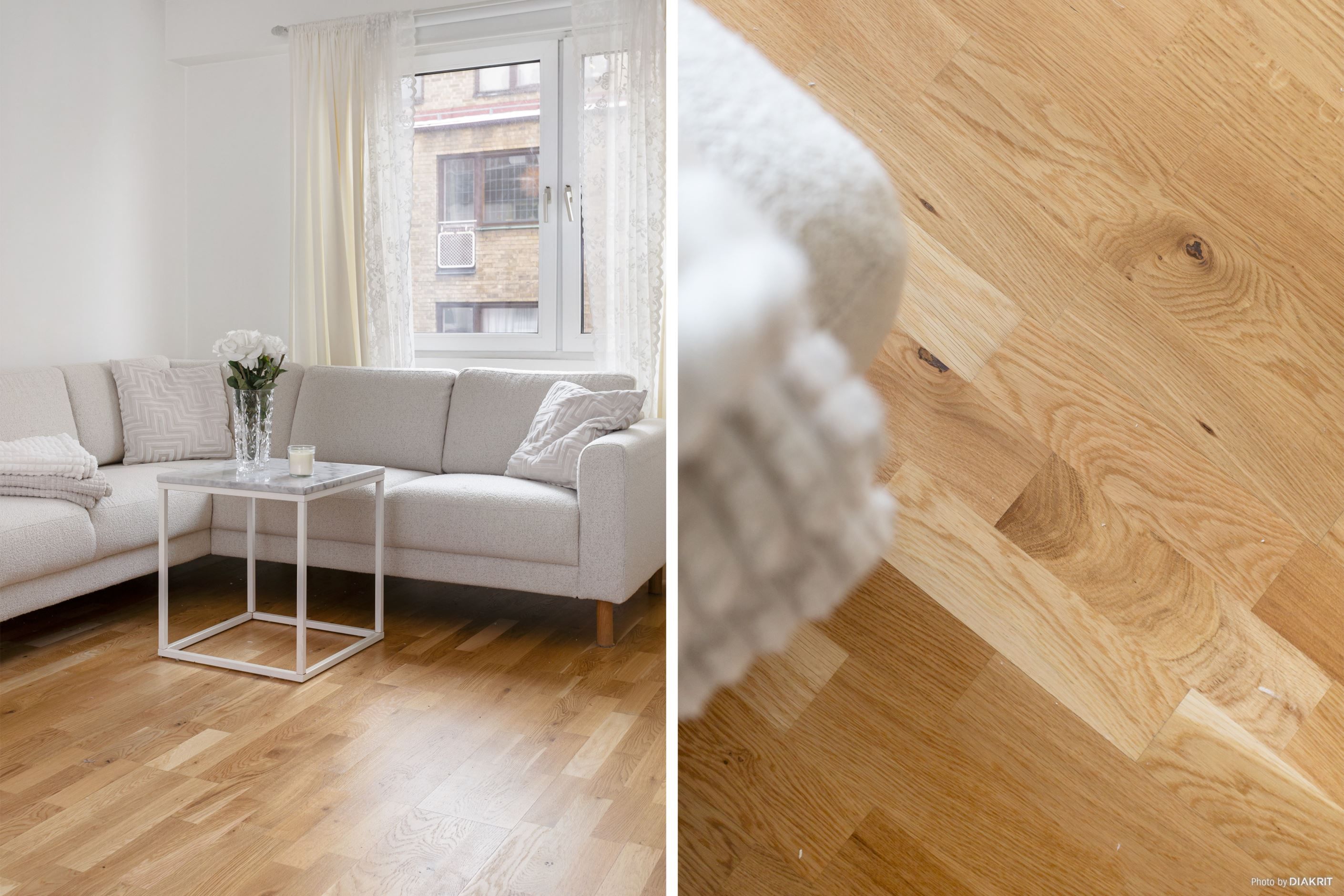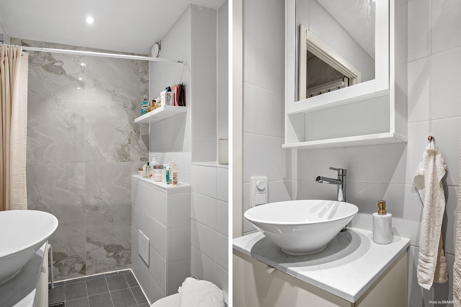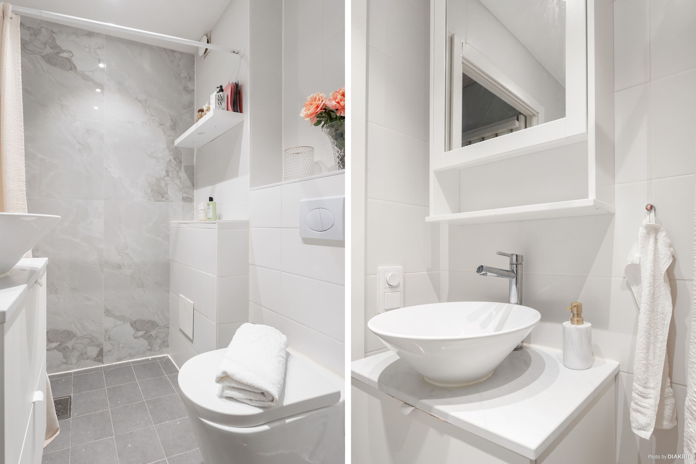 Bostaden erbjuder ett stilrent, renoverat och välutrustat kök samt ett snyggt renoverat badrum med helkaklade väggar och klinkergolv. Här finns genomtänkta materialval som ger en lyxig känsla.