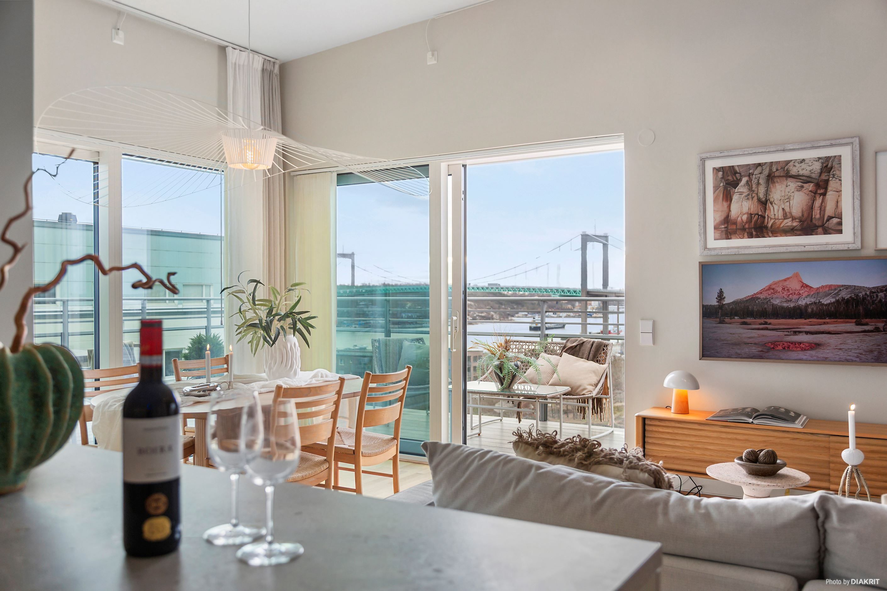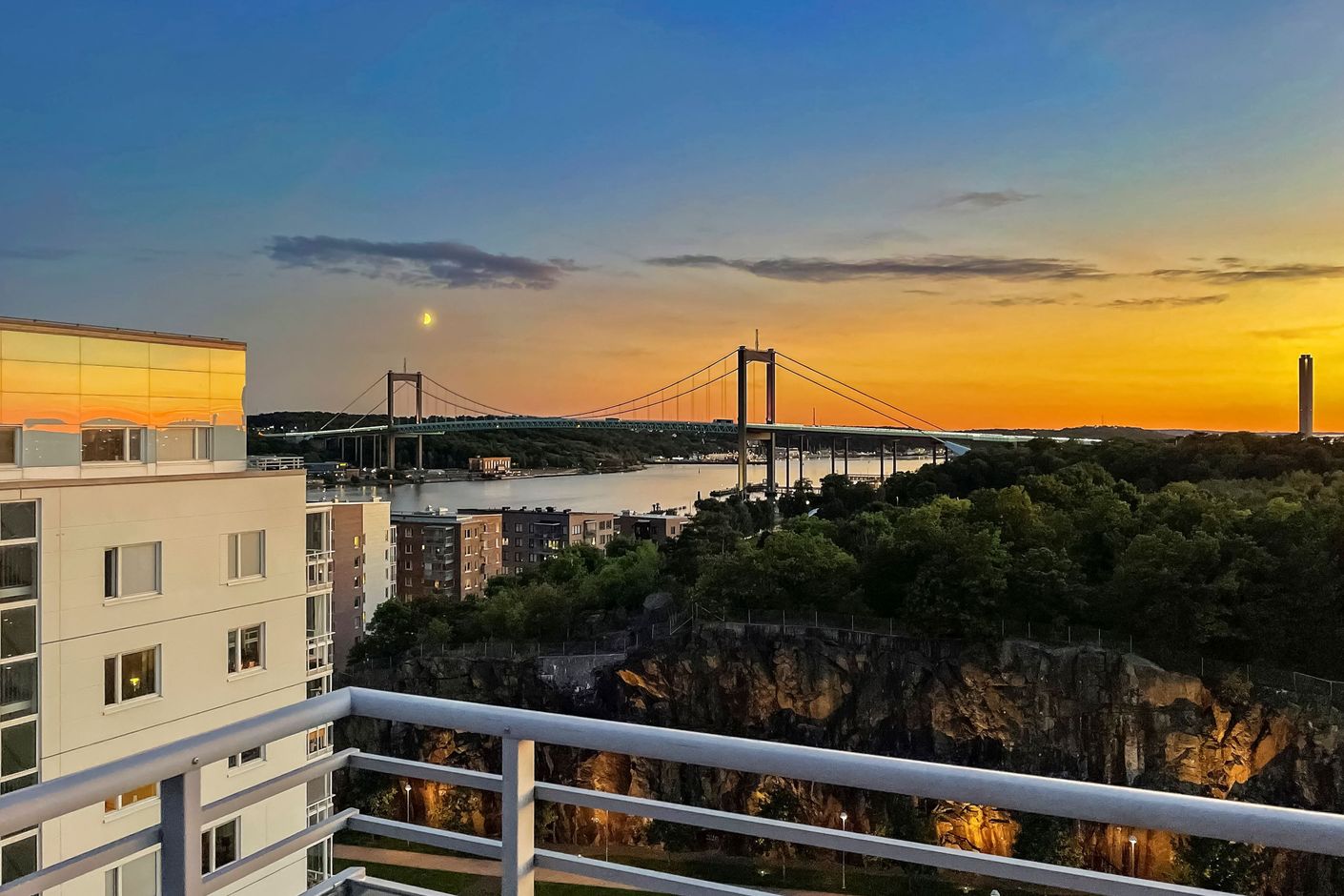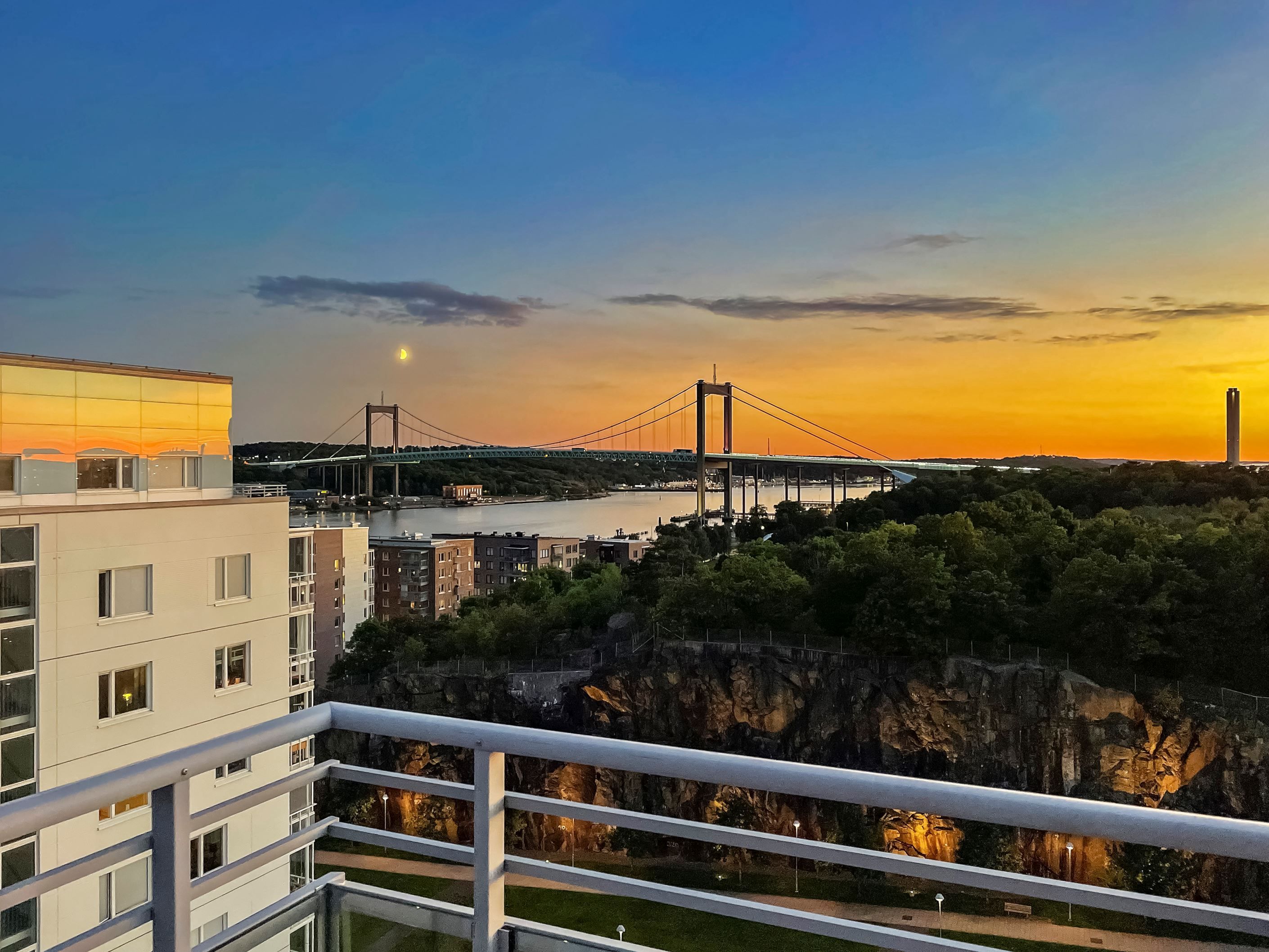 Magisk penthouse bostad med stor terrass åt sydväst om hela 50 kvm. Från terrassen ser man in till Göteborg city och dess skyline, Älven, Älvsborgsbron och naturen i Färjenäsparken är med dig hela tiden. En klar dag kan du även se ut till Vinga fyr. Här ute kan du följa solen hela dagen tills den går ner. Nuvarande ägare har bytt staketet till glas så att vyerna bevaras även när du är inne. Delar av terrassen skulle gå att glasa in men då behöver du prata med styrelsen.