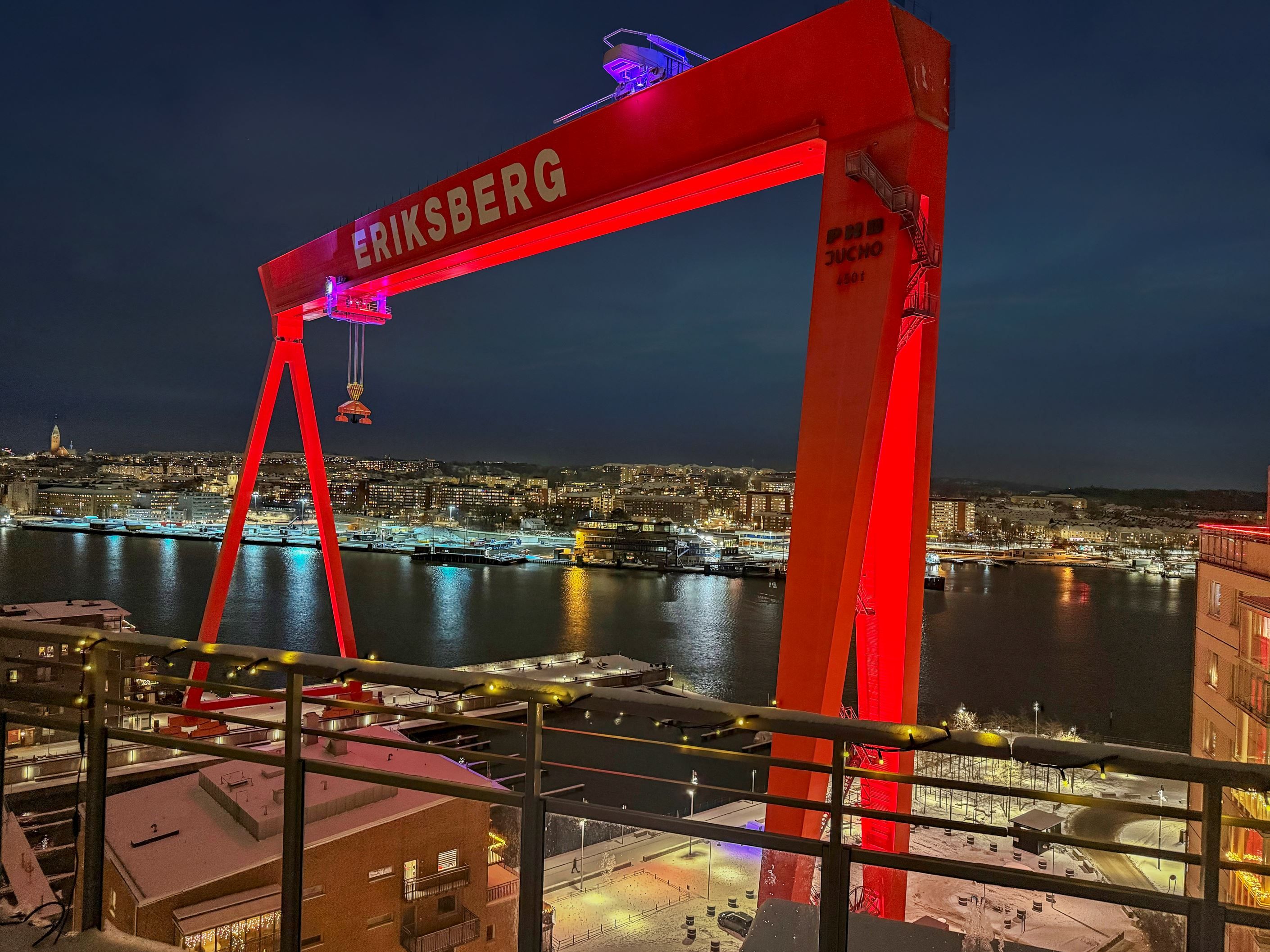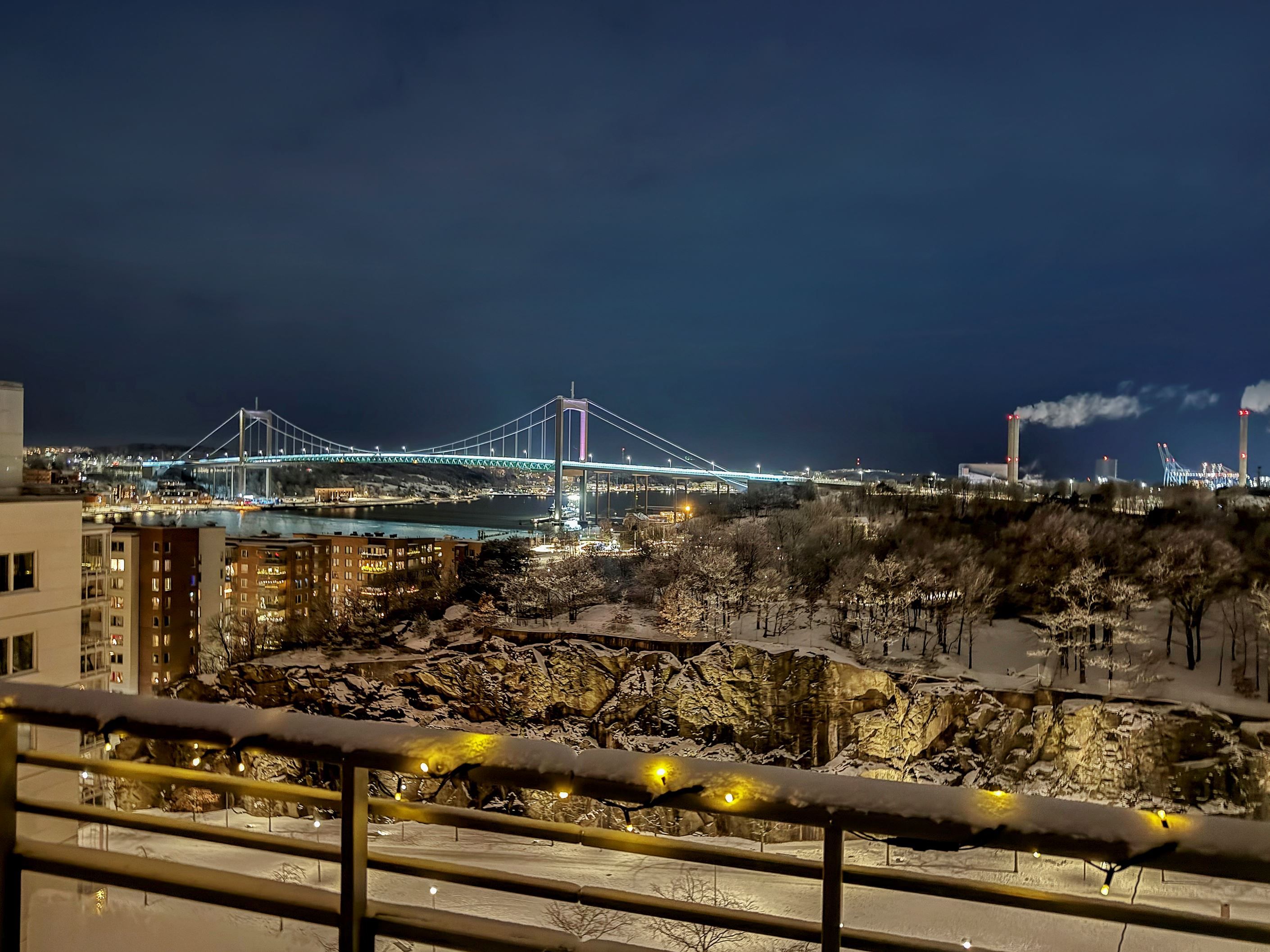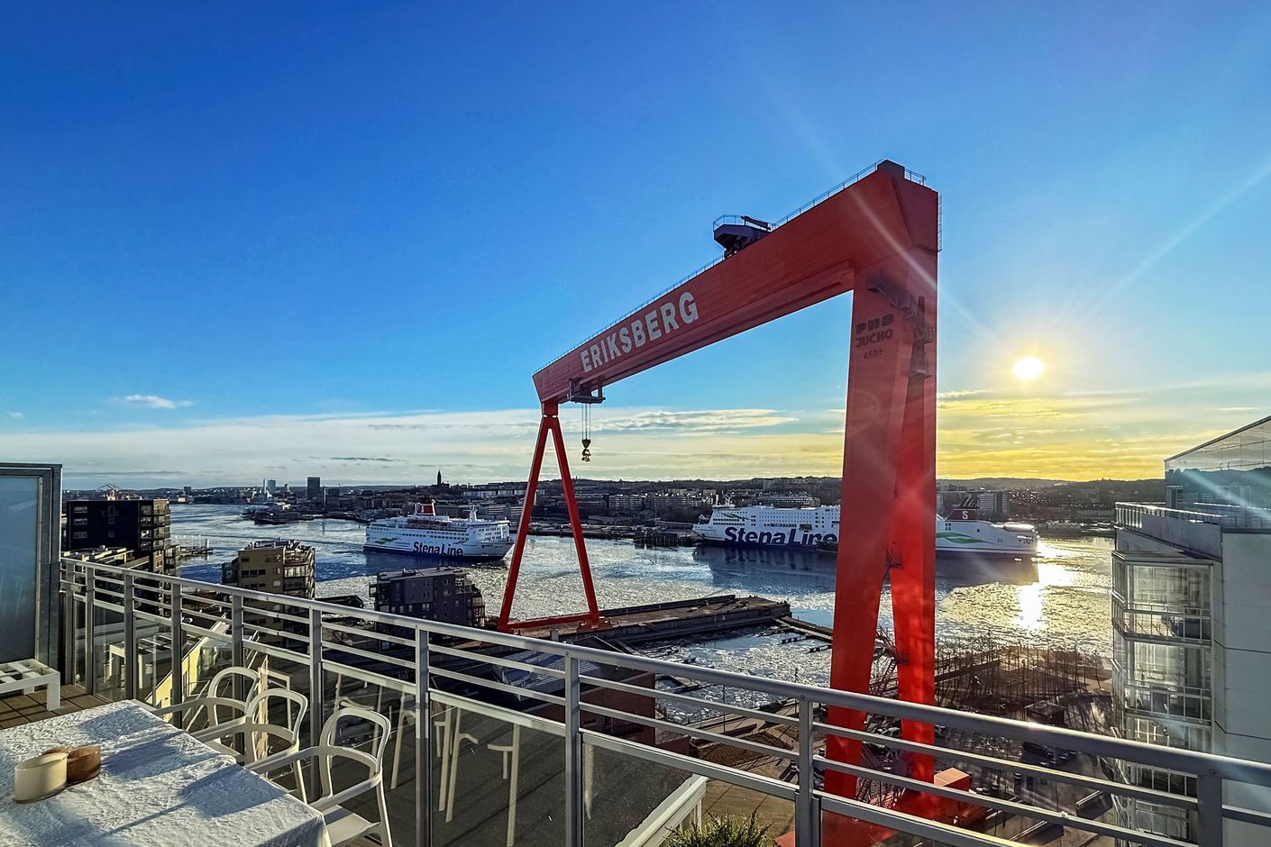 Magisk penthouse bostad med stor terrass åt sydväst om hela 50 kvm. Från terrassen ser man in till Göteborg city och dess skyline, Älven, Älvsborgsbron och naturen i Färjenäsparken är med dig hela tiden. En klar dag kan du även se ut till Vinga fyr. Här ute kan du följa solen hela dagen tills den går ner. Nuvarande ägare har bytt staketet till glas så att vyerna bevaras även när du är inne. Delar av terrassen skulle gå att glasa in men då behöver du prata med styrelsen.