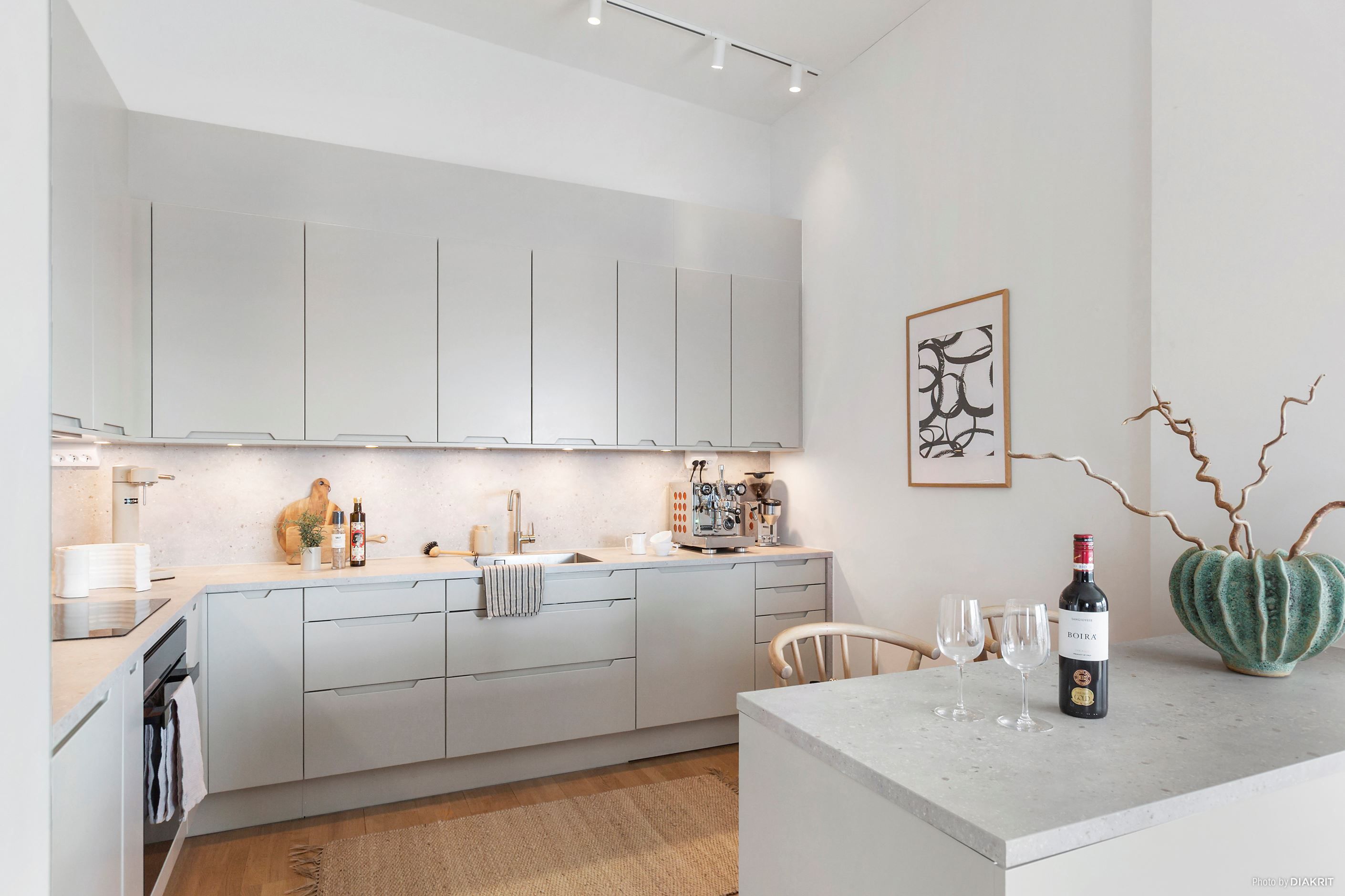 Köket från HTH är läckert renoverat i en trendig kulör där även maskinparken är nybytt. Här har även en go köksö med magisk utsikt installerats. En given plats att hänga på medans maten tillreds eller när frukosten ska ner i farten.