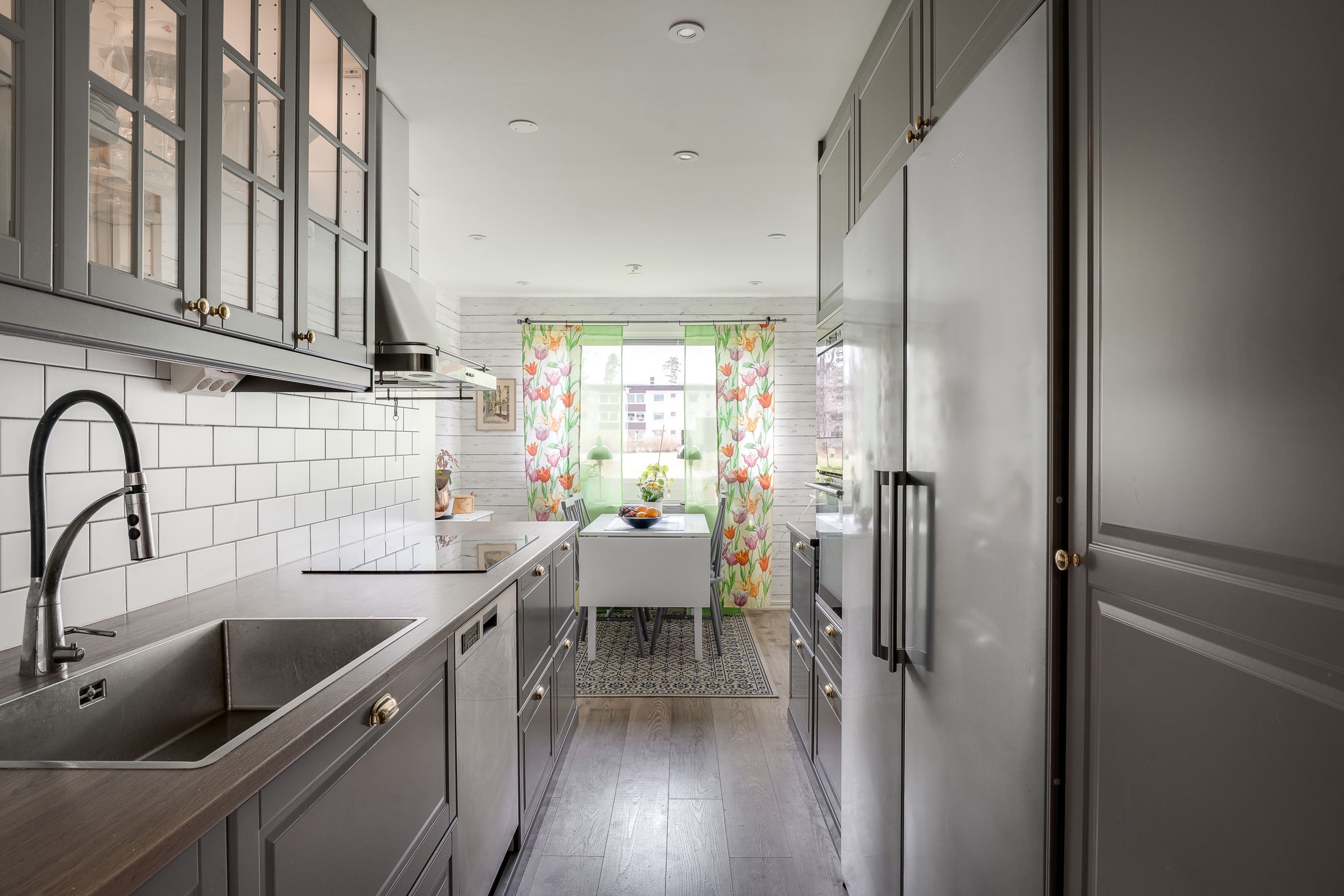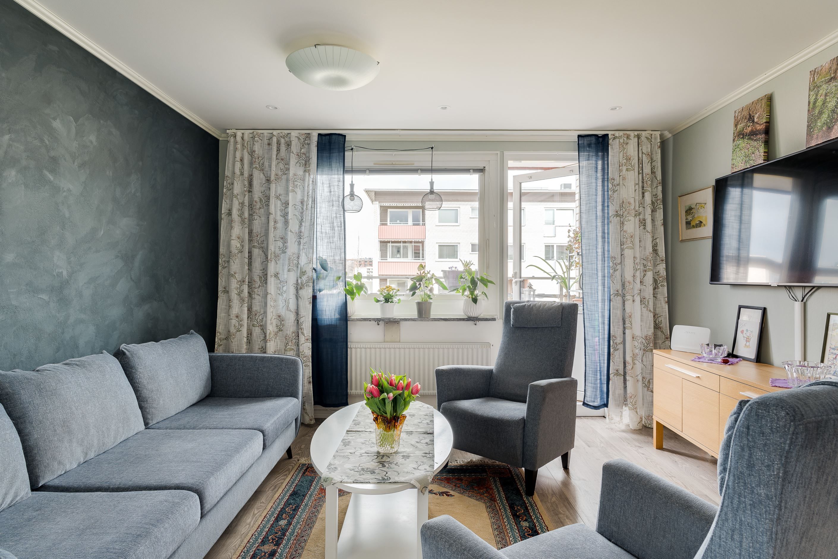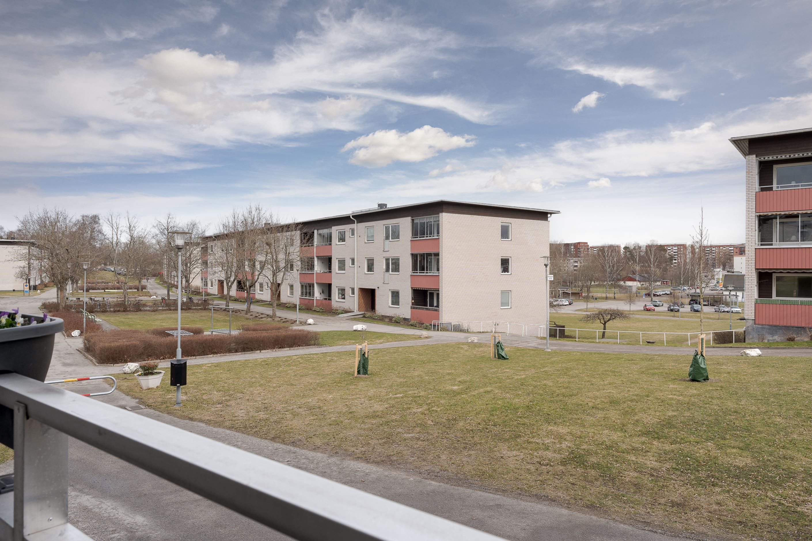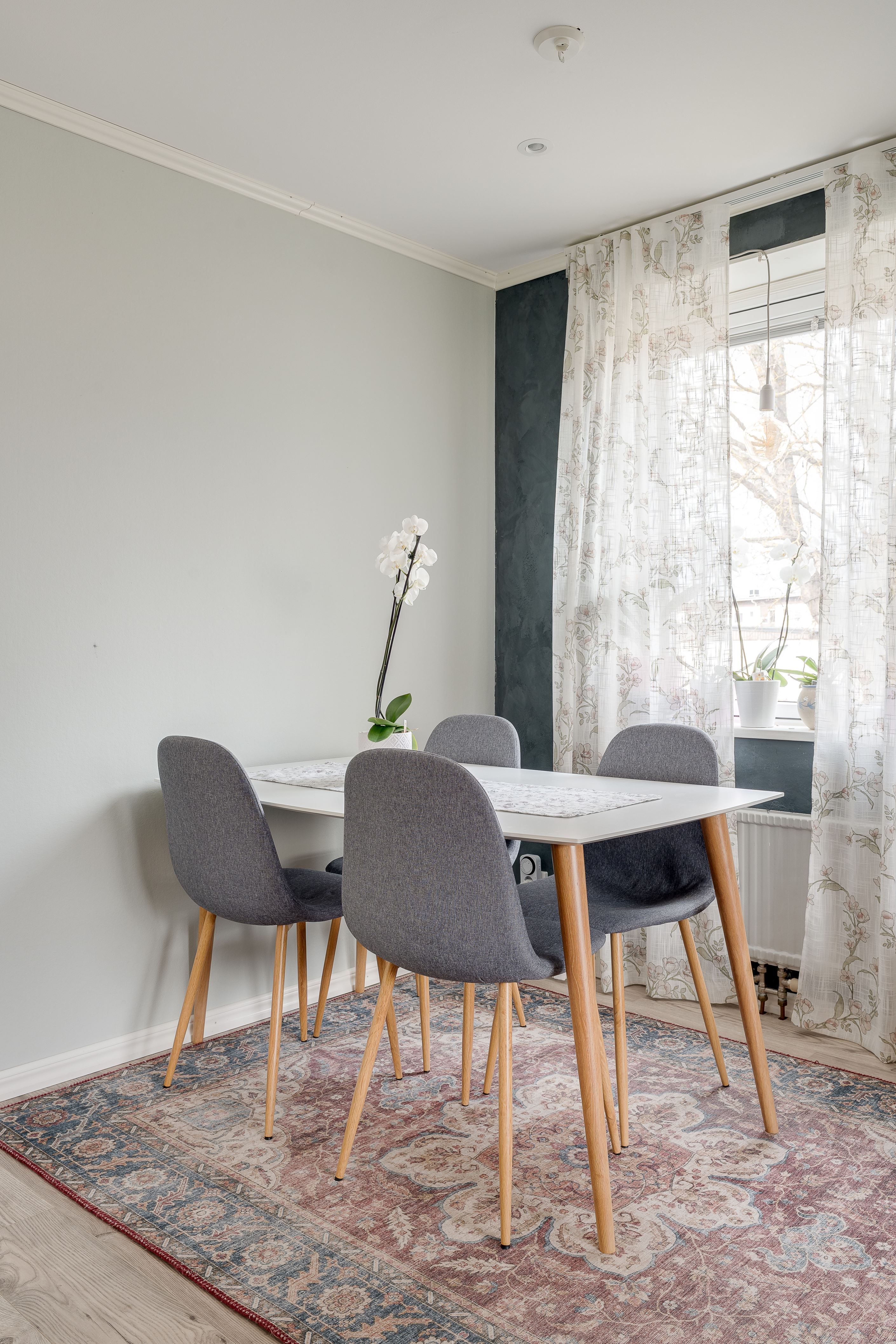 Bostaden erbjuder ett renoverat kök med bra arbetsytor och förvaring. Vardagsrummet har gott om plats för både soffgrupp och matplats, och de stora fönsterpartierna ger ett naturligt ljusflöde.