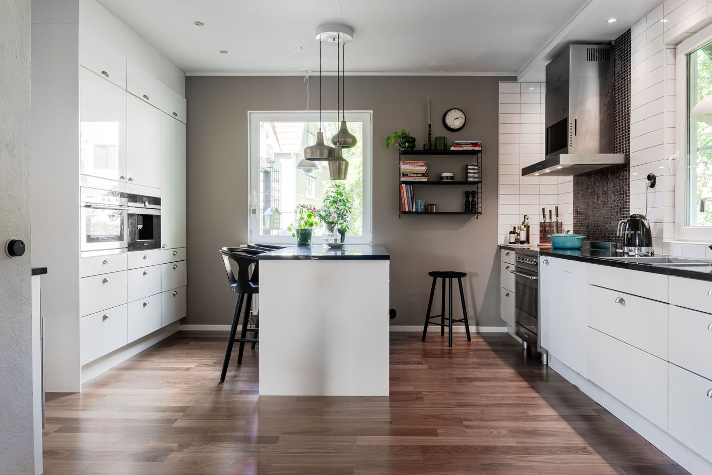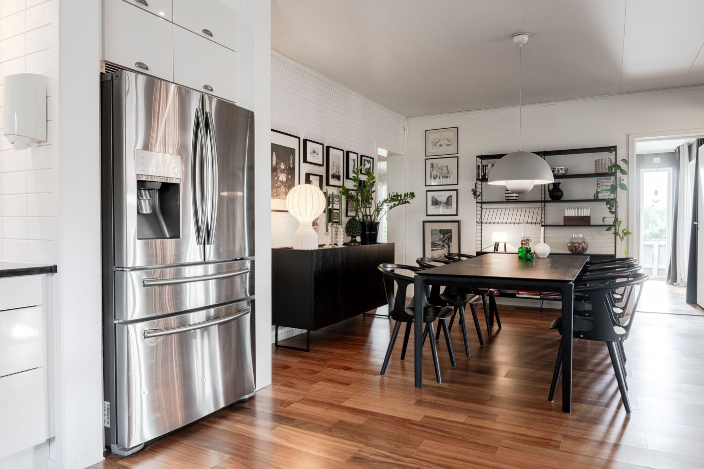 Väl tilltagna sällskapsytor skapar förutsättningar för alla typer av sociala tillställningar utan risk för trängsel. Sobra färgval och parkettgolv i kombination med öppen planlösning mellan kök, vardags-och matrum gör det särskilt enkelt att trivas. Från vardagsrummet nås uteplatsen som ligger i direkt söderläge!