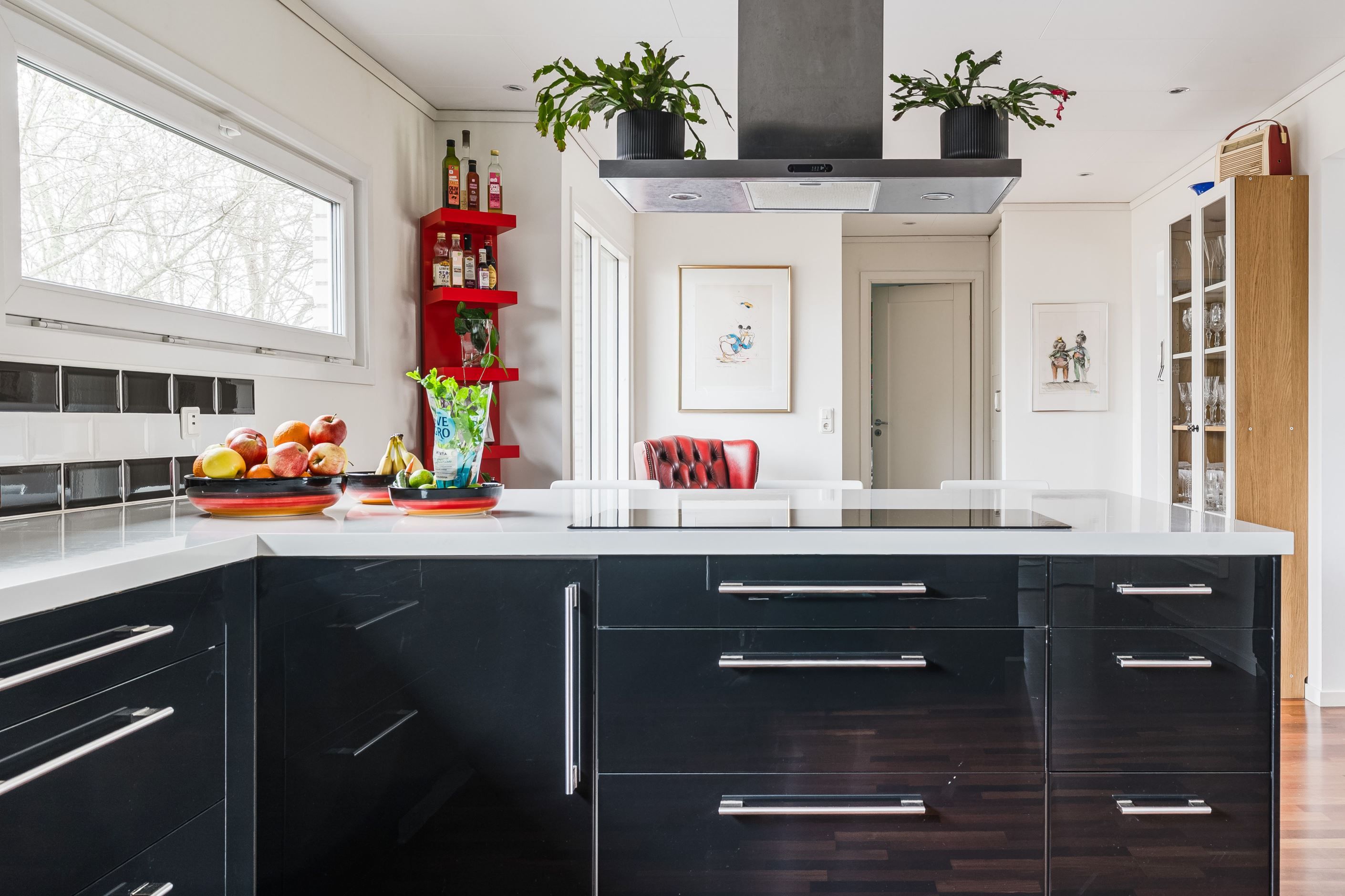 Villan präglas av en modernistisk arkitektur med platt tak och stora, liggande fönsterpartier som släpper in rikligt med ljus från alla väderstreck. Planlösningen är öppen och väl genomtänkt, med sex rum och kök som rymmer både familjeliv och sociala tillställningar. De generösa ytorna, det väl tilltagna köket i kombination med trägolv och stilrena ytor skapar en inbjudande och personlig atmosfär. Här finns också en vacker öppen spis som bidrar med både värme och hemtrevnad under årets kallare månader.