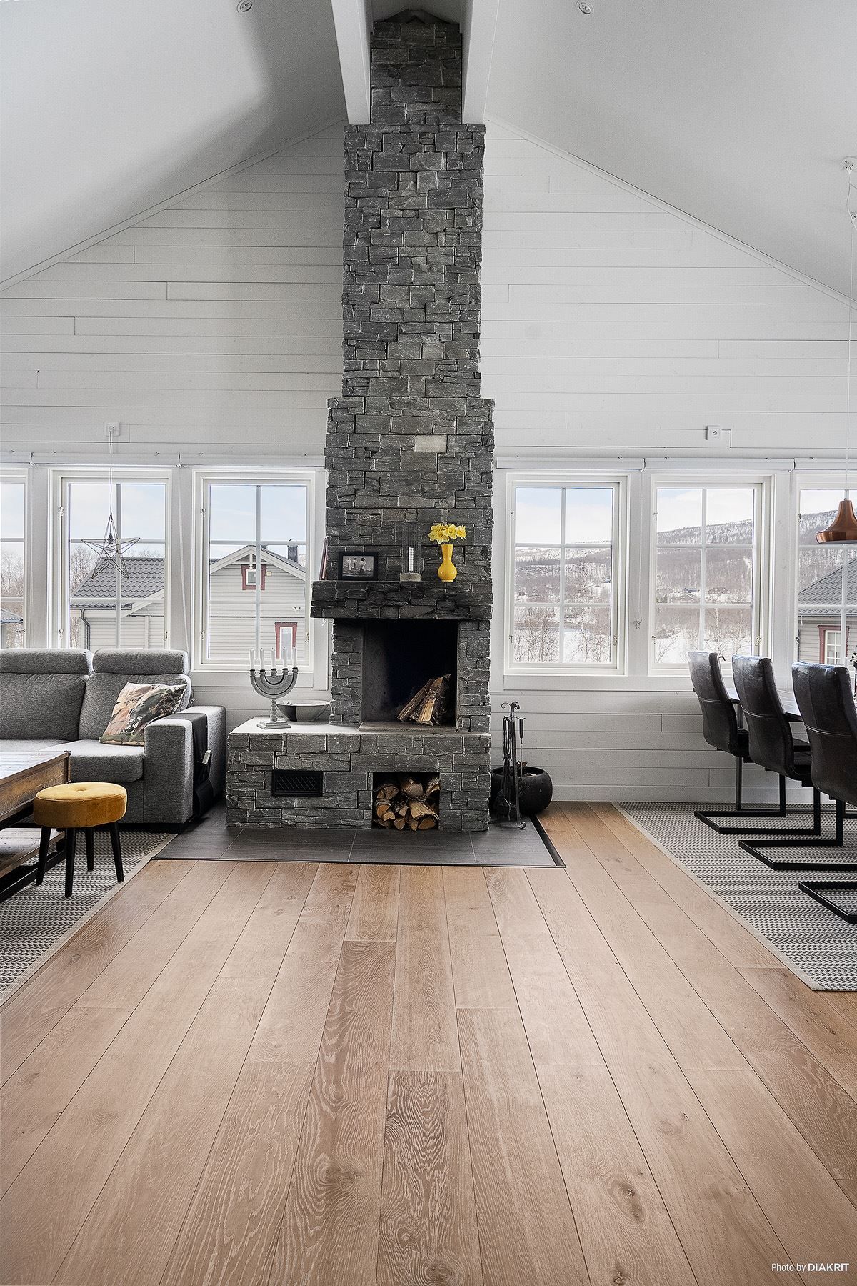 Huset är minutiöst planerat för att kombinera funktion och estetik i varje detalj. Hjärtat i hemmet är det generösa allrummet med ryggåstak och en imponerande öppen spis i murad natursten som sträcker sig hela vägen upp till taknocken – ett verkligt smycke i rummet. Ljuset flödar in från fönster i tre väderstreck och skapar en öppen och trivsam känsla som förstärks av materialvalen: parkettgolv, vitmålad träpanel och en vägg i brunbetsad panel. I öppen anslutning ligger det välutrustade köket med rostfria vitvaror, två arbetsbänkar – varav en helt i rostfritt med dubbla diskhoar – och en bardisk som avgränsar mot sällskapsdelen.