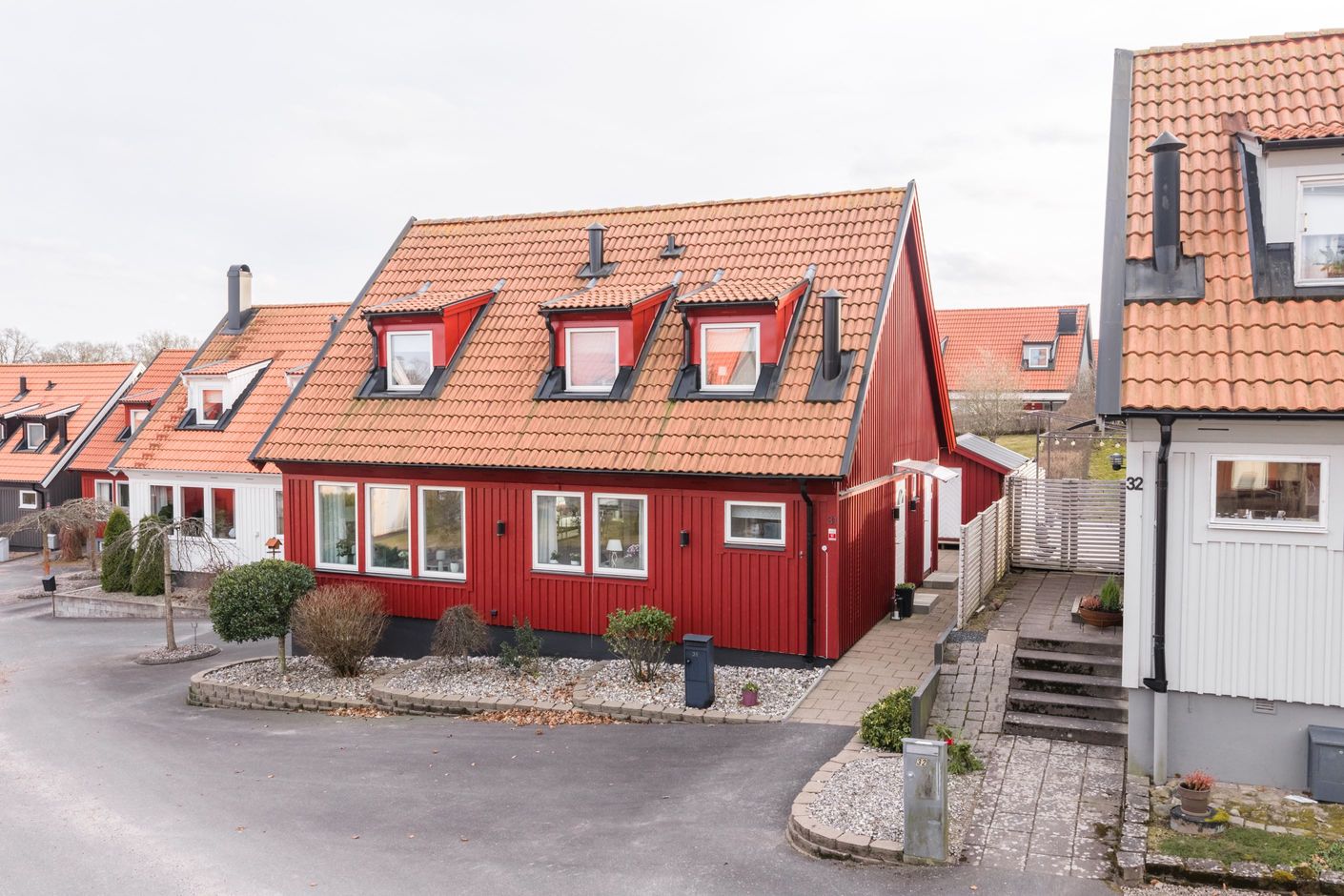 Övre plan nås via en stabil trappa med klädda trappsteg och stålräcken. Övervåningen rymmer tre rymliga sovrum samt badrum, vilket ger en avskild och privat sovrumsdel. I källarplanet finns ytterligare generösa ytor med gillestuga, ett extra sovrum eller hobbyrum, tvättstuga samt bastu med dusch och WC. Tvättstugan är utrustad med tvättmaskin och torktumlare som installerades 2023. Här finns även mycket goda förvaringsmöjligheter i flera förråd, något som underlättar vardagen.