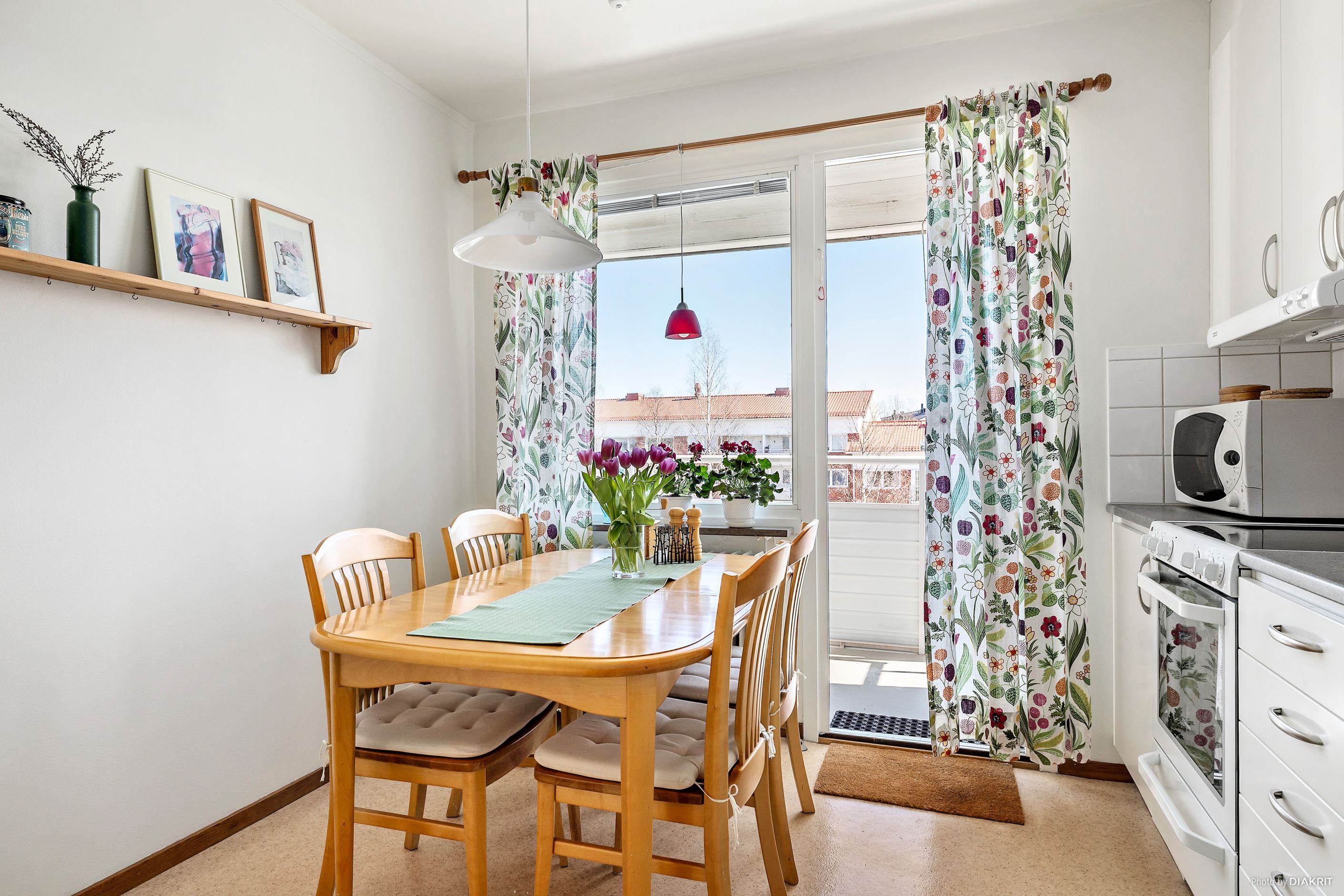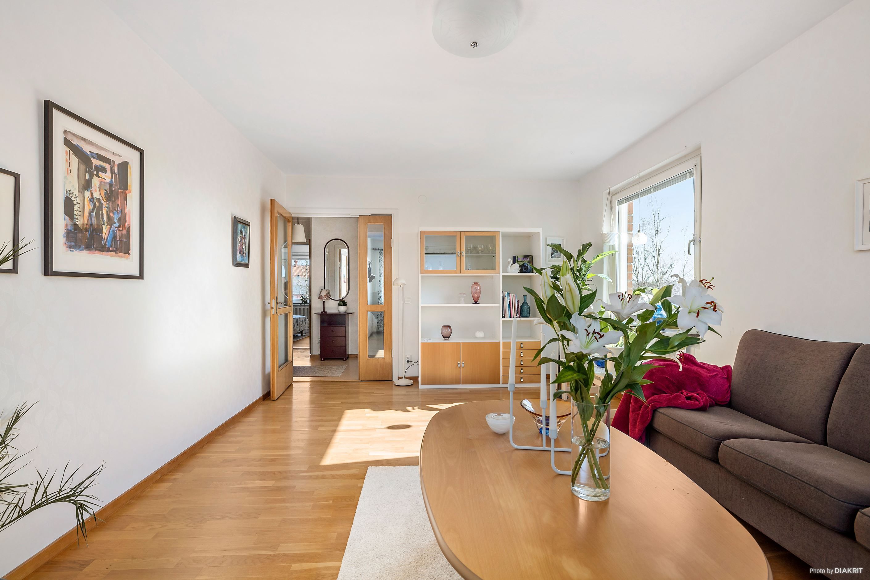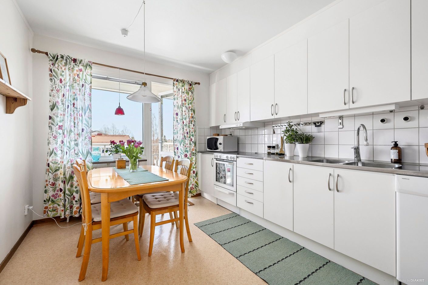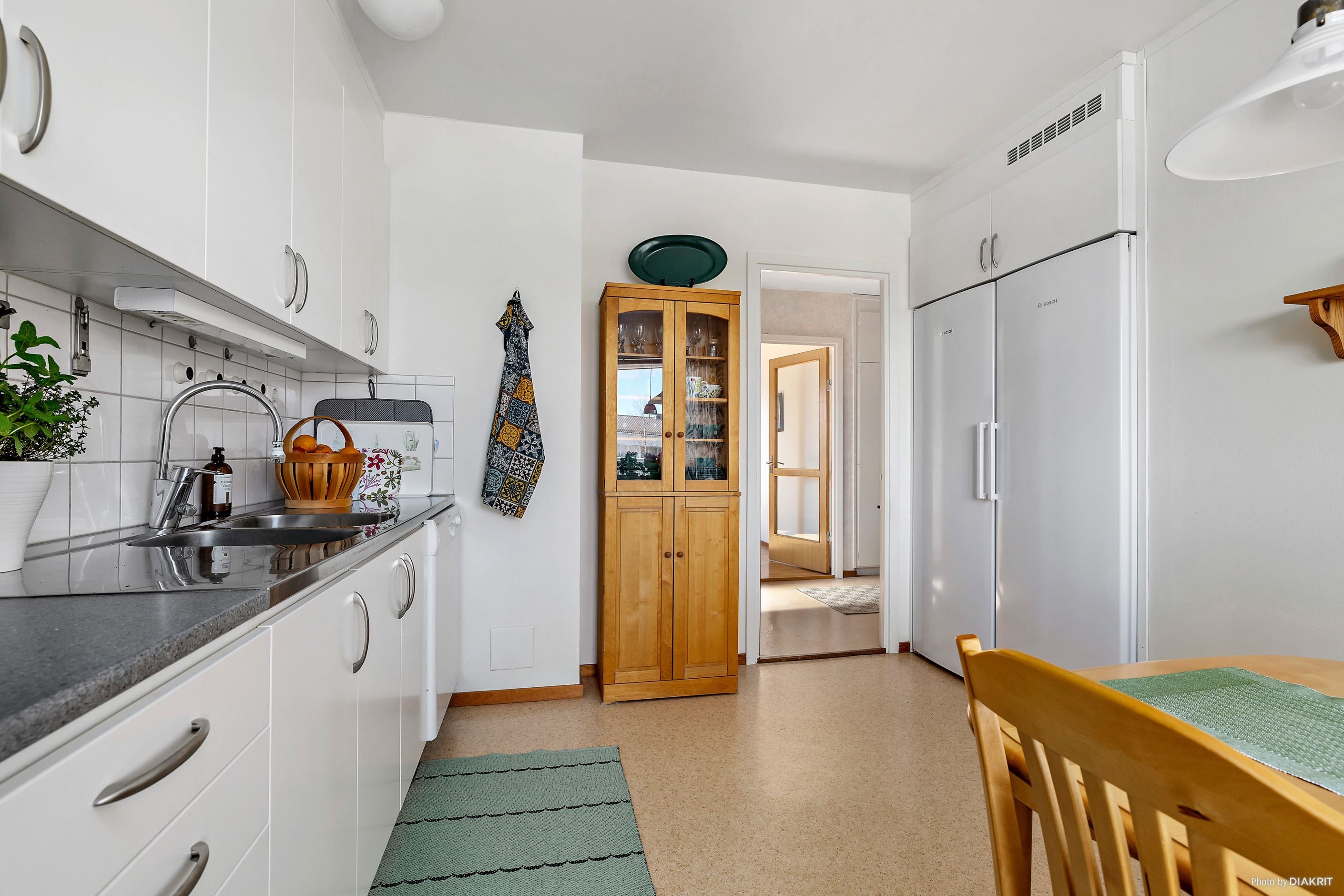 Köket är rymligt och stilrent med vita luckor och vitt kakel, och erbjuder gott om plats för matgrupp. Den maskinella utrustningen består av spis, kyl, frys samt diskmaskin. Härifrån nås även balkongen med utsikt över innergården. Vidare har bostaden ett rymligt vardagsrum med lättmöblerade ytor och fönster i två väderstreck, vilket ger ett härligt ljusflöde. Här finns gott om plats för både soffgrupp och övrigt möblemang.