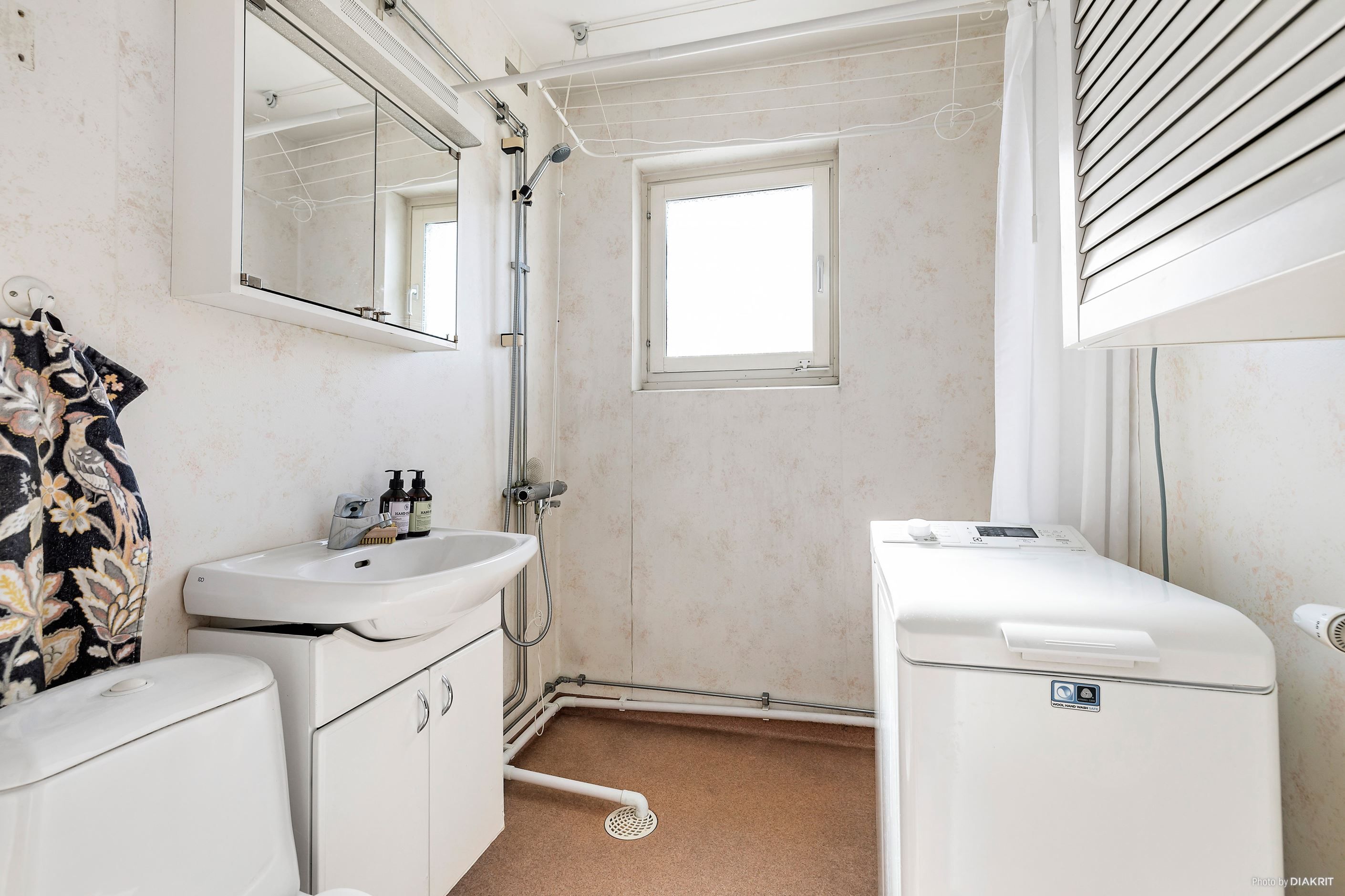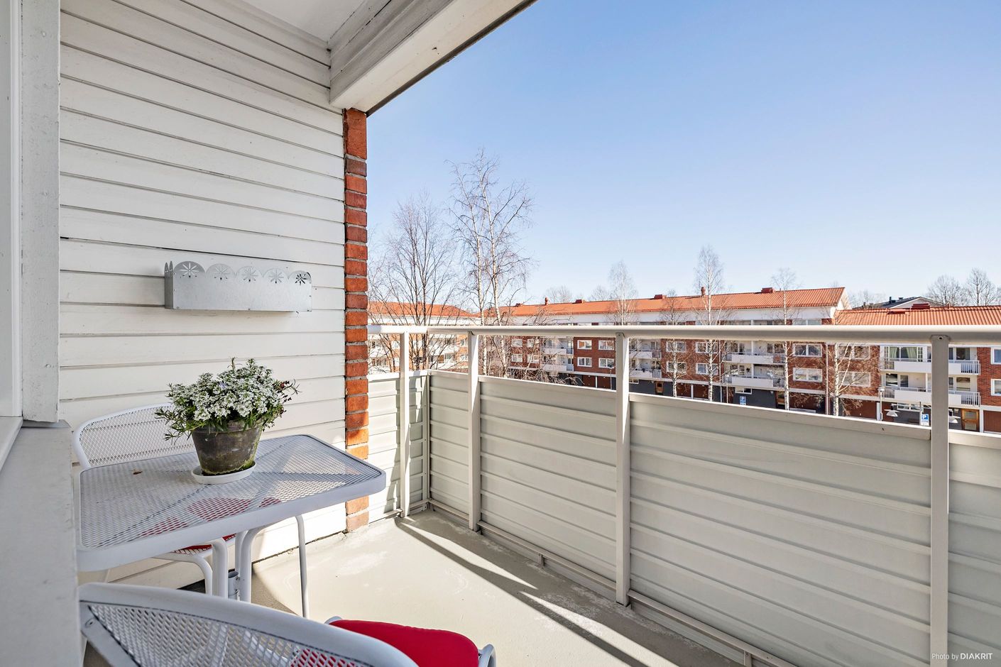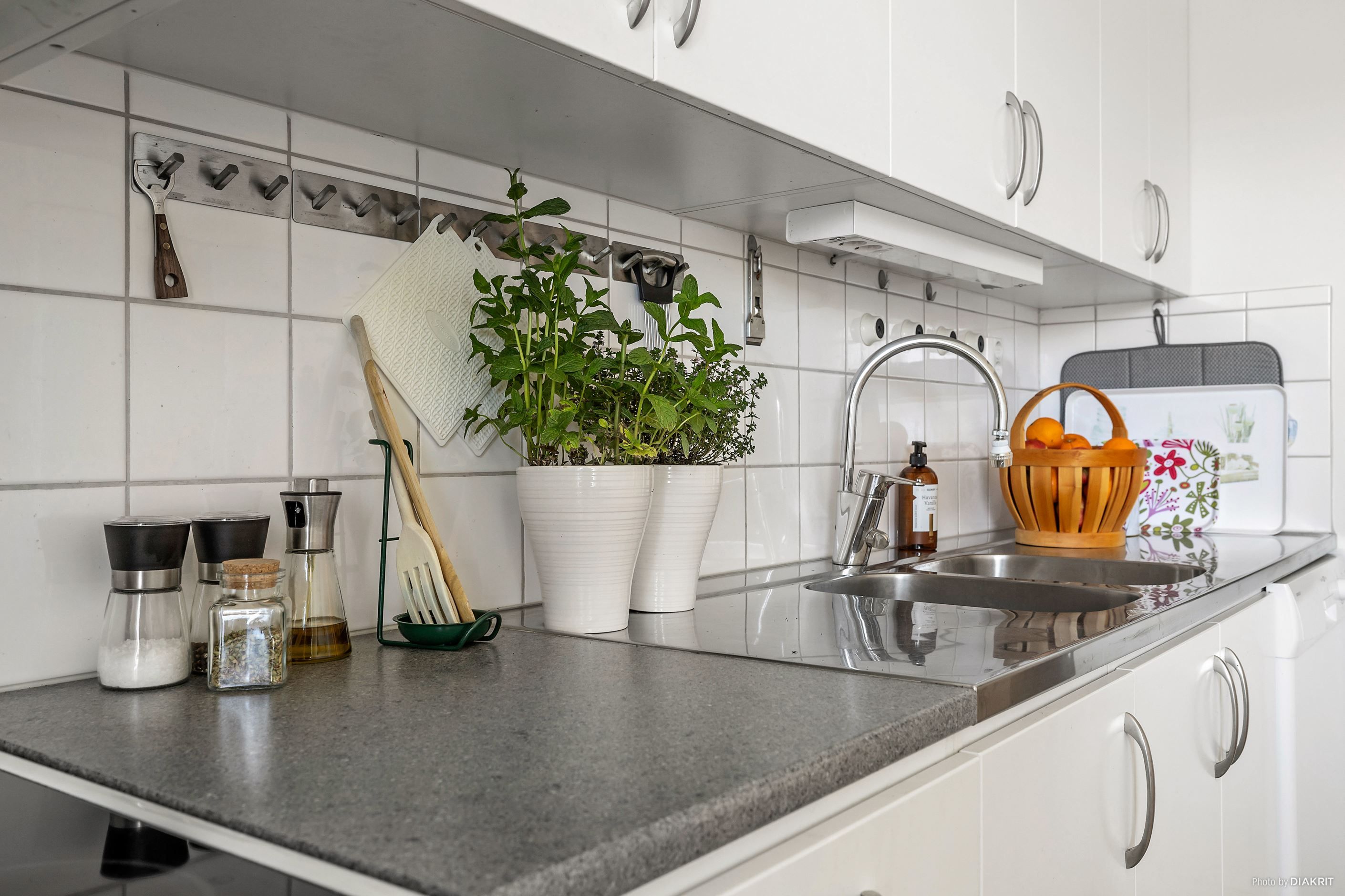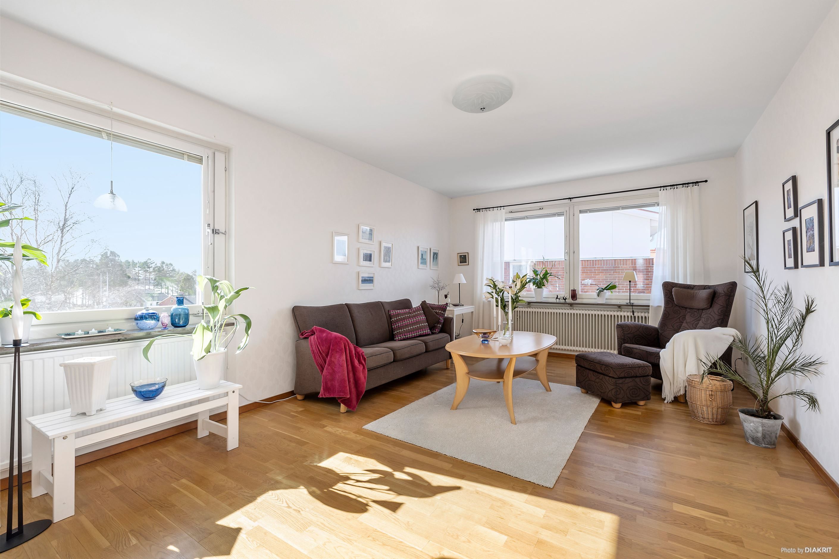 Köket är rymligt och stilrent med vita luckor och vitt kakel, och erbjuder gott om plats för matgrupp. Den maskinella utrustningen består av spis, kyl, frys samt diskmaskin. Härifrån nås även balkongen med utsikt över innergården. Vidare har bostaden ett rymligt vardagsrum med lättmöblerade ytor och fönster i två väderstreck, vilket ger ett härligt ljusflöde. Här finns gott om plats för både soffgrupp och övrigt möblemang.