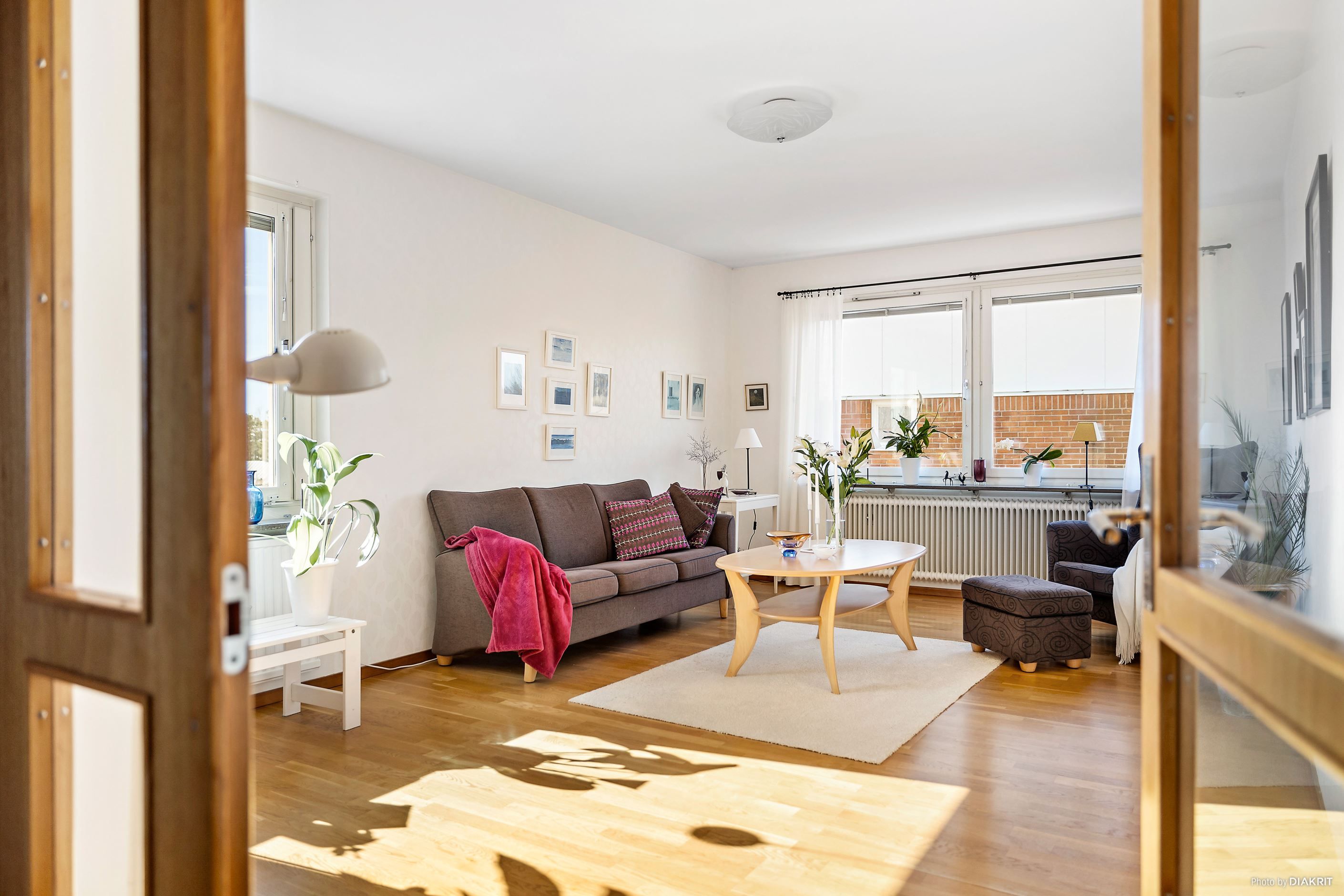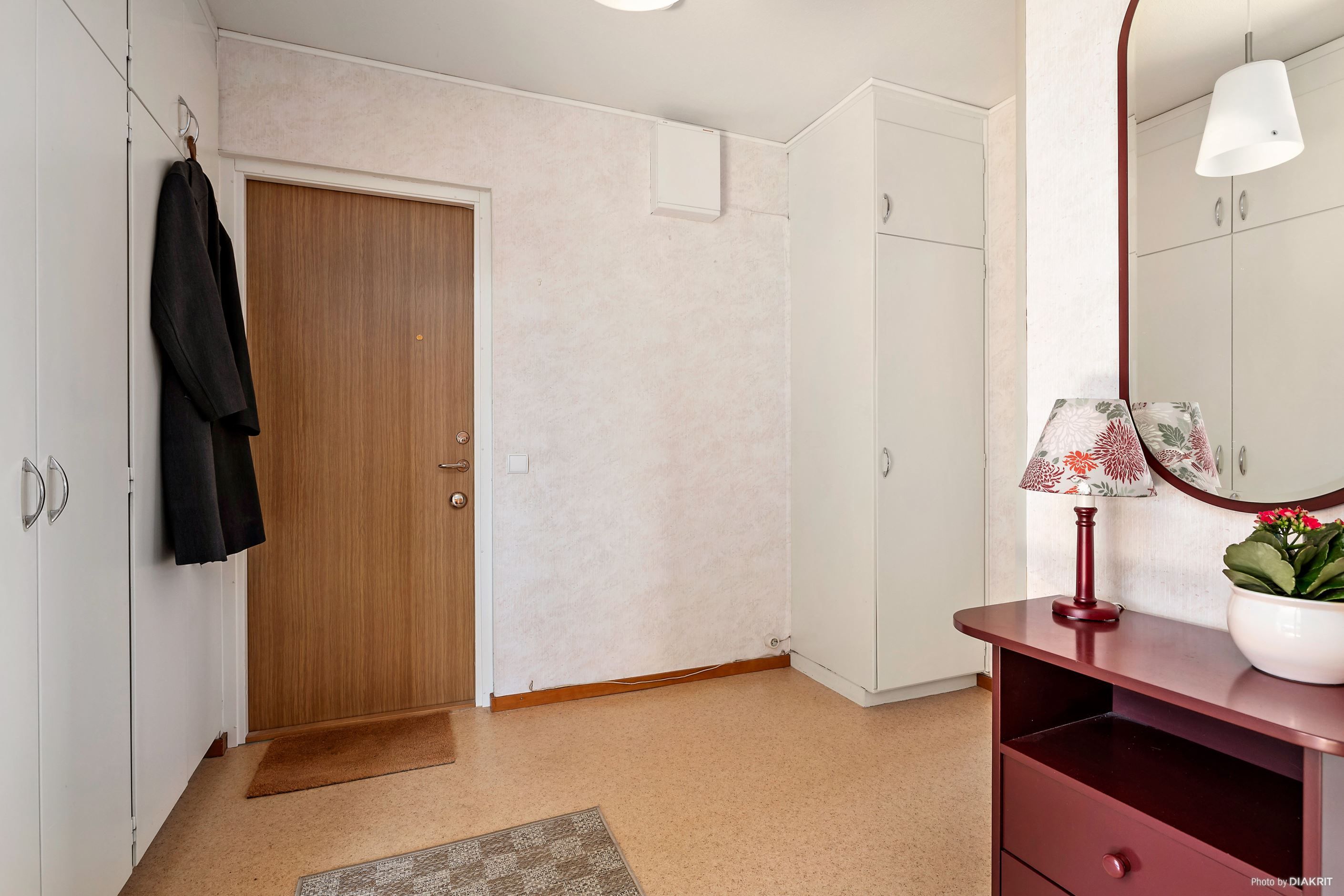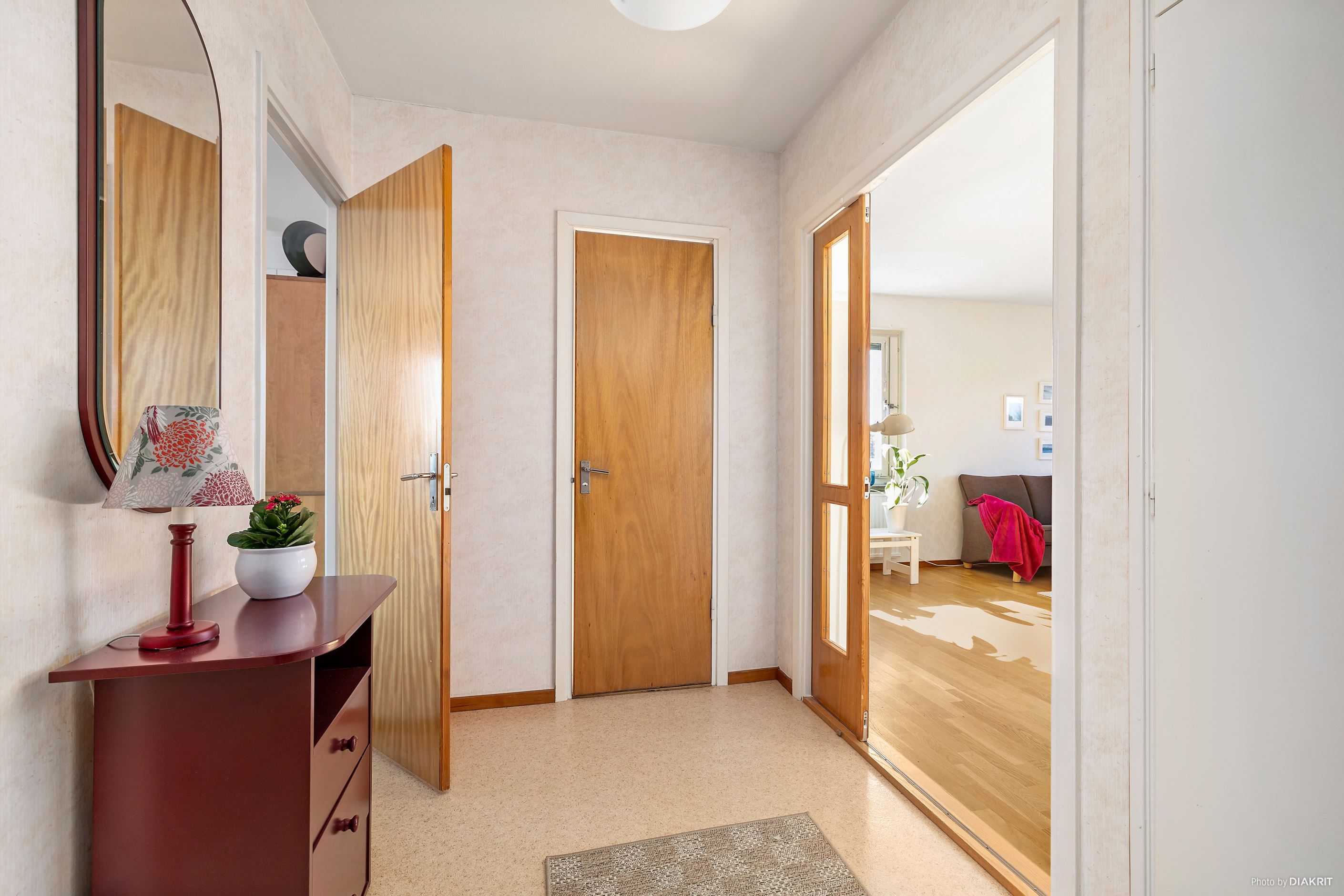 Bostaden har en trivsam planlösning och fint ljusinsläpp från stora fönster i tre väderstreck som skapar en luftig och inbjudande känsla. Här tar du klivet in i den praktiska hallen med goda förvaringsmöjligheter i platsbyggda garderober.