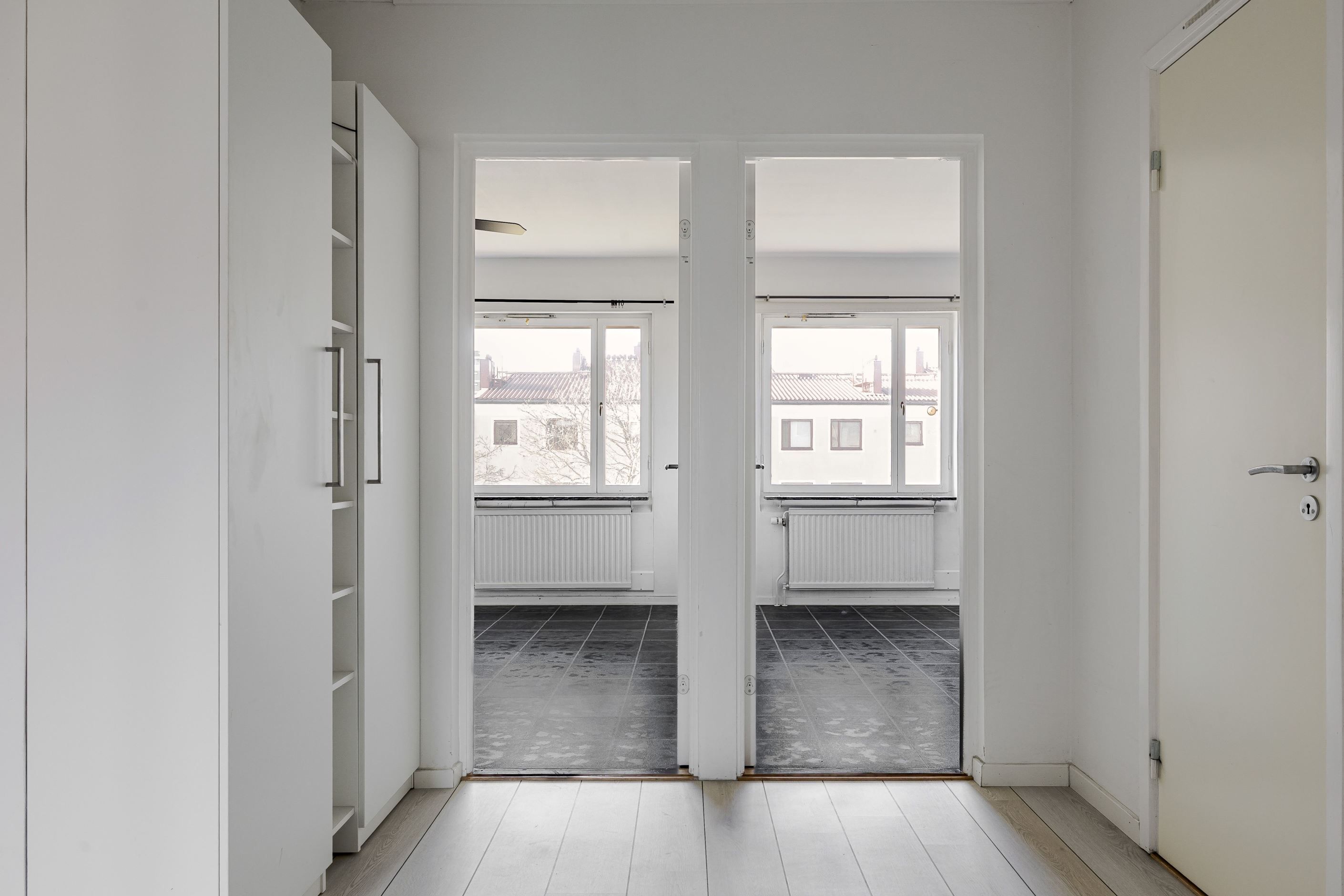 Vidare finns två sovrum i bra storlek där båda rummen får plats med dubbelsäng om så önskas. Förvaringsmöjligheter i garderober finns i ena sovrummet. Hallen är öppen och välkomnande och erbjuder förvaring i garderob samt i en separat klädkammare. Till bostaden hör även ett källarförråd.