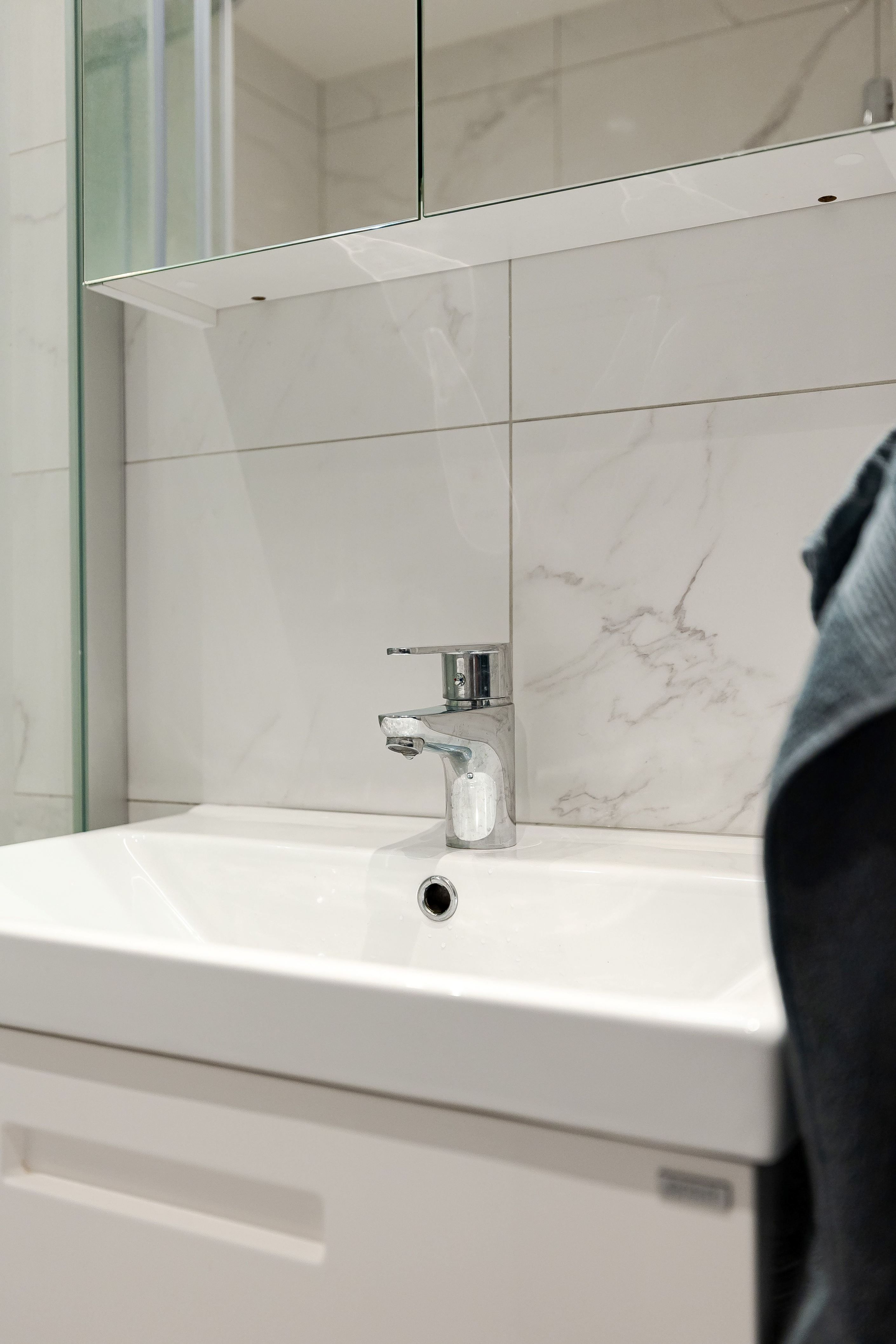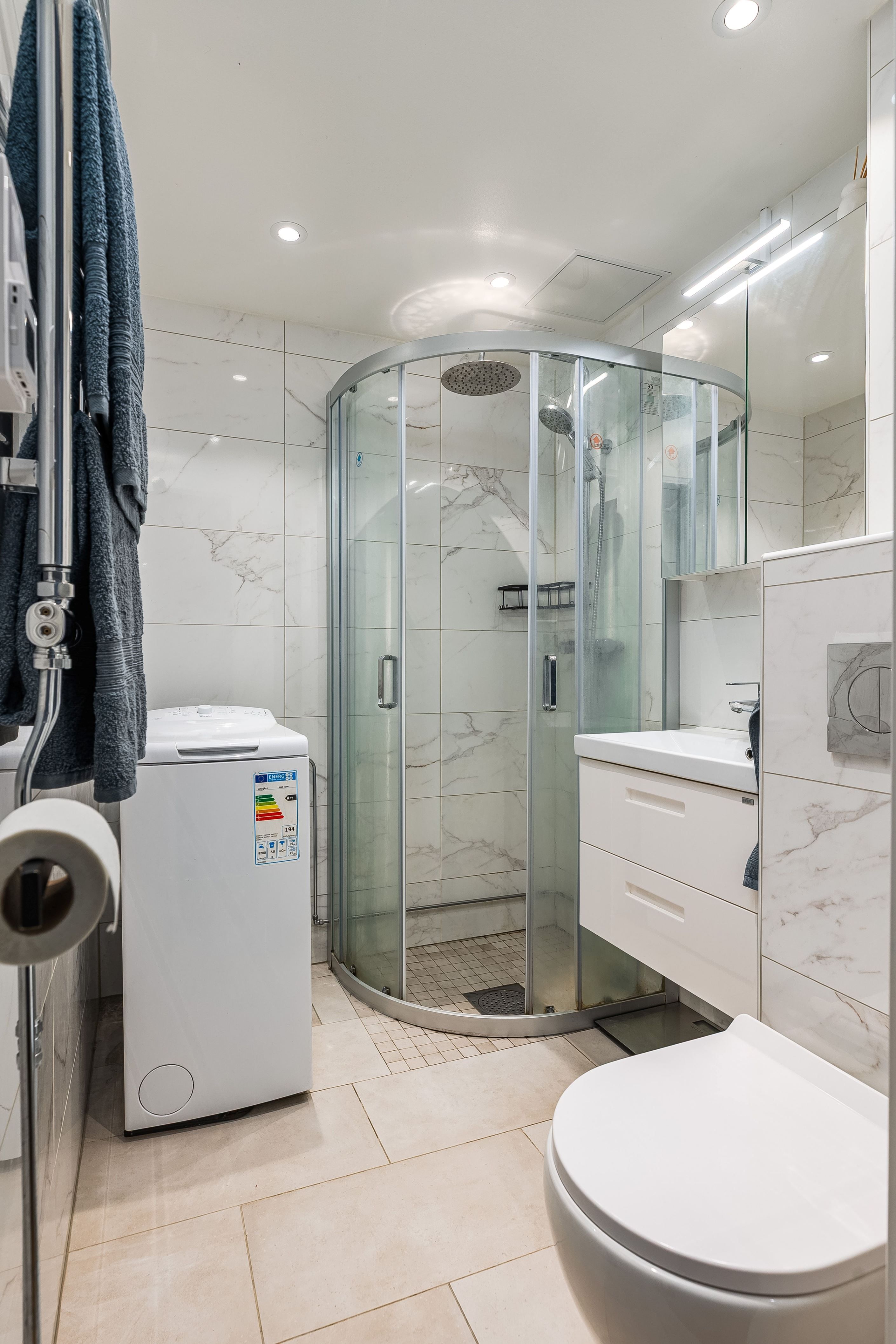 Renoverat badrum med kakel och klinkers i marmor, stilren kommod, tvättmaskin, wc och dusch.