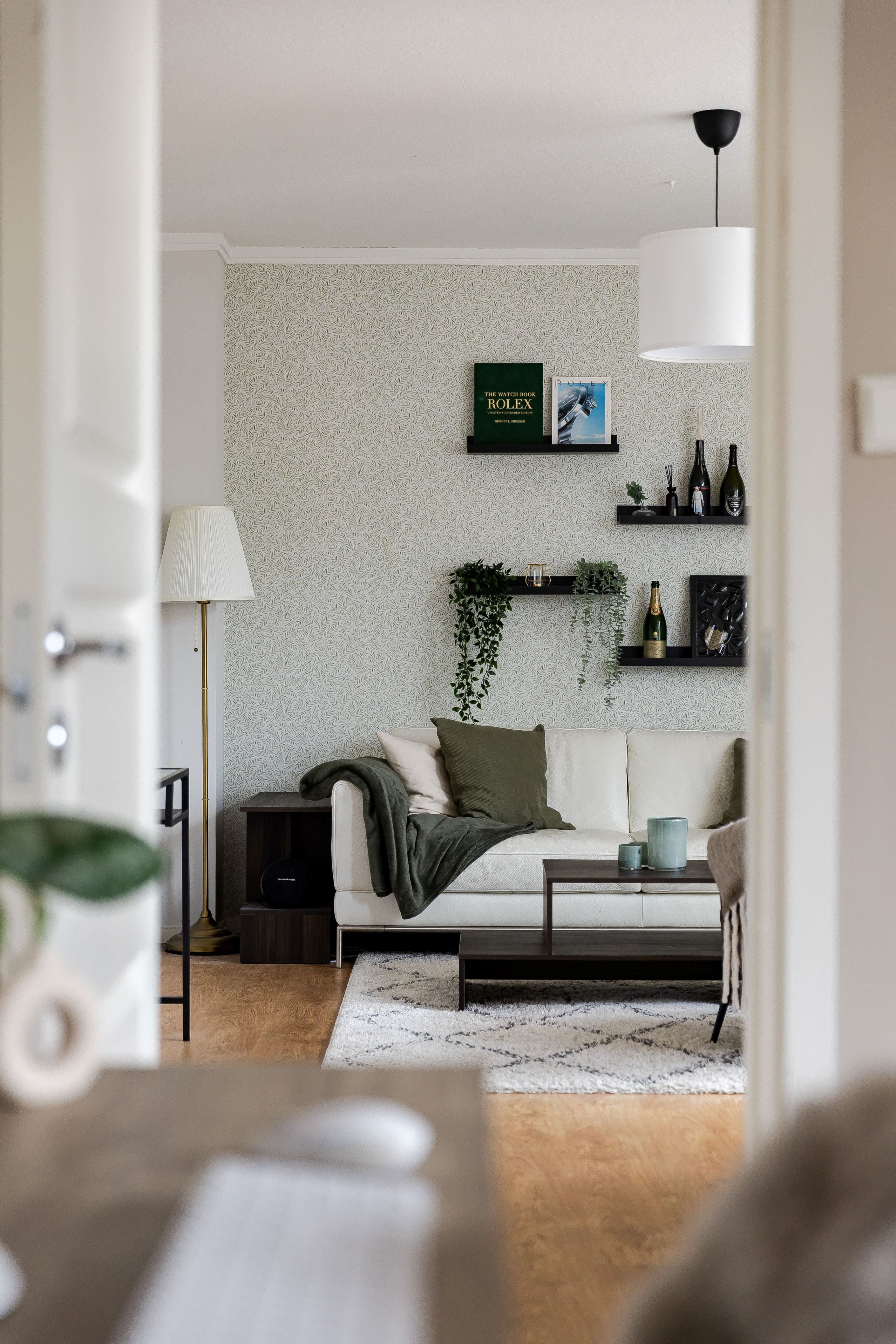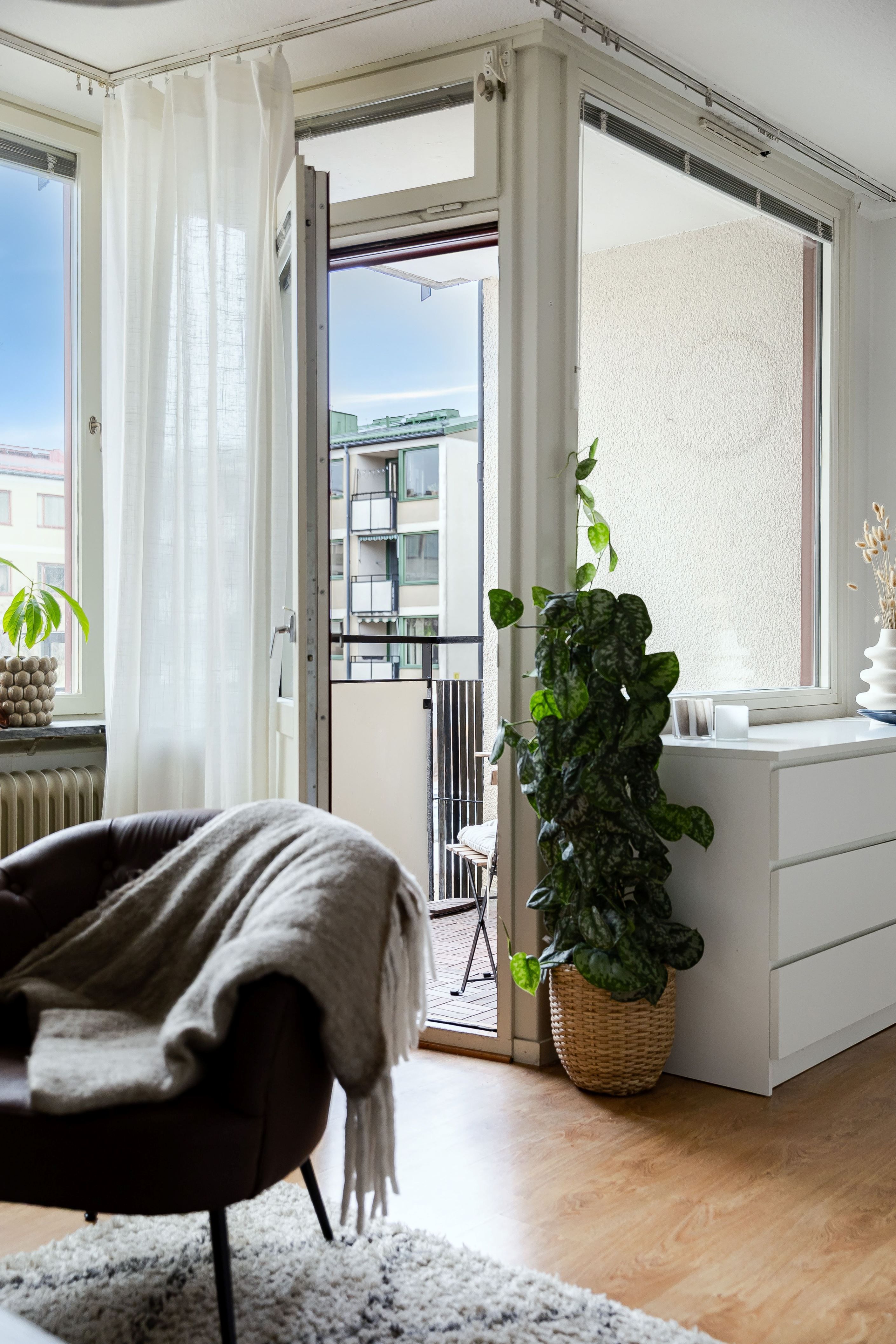 Ljust vardagsrum med stort fönsterparti och utgång till solig balkong i bästa after work-läge, här får ni njuta av solen från kl 16 och framåt!