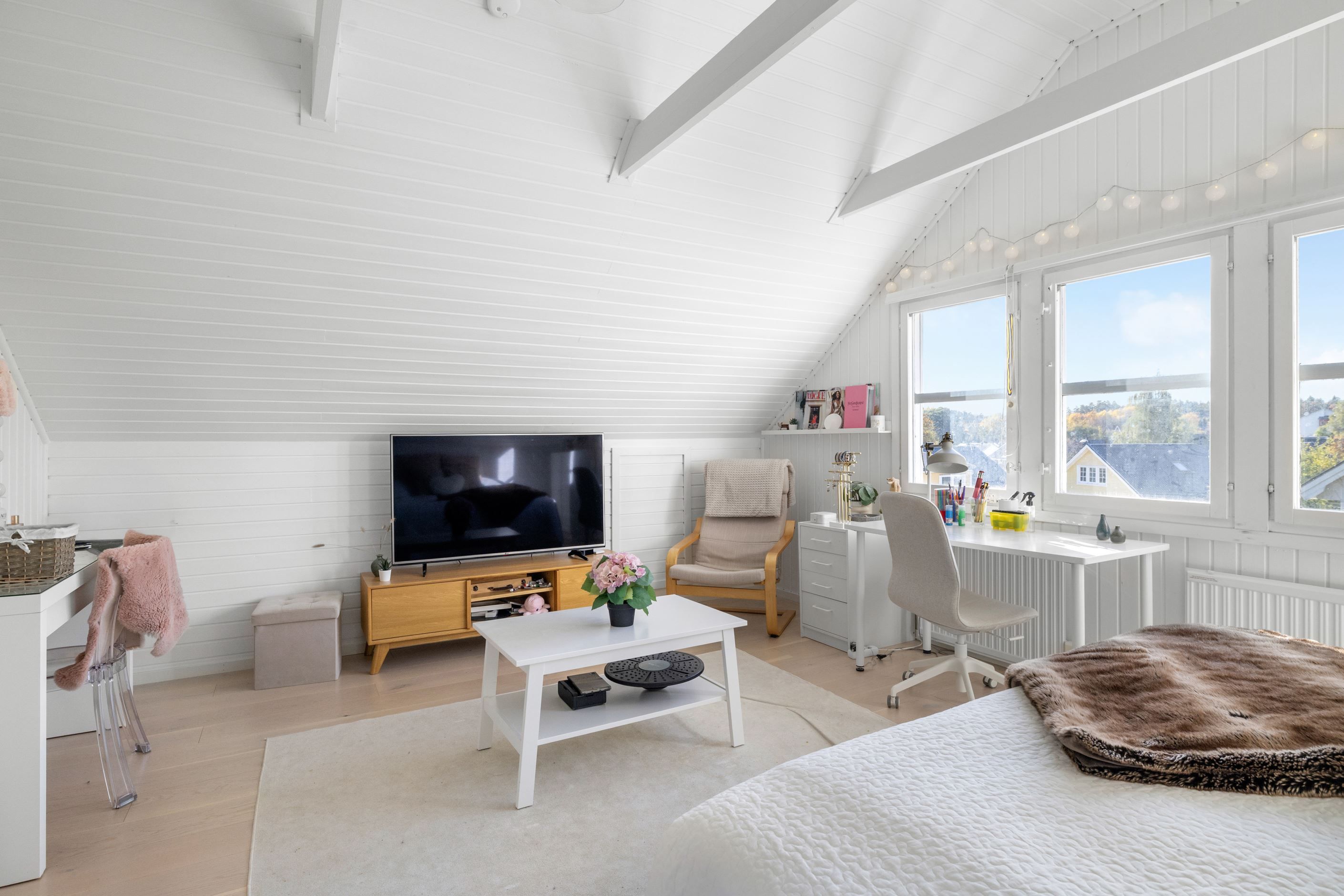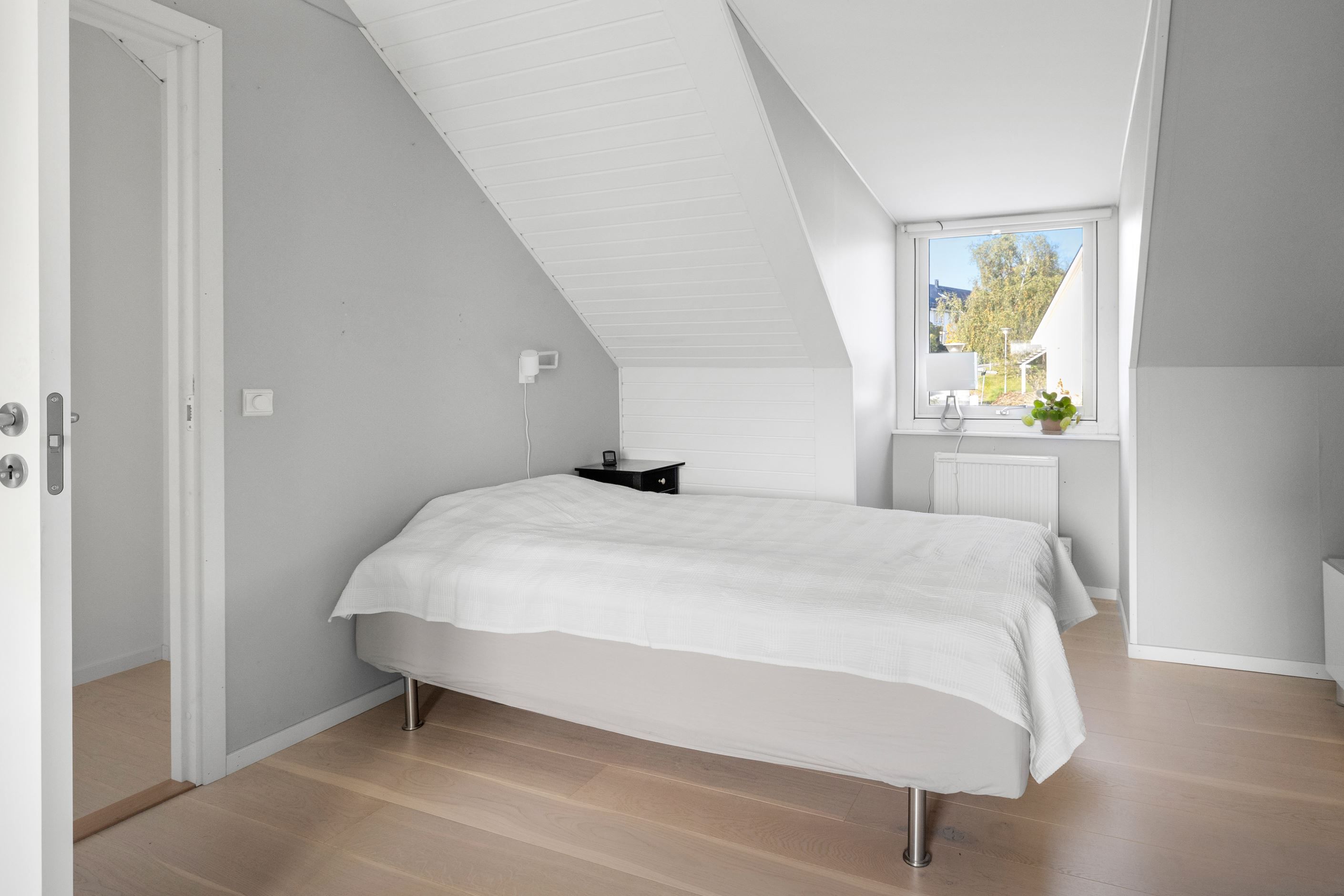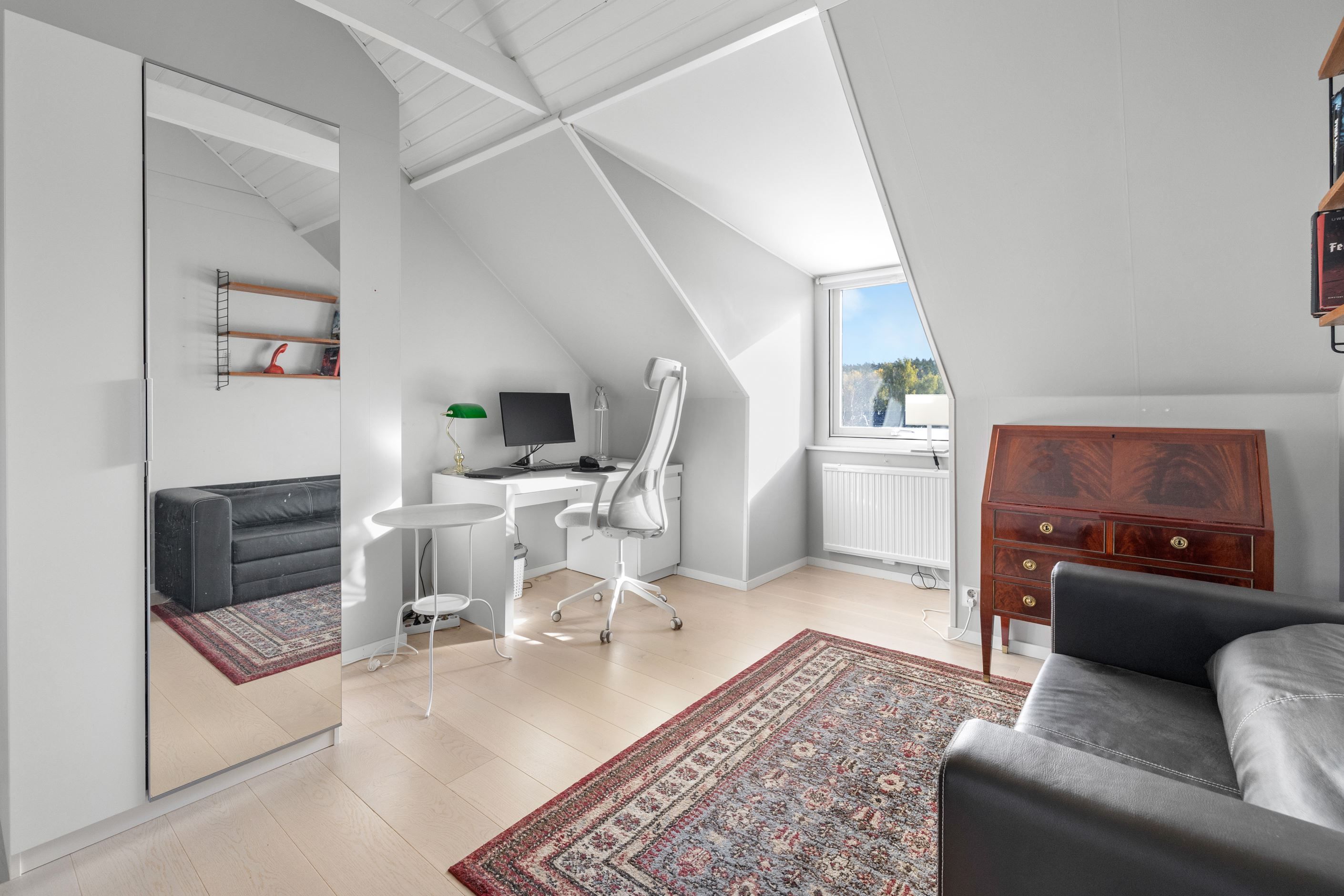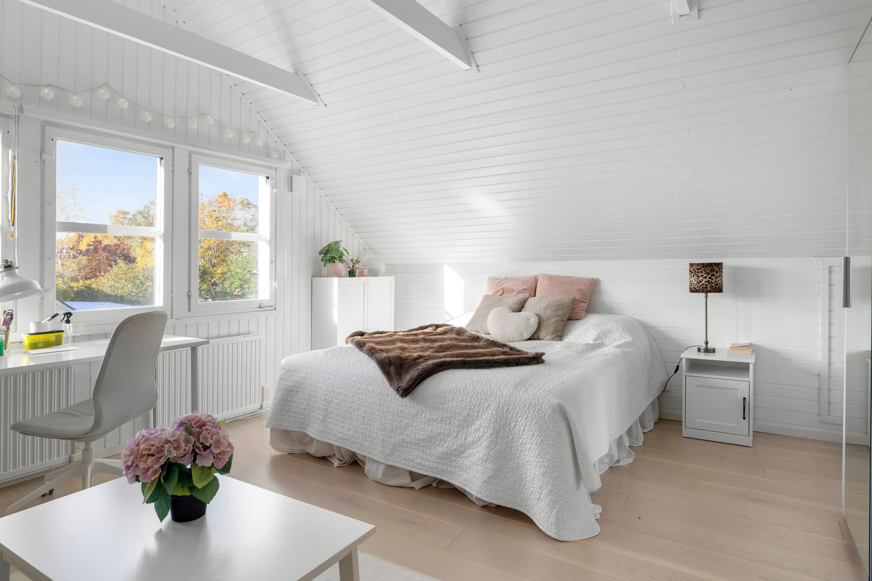 På samma plan finns även ett sovrum med garderober samt ett badrum med badkar. En trappa upp väntar två rymliga sovrum med öppet upp till nock och en luftig atmosfär. För den som behöver fler rum går det enkelt att skapa ytterligare ett här.