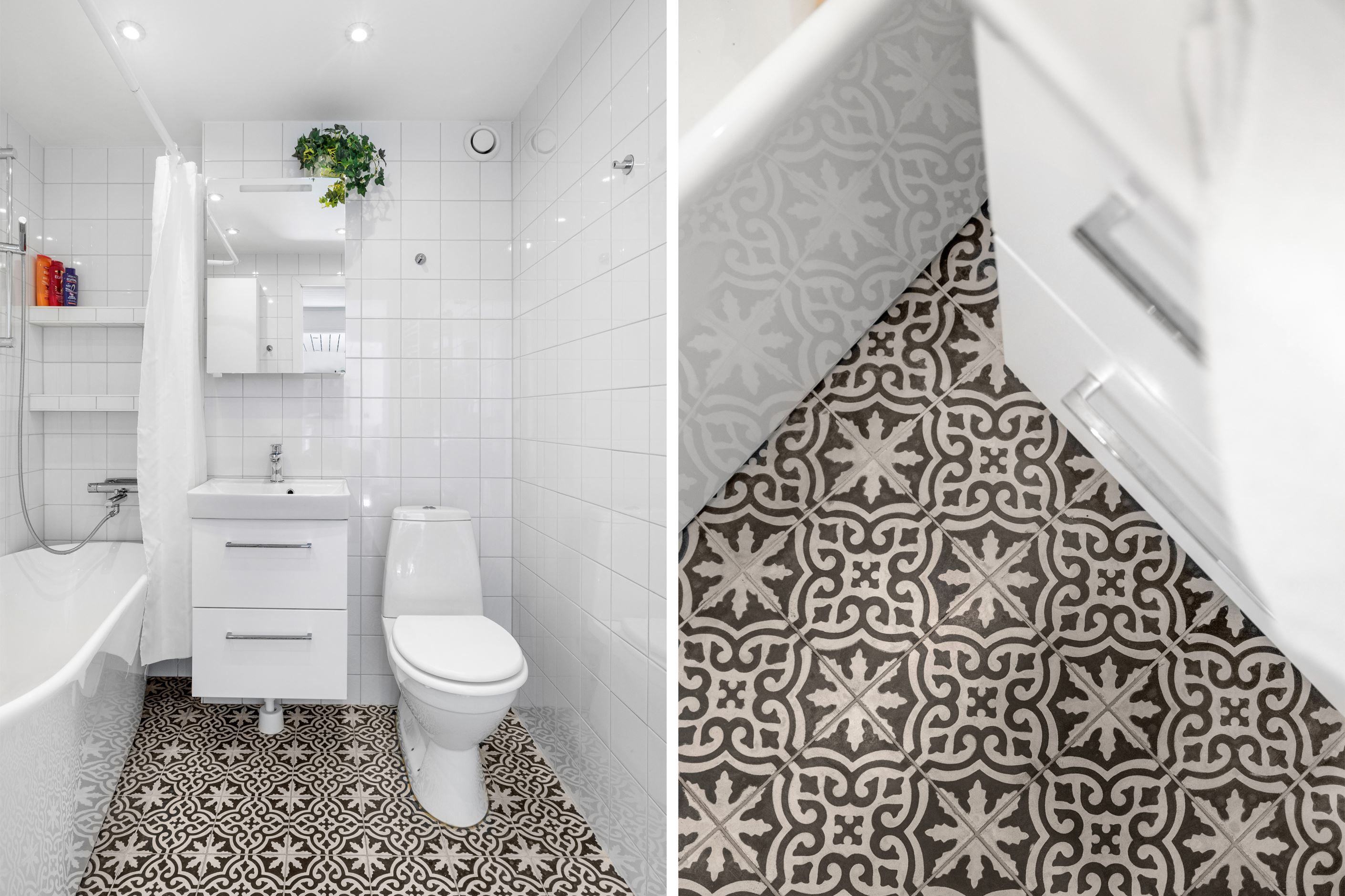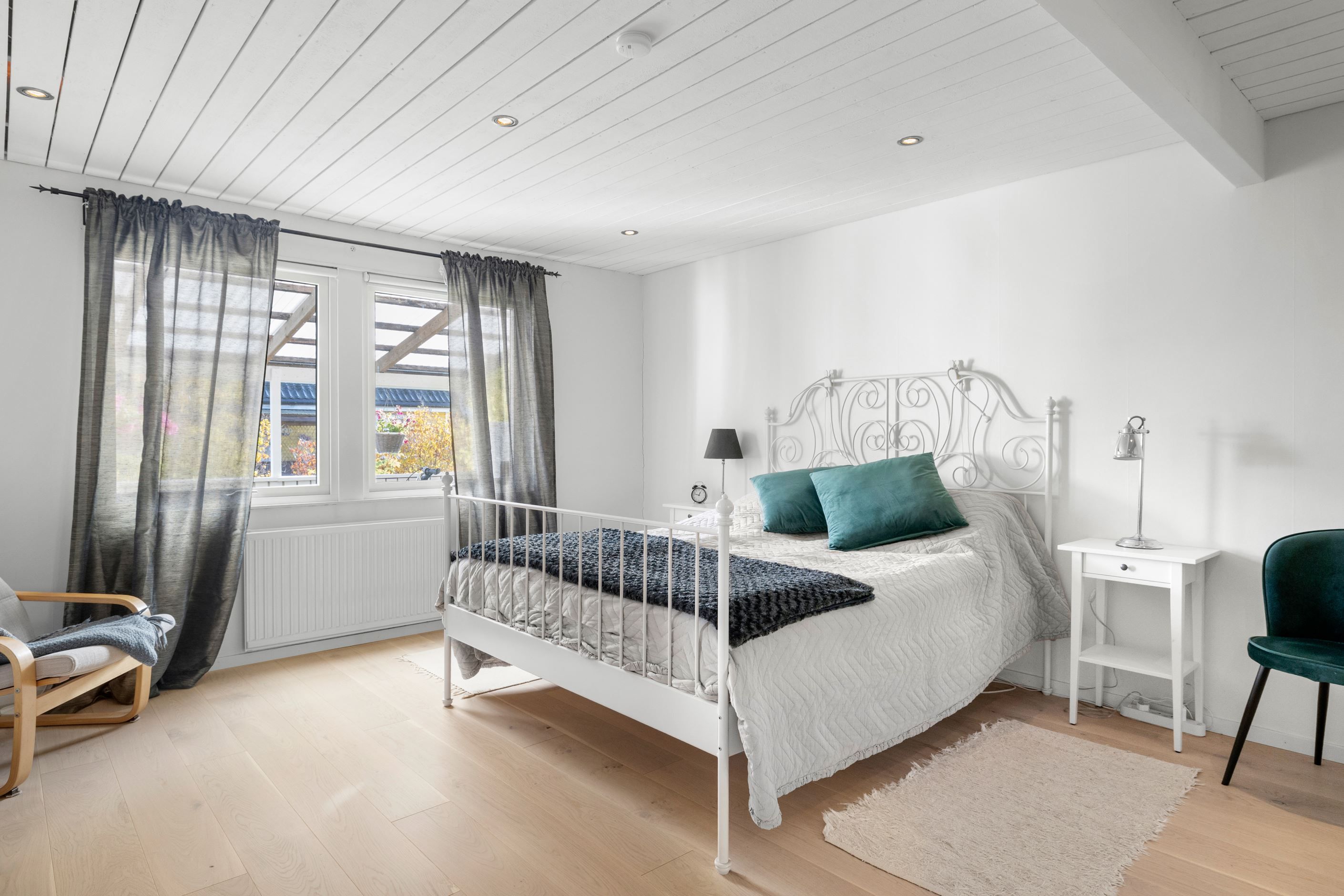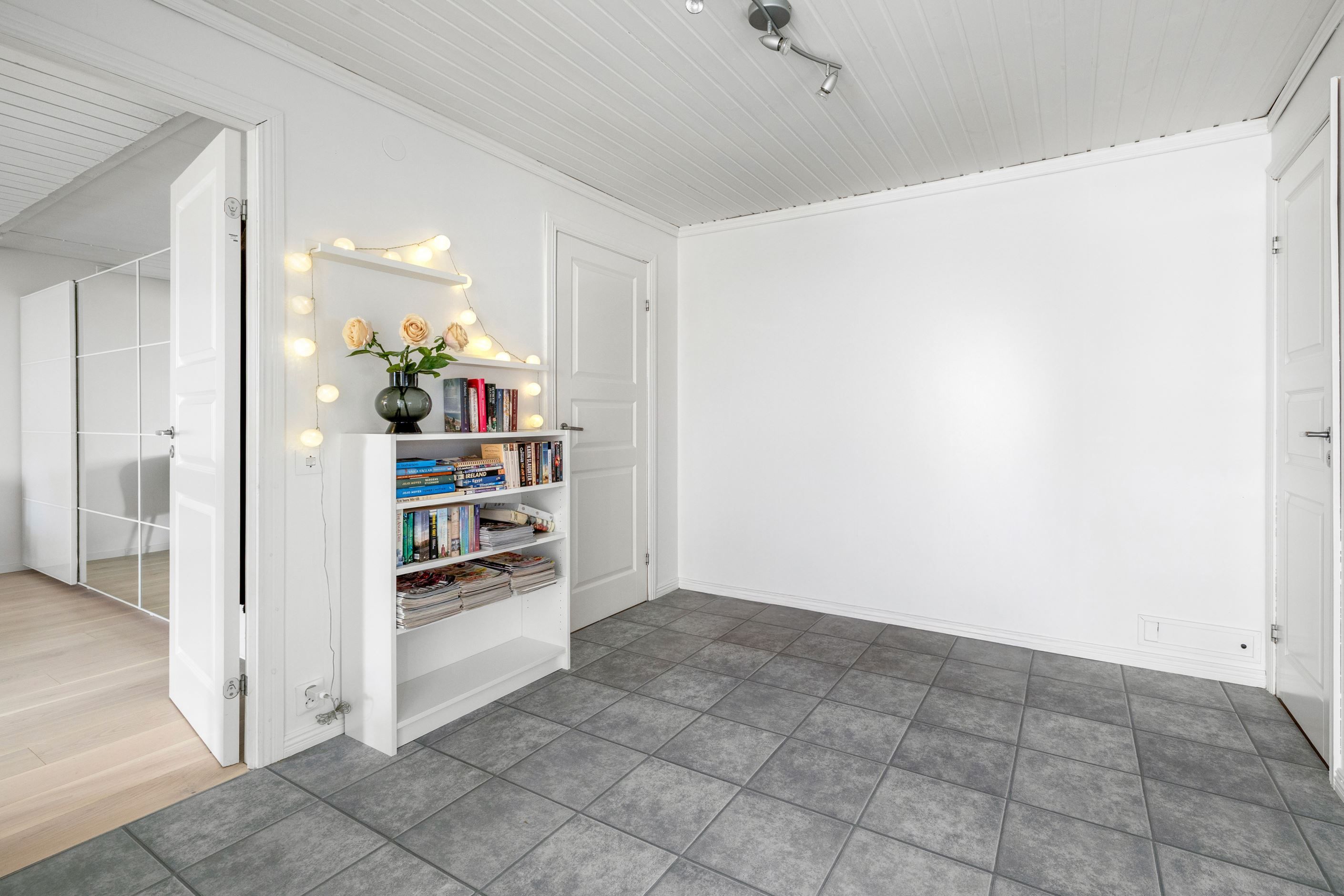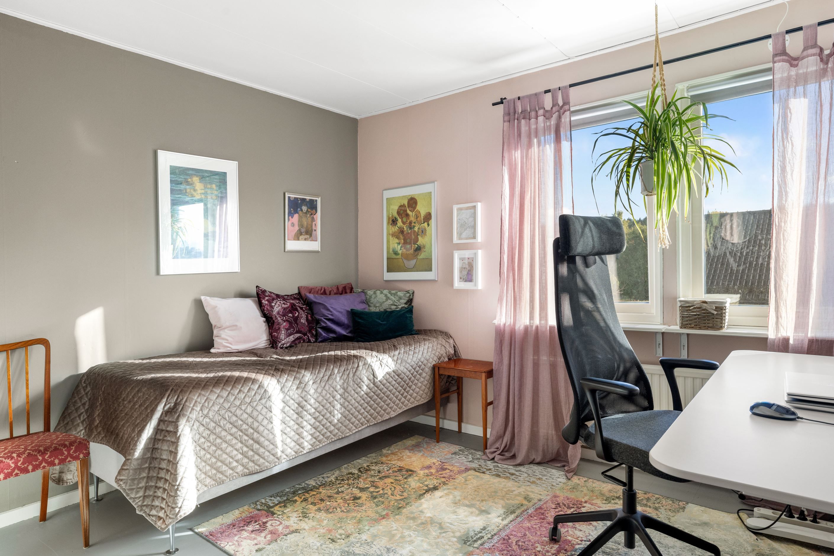 På samma plan finns även ett sovrum med garderober samt ett badrum med badkar. En trappa upp väntar två rymliga sovrum med öppet upp till nock och en luftig atmosfär. För den som behöver fler rum går det enkelt att skapa ytterligare ett här.