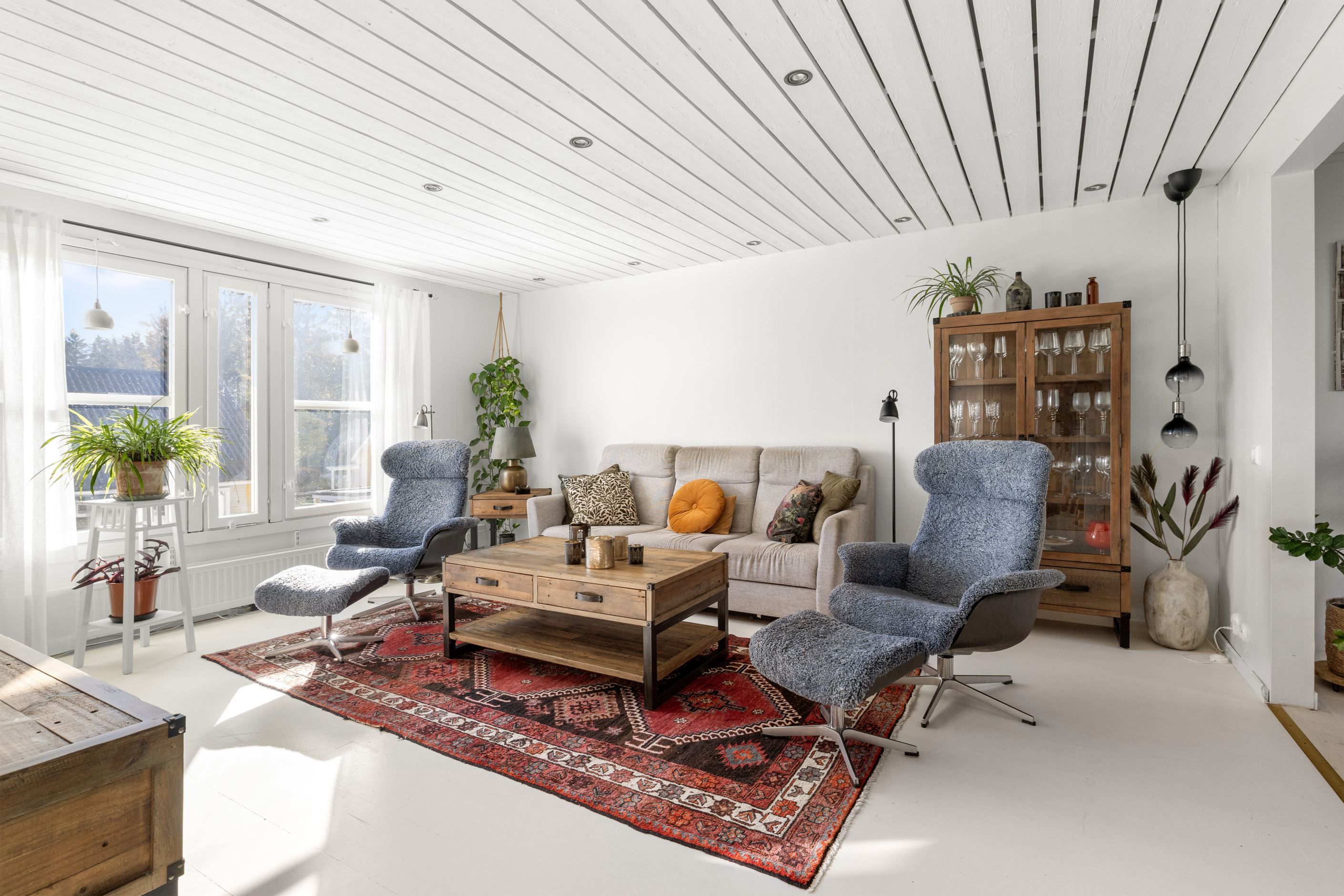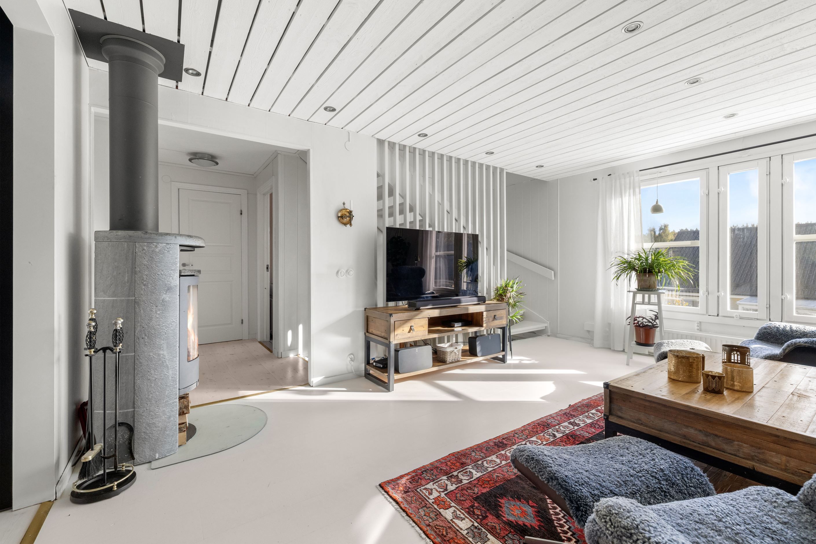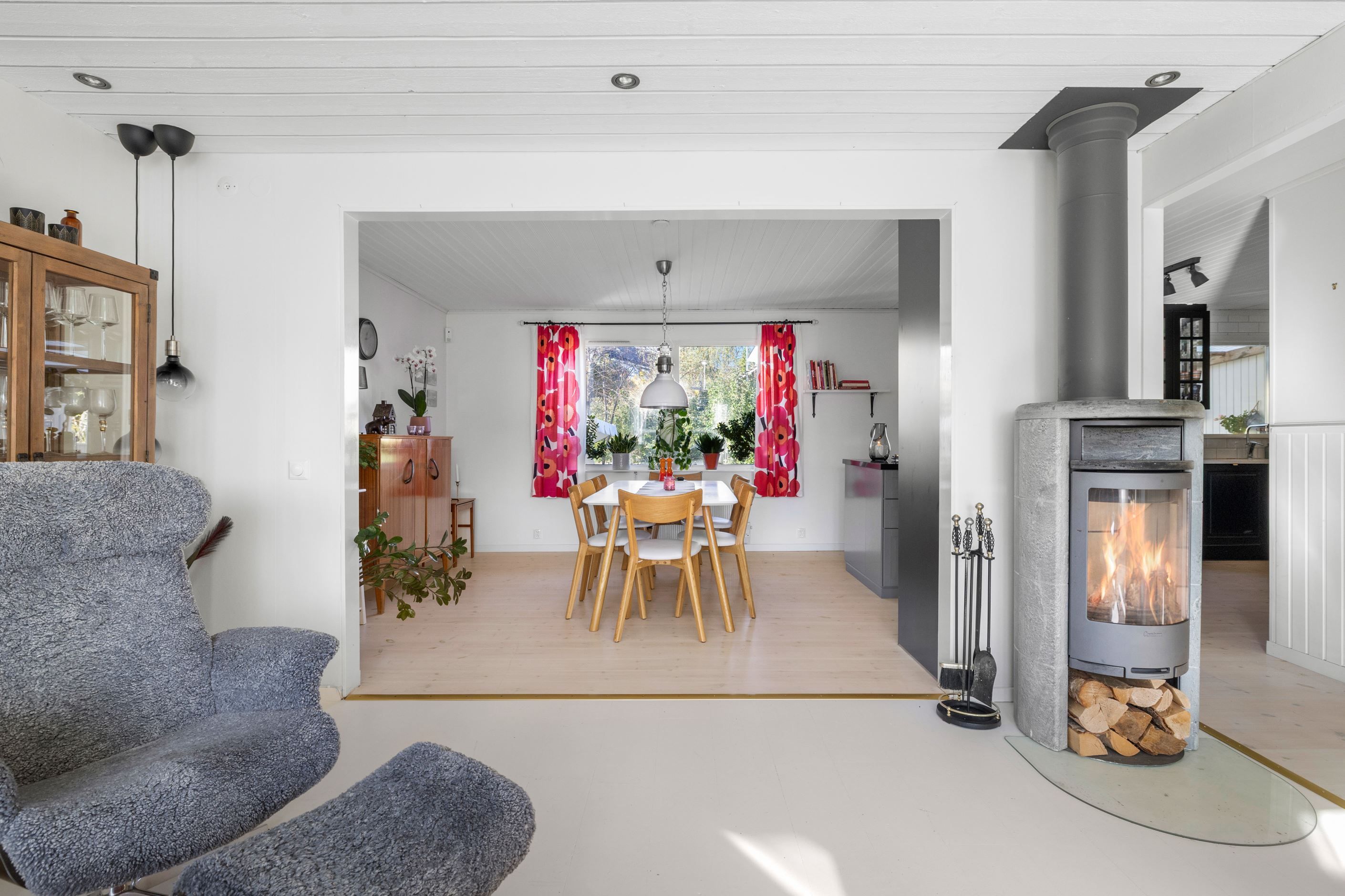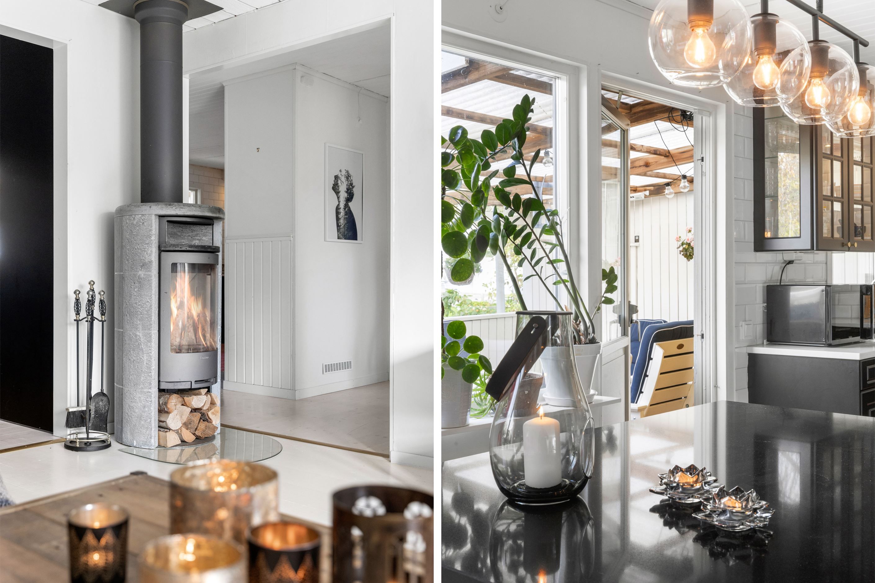 Huset om ca 194 kvm fördelat på tre plan är generöst tilltaget och erbjuder en välplanerad planlösning med plats för både sociala ytor och privata rum. Mellanplanet är hemmets hjärta, där det påkostade Puustelli-köket med exklusiv stenskiva och köksö öppnar upp mot matplats och vardagsrum. Här sprider sig ljuset genom stora fönster och den stämningsfulla täljstenskaminen blir en naturlig mittpunkt under årets kalla dagar. Från vardagsrummet nås också trädgården som bjuder in till middagar, lek och lata sommarkvällar.