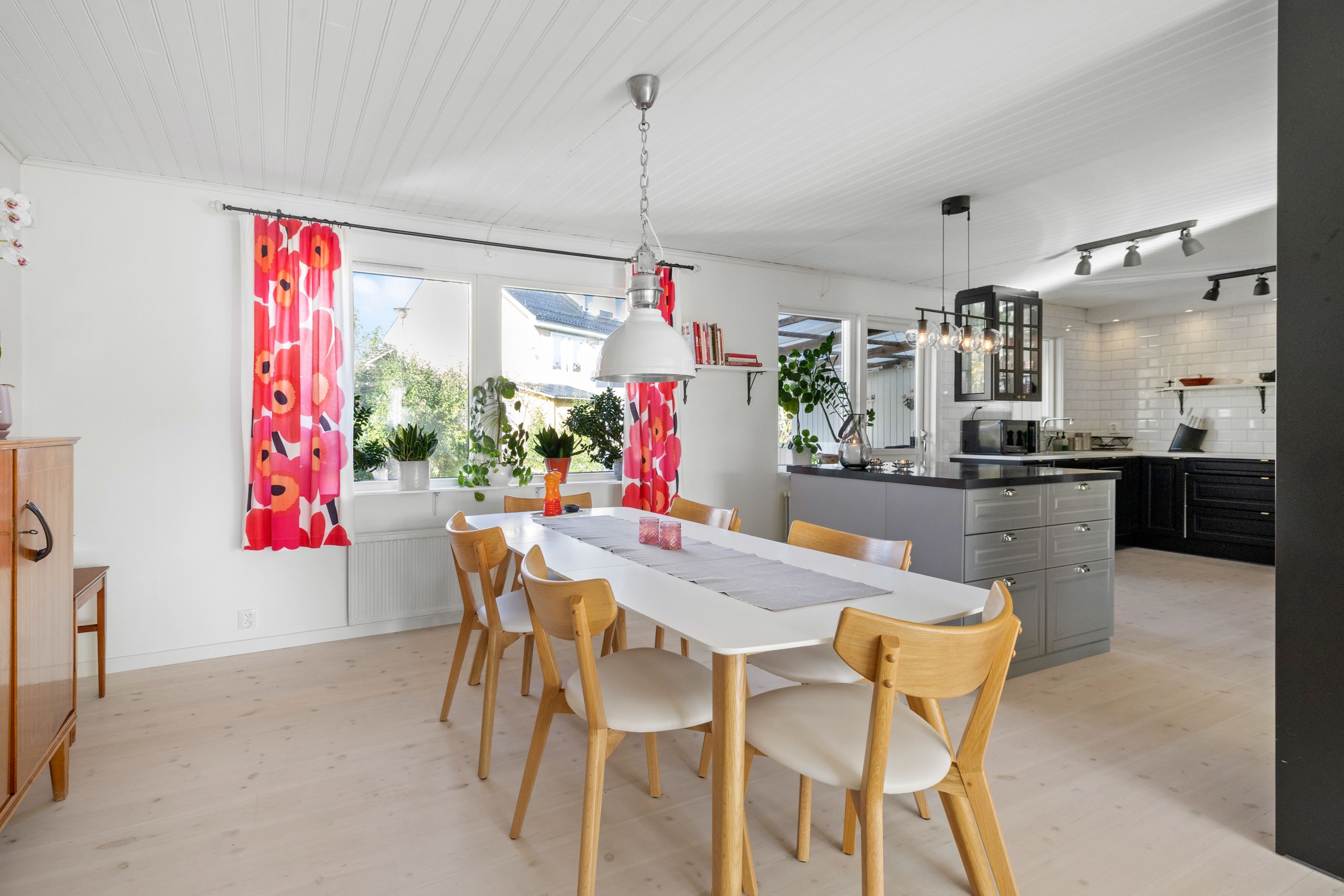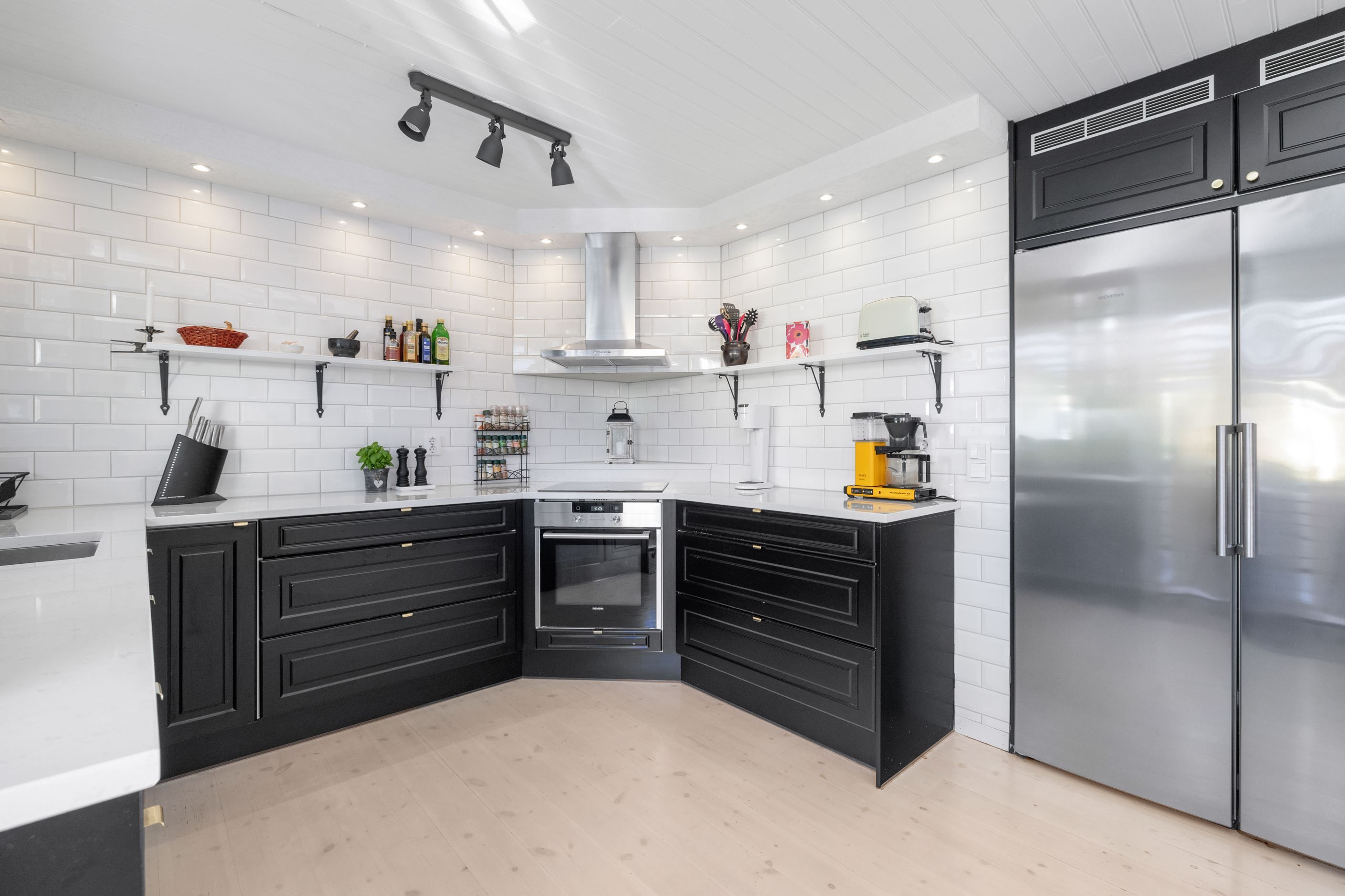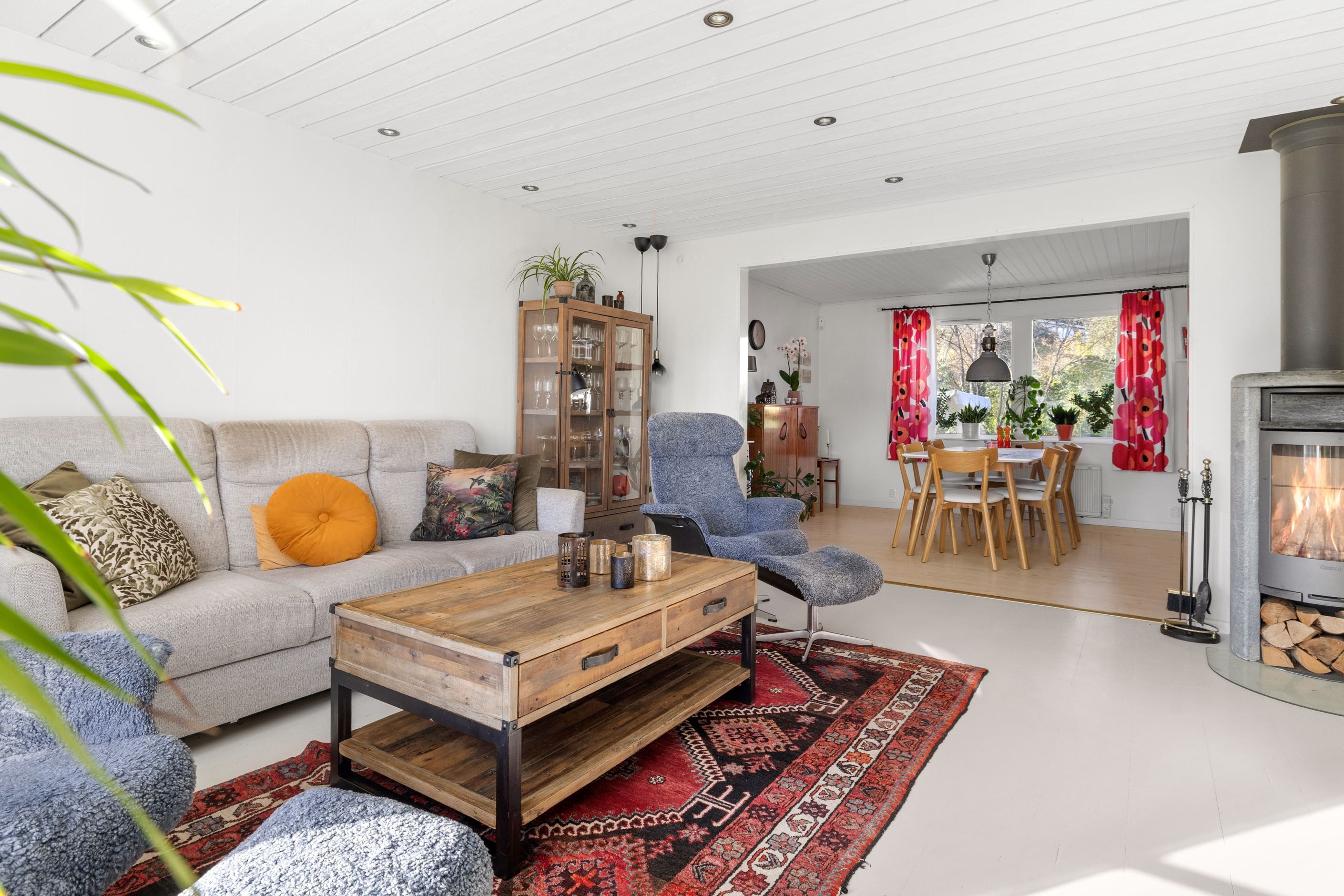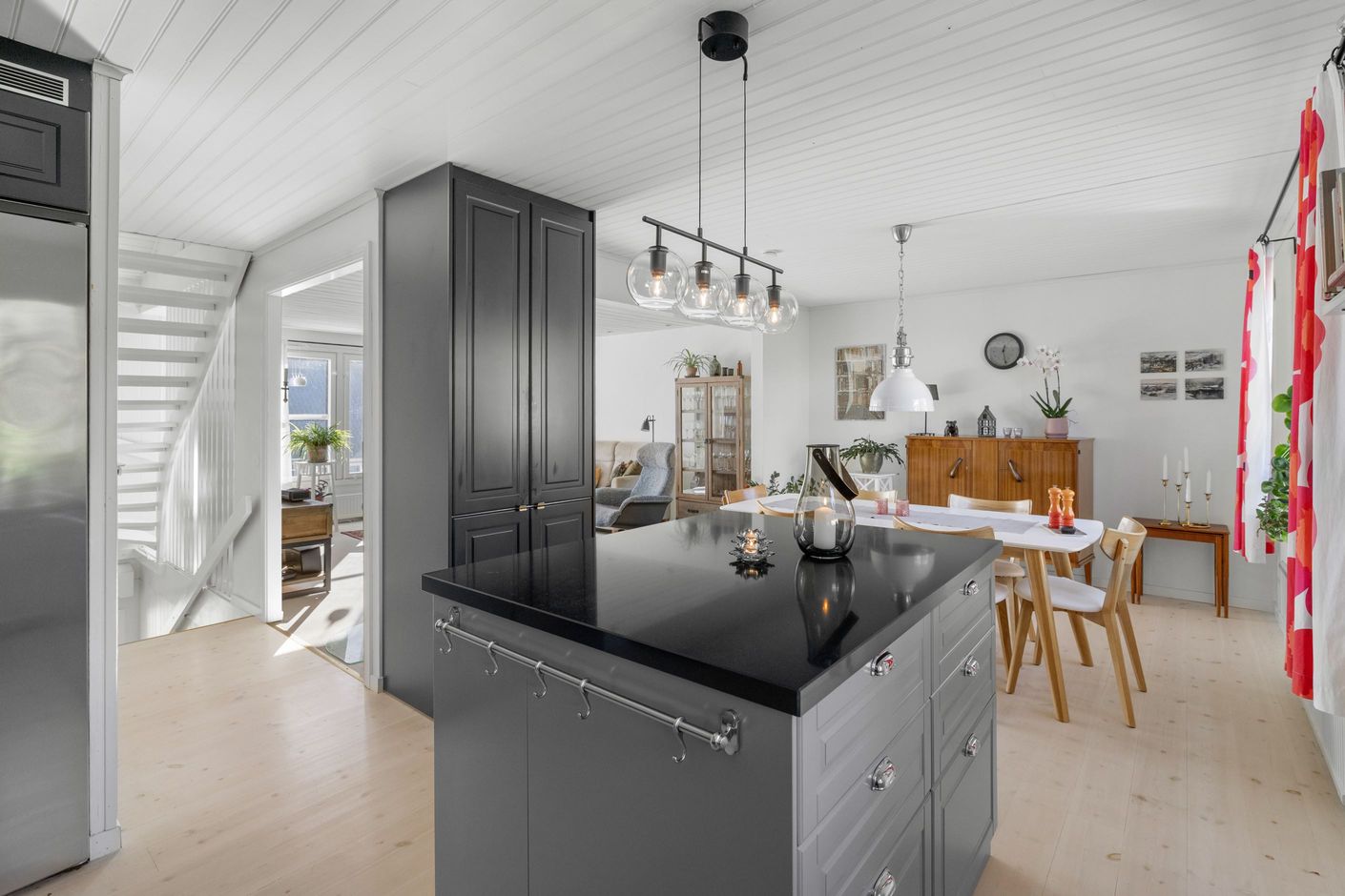 Huset om ca 194 kvm fördelat på tre plan är generöst tilltaget och erbjuder en välplanerad planlösning med plats för både sociala ytor och privata rum. Mellanplanet är hemmets hjärta, där det påkostade Puustelli-köket med exklusiv stenskiva och köksö öppnar upp mot matplats och vardagsrum. Här sprider sig ljuset genom stora fönster och den stämningsfulla täljstenskaminen blir en naturlig mittpunkt under årets kalla dagar. Från vardagsrummet nås också trädgården som bjuder in till middagar, lek och lata sommarkvällar.