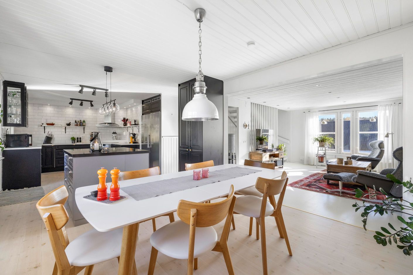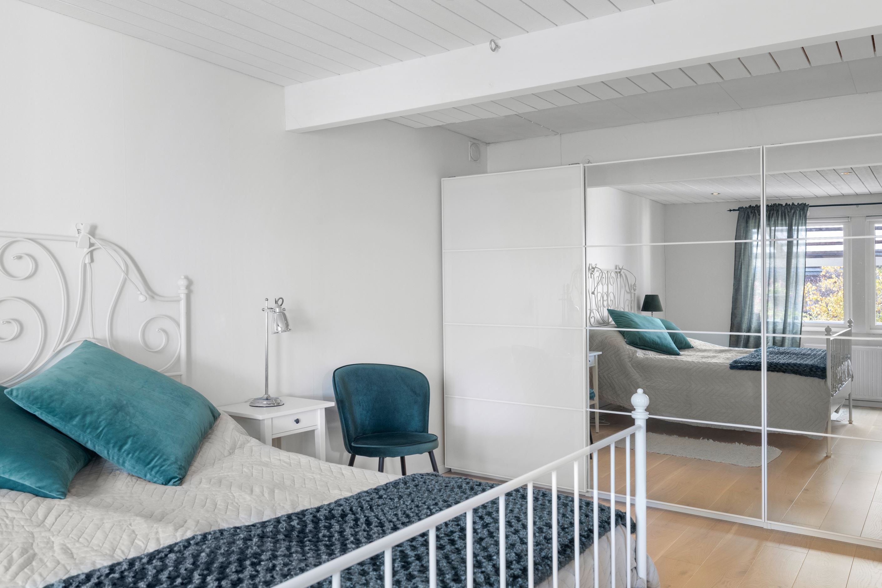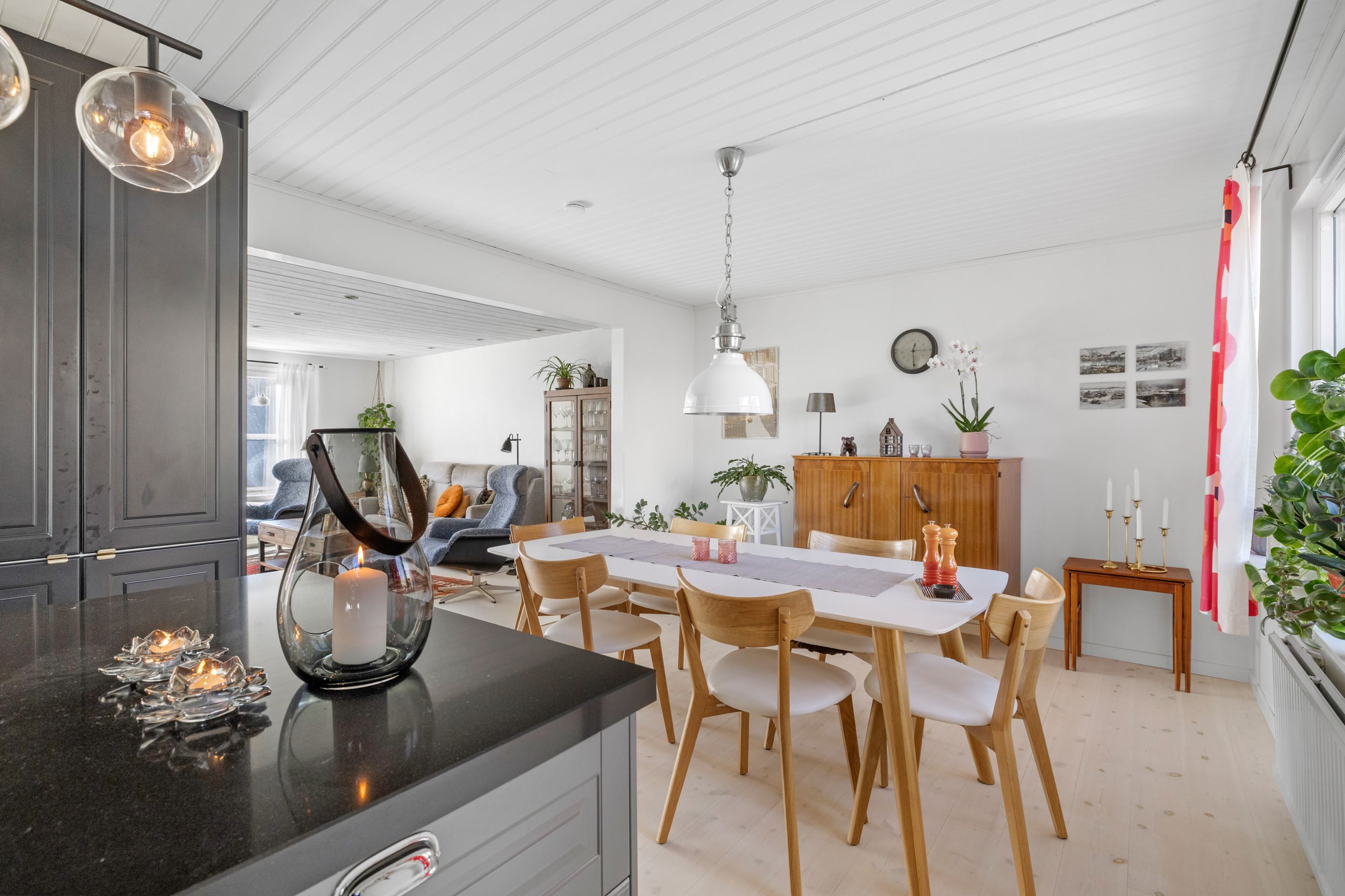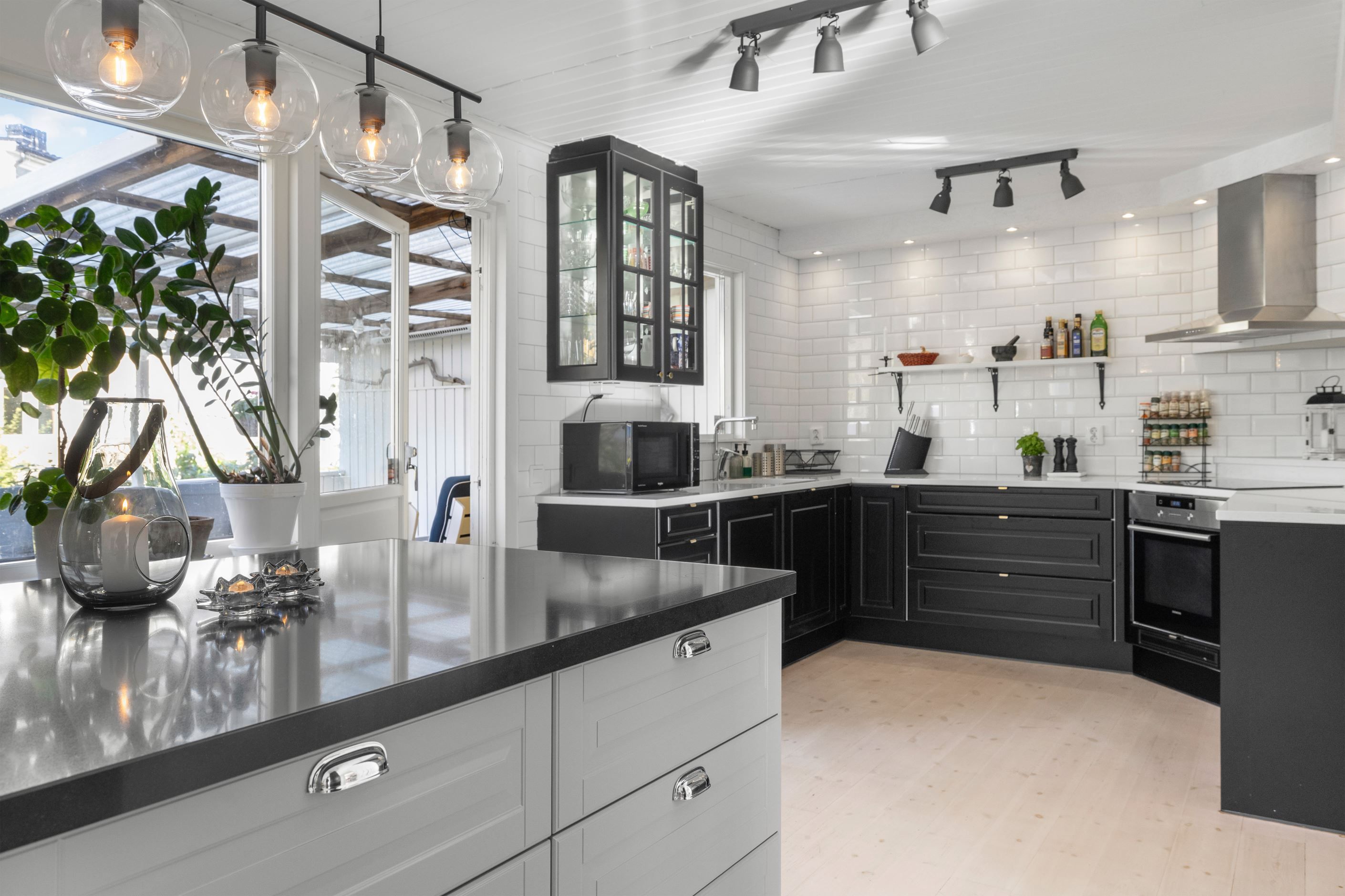 Huset om ca 194 kvm fördelat på tre plan är generöst tilltaget och erbjuder en välplanerad planlösning med plats för både sociala ytor och privata rum. Mellanplanet är hemmets hjärta, där det påkostade Puustelli-köket med exklusiv stenskiva och köksö öppnar upp mot matplats och vardagsrum. Här sprider sig ljuset genom stora fönster och den stämningsfulla täljstenskaminen blir en naturlig mittpunkt under årets kalla dagar. Från vardagsrummet nås också trädgården som bjuder in till middagar, lek och lata sommarkvällar.