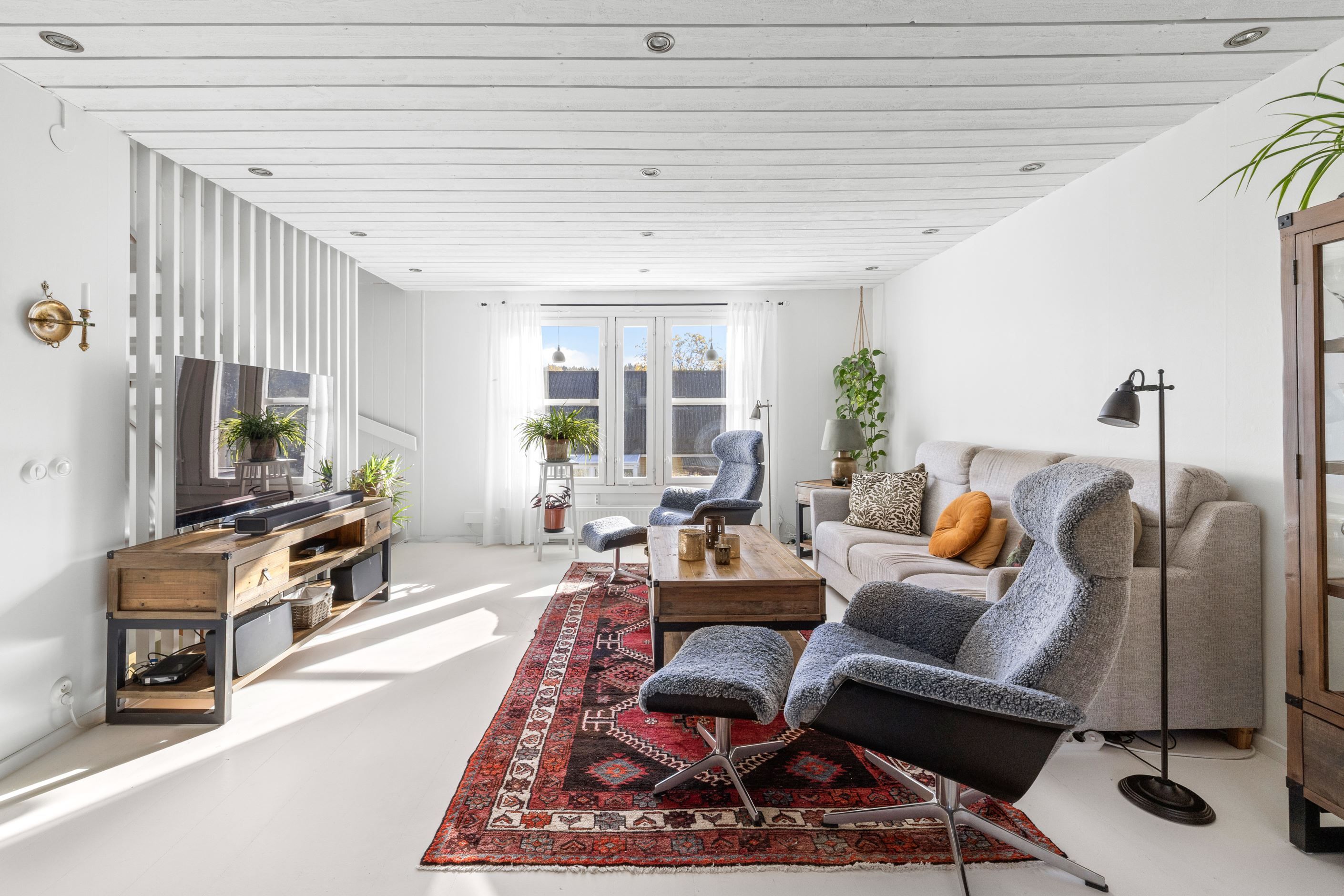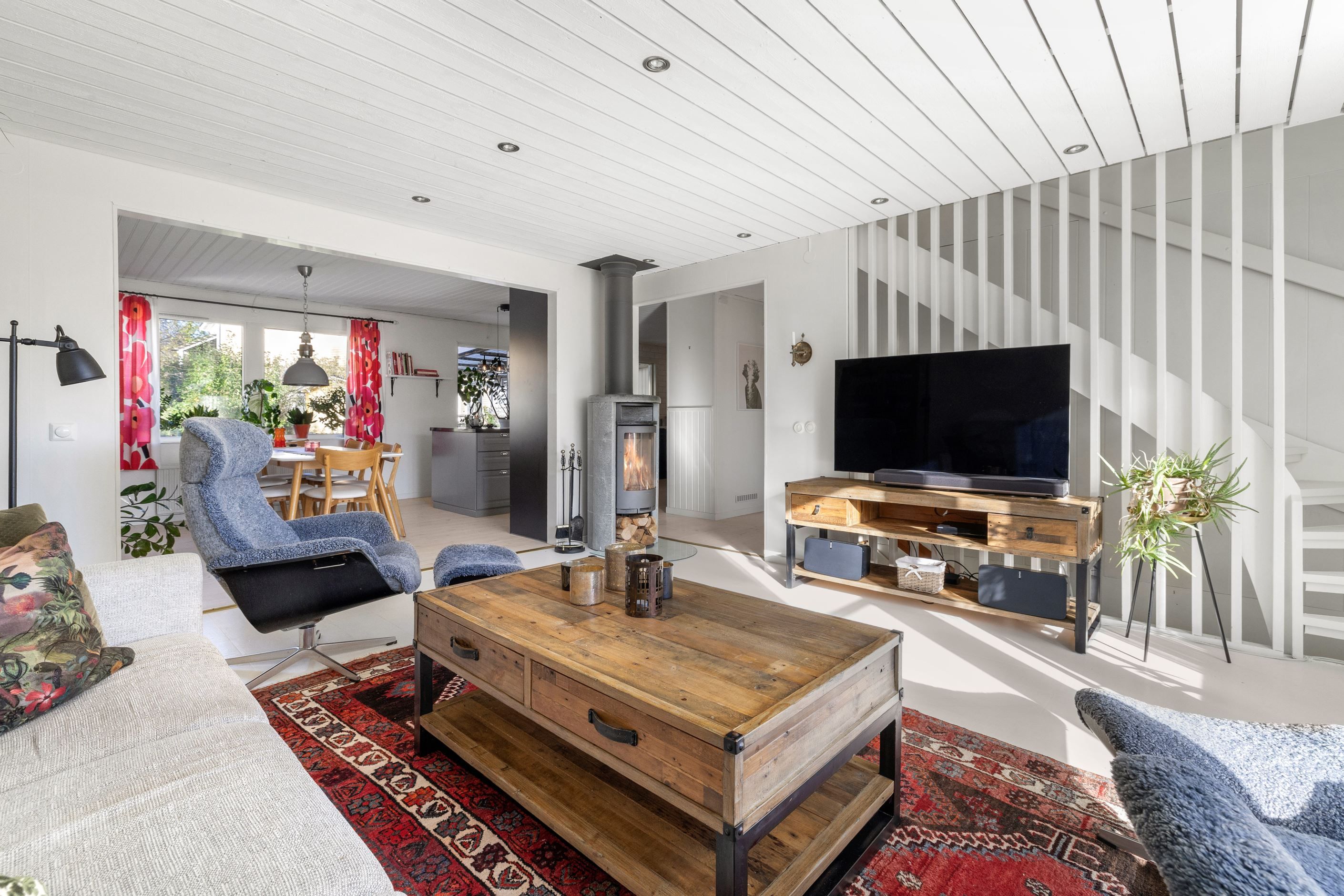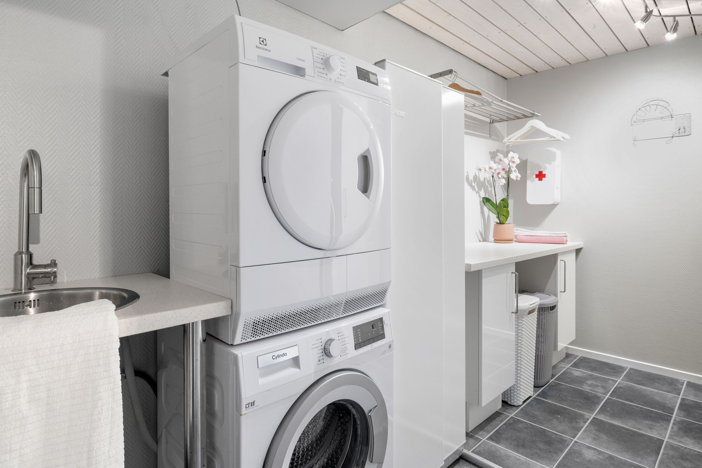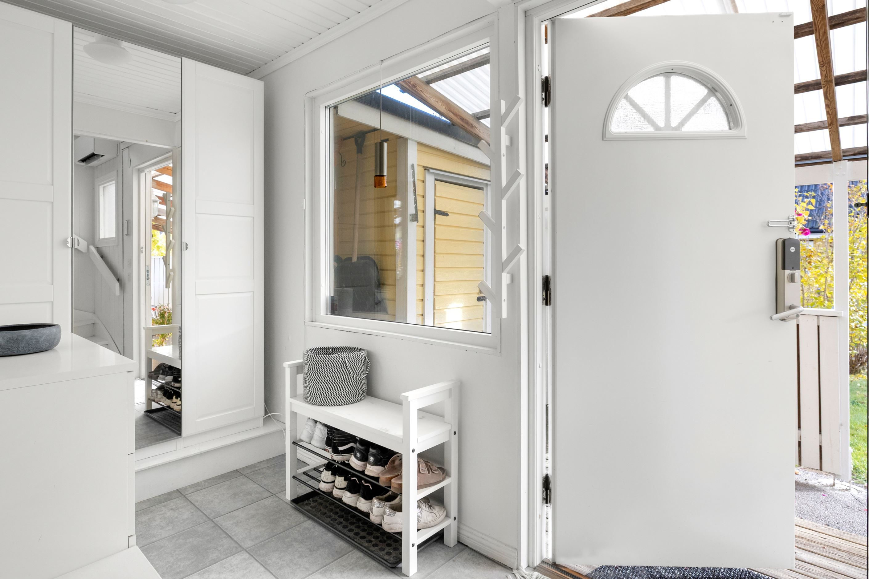 Huset om ca 194 kvm fördelat på tre plan är generöst tilltaget och erbjuder en välplanerad planlösning med plats för både sociala ytor och privata rum. Mellanplanet är hemmets hjärta, där det påkostade Puustelli-köket med exklusiv stenskiva och köksö öppnar upp mot matplats och vardagsrum. Här sprider sig ljuset genom stora fönster och den stämningsfulla täljstenskaminen blir en naturlig mittpunkt under årets kalla dagar. Från vardagsrummet nås också trädgården som bjuder in till middagar, lek och lata sommarkvällar.