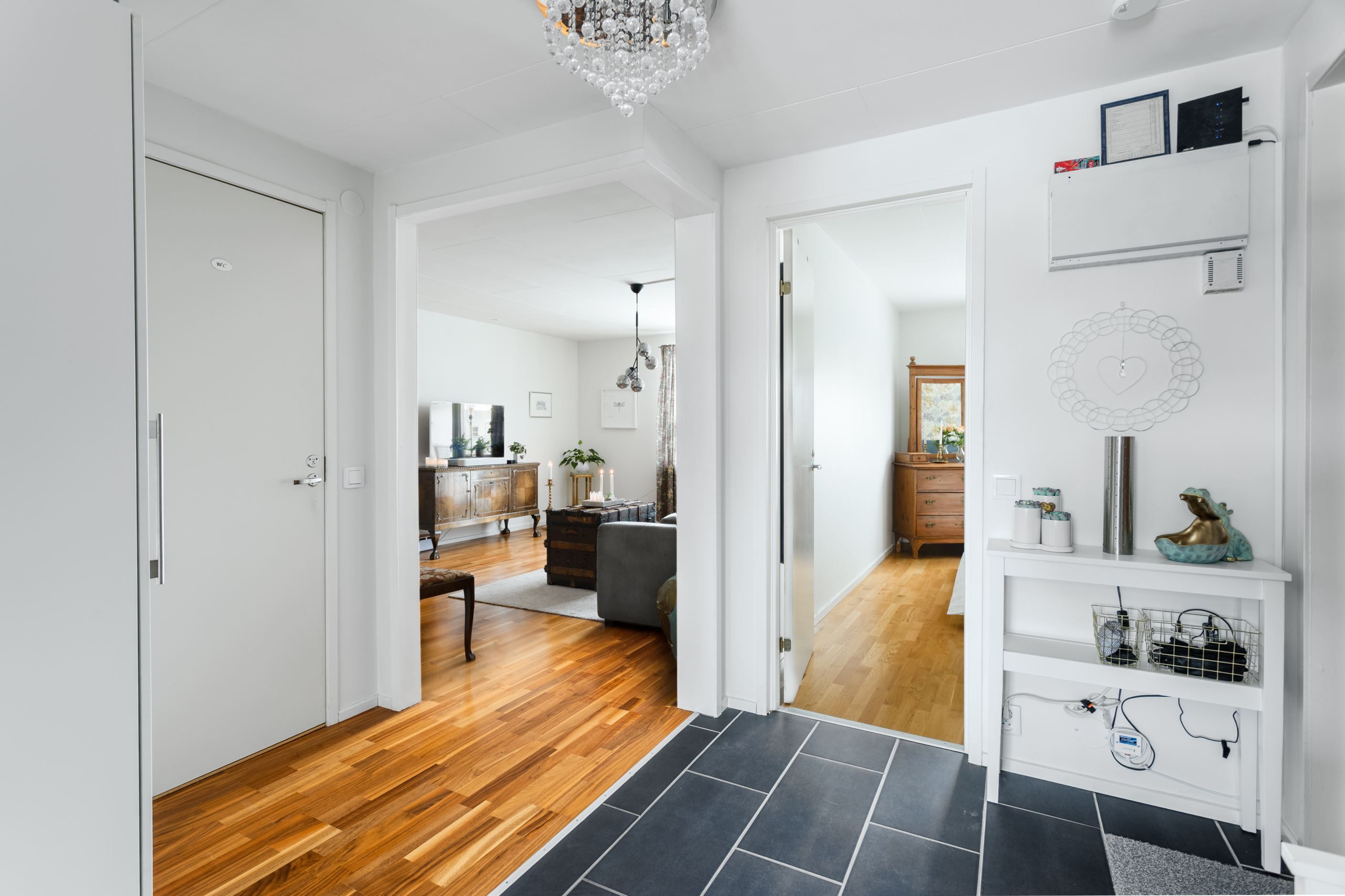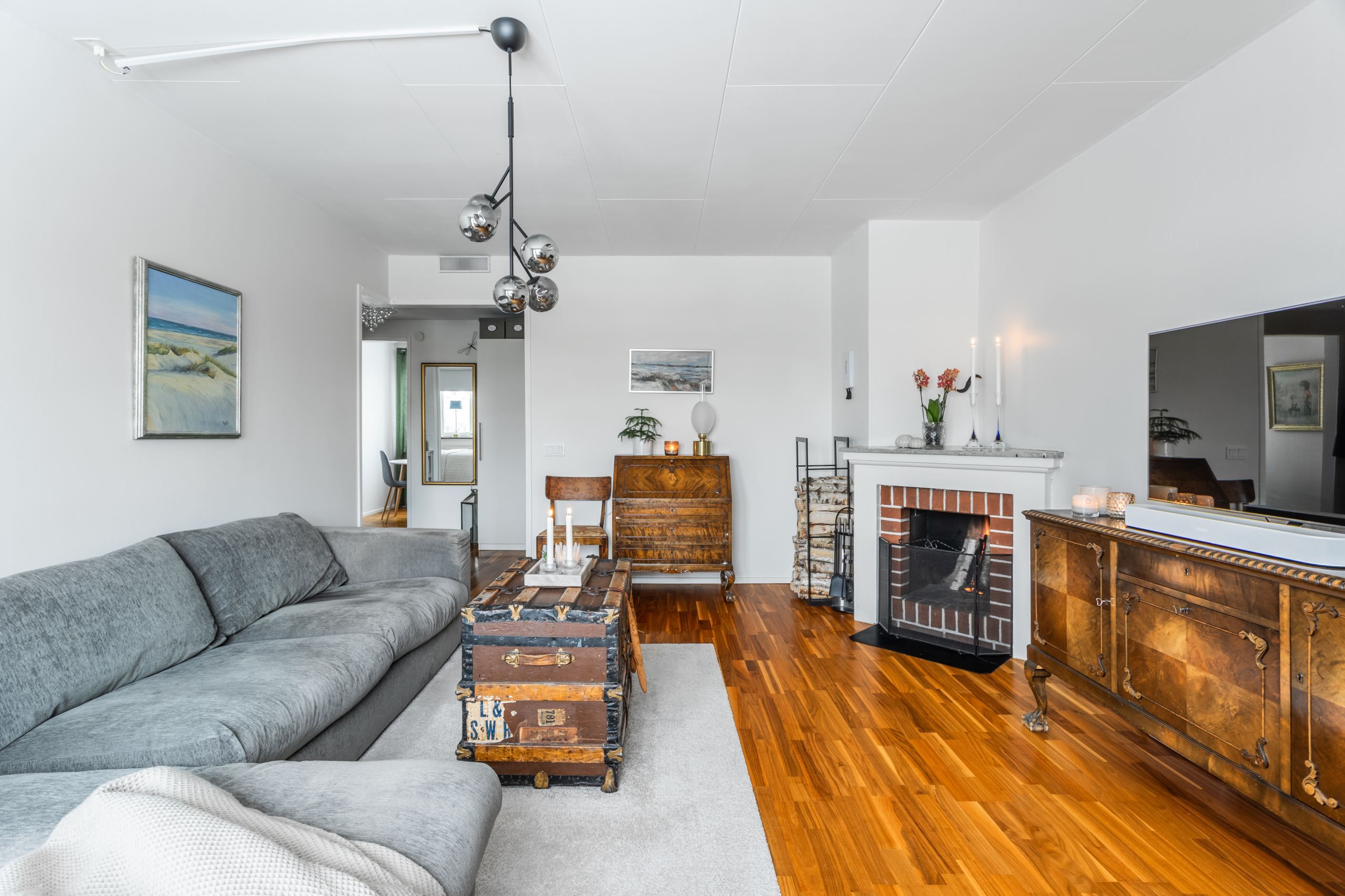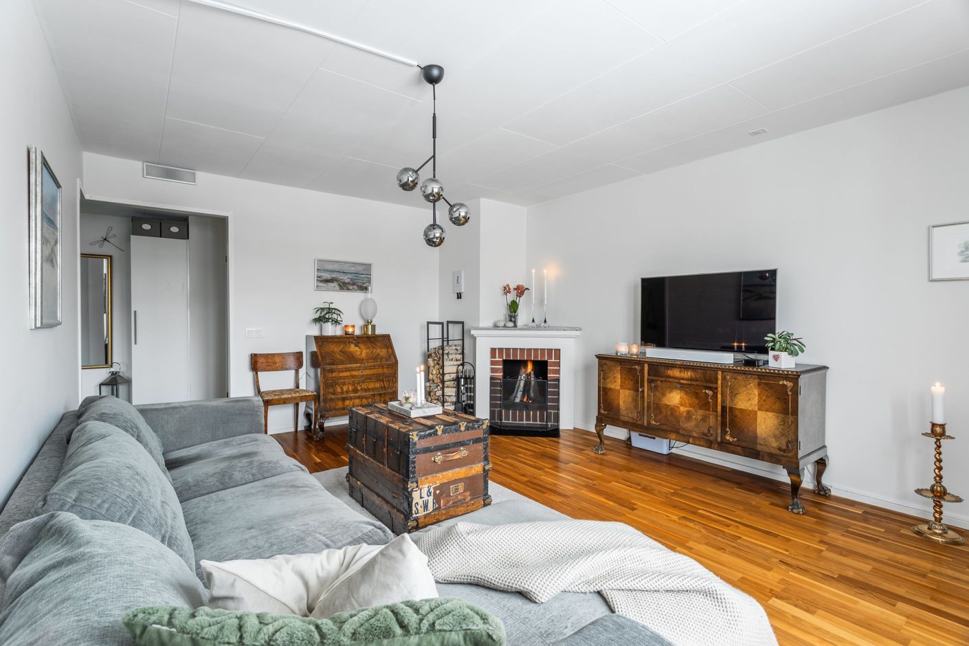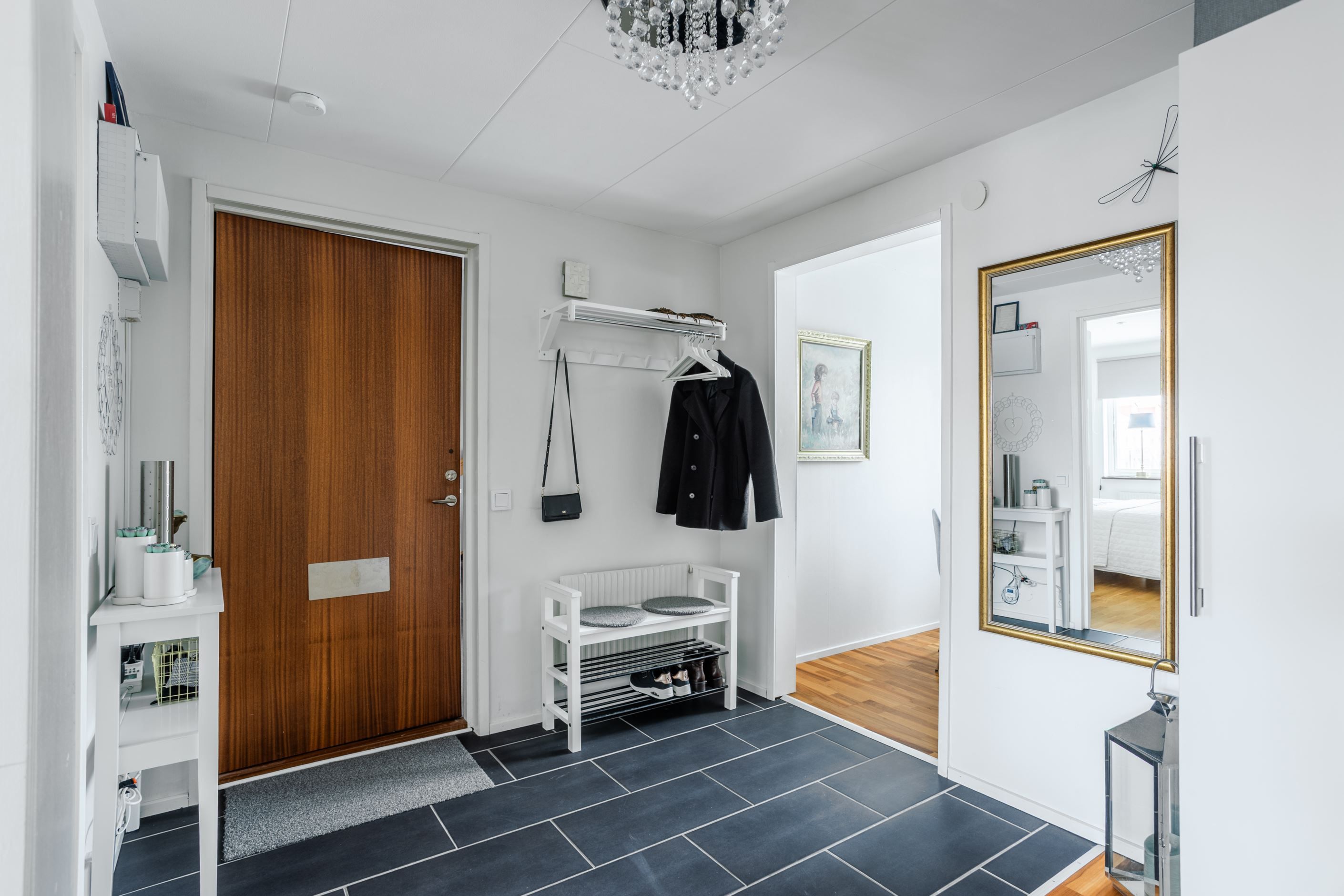 Du möts av en rymlig hall med lättskött klinker på golvet. Till höger finns det rymliga sovrummet med god garderobsförvaring och vardagsrummet med utgång till balkong i soligt läge – perfekt för morgonkaffet eller kvällshänget. Här finns även en vacker öppen spis som skapar extra mysfaktor under årets kallare månader. Det renoverade köket från 2019 med uppdaterade vitvaror ligger beläget till vänster i hallen och är generöst tilltaget och utrustat med kyl/frys, diskmaskin, spis, ugn och fläkt – gott om plats för både vardagsmatlagning och middagsbjudningar. Här finns även plats för ett matbord med 4-5 stolar. Badrummet är i gott skick med plastmatta och våtrumstapet – praktiskt och lättskött. Både tvättmaskin och torktumlare finns i bostaden vilket underlättar vardagens bestyr.