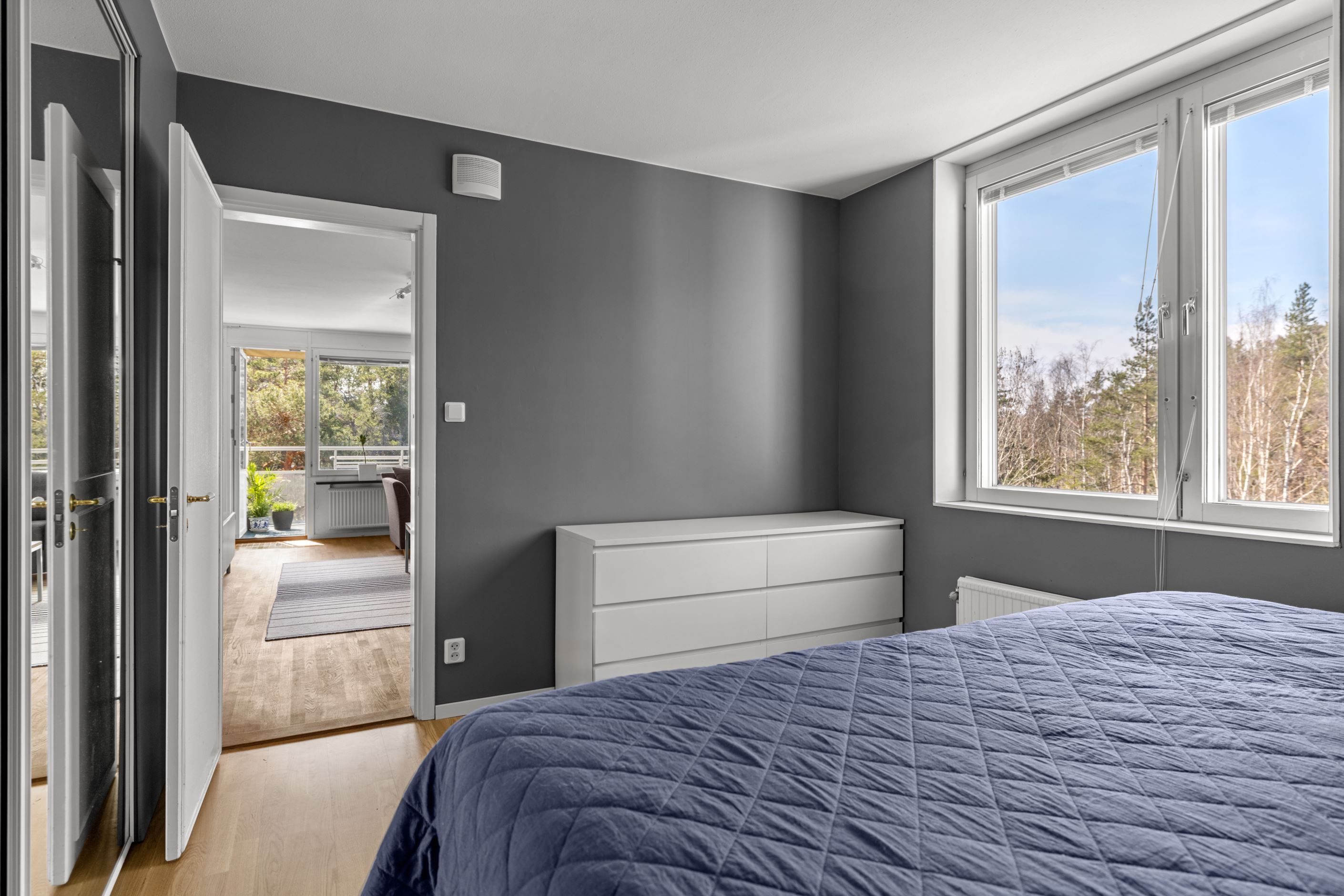 Denna rymliga fyrarummare om 88,5 kvm erbjuder tre bra sovrum och ett generöst vardagsrum med extra fönster tack vare gavelläget. Härifrån nås den stora, trivsamma balkongen i eftertraktat sydvästläge med härlig utsikt mot skog – en perfekt plats för eftermiddags- och kvällssol.