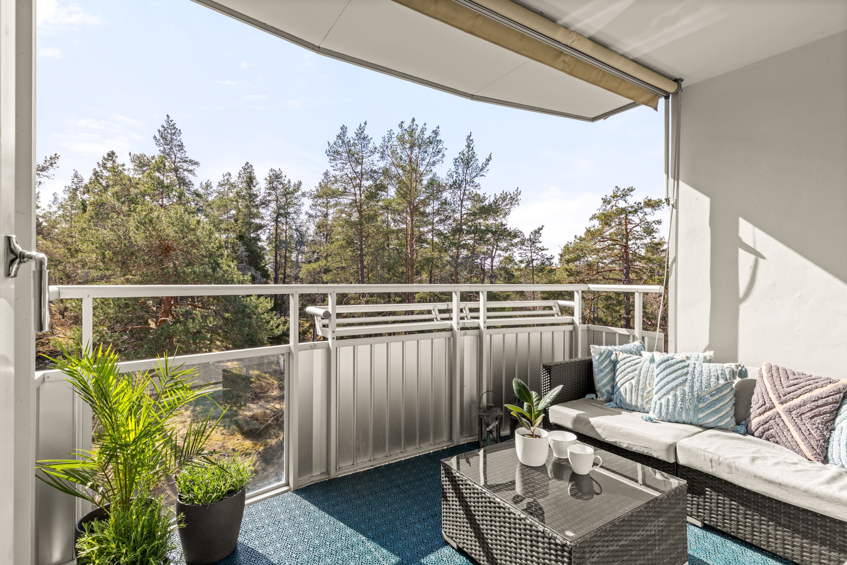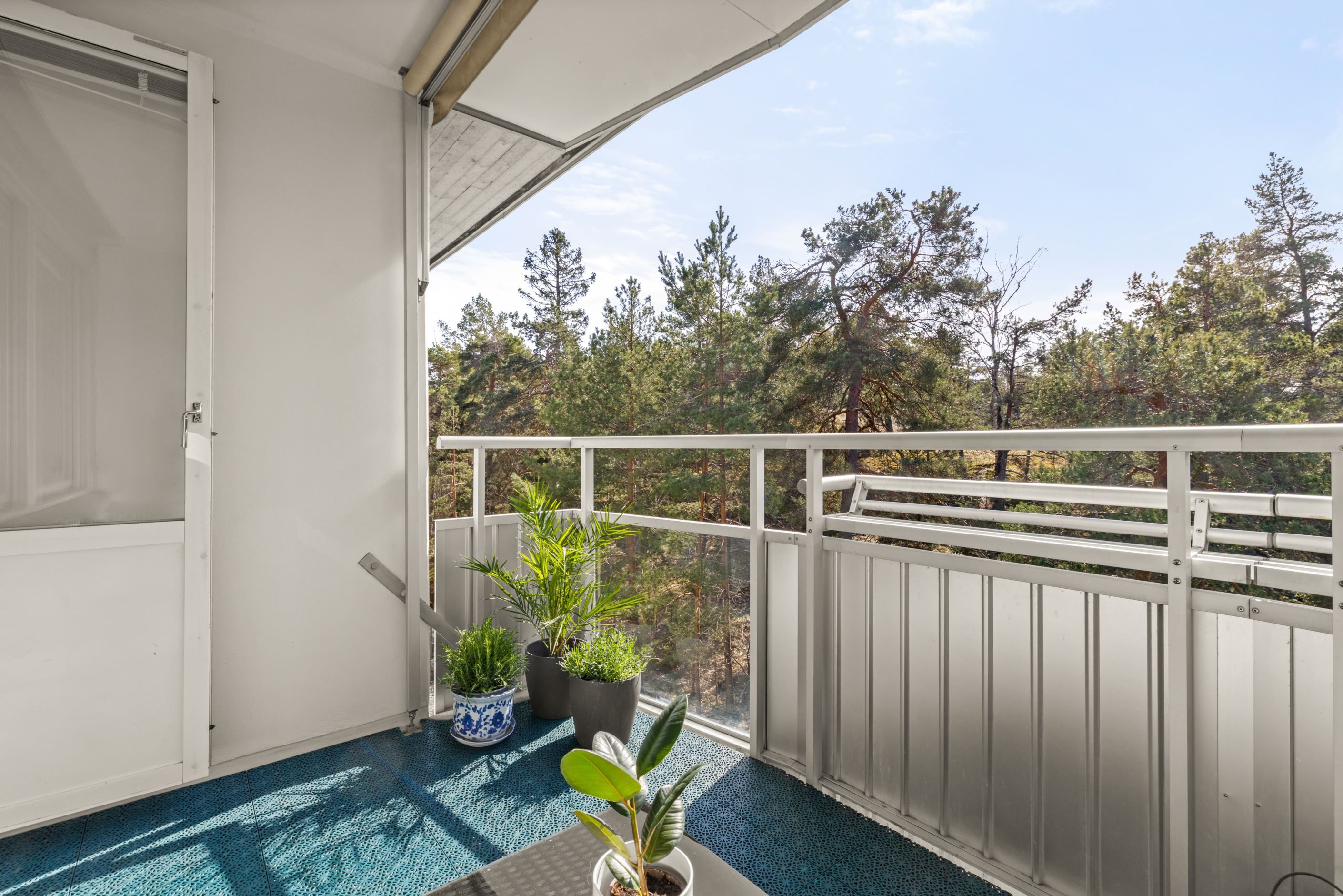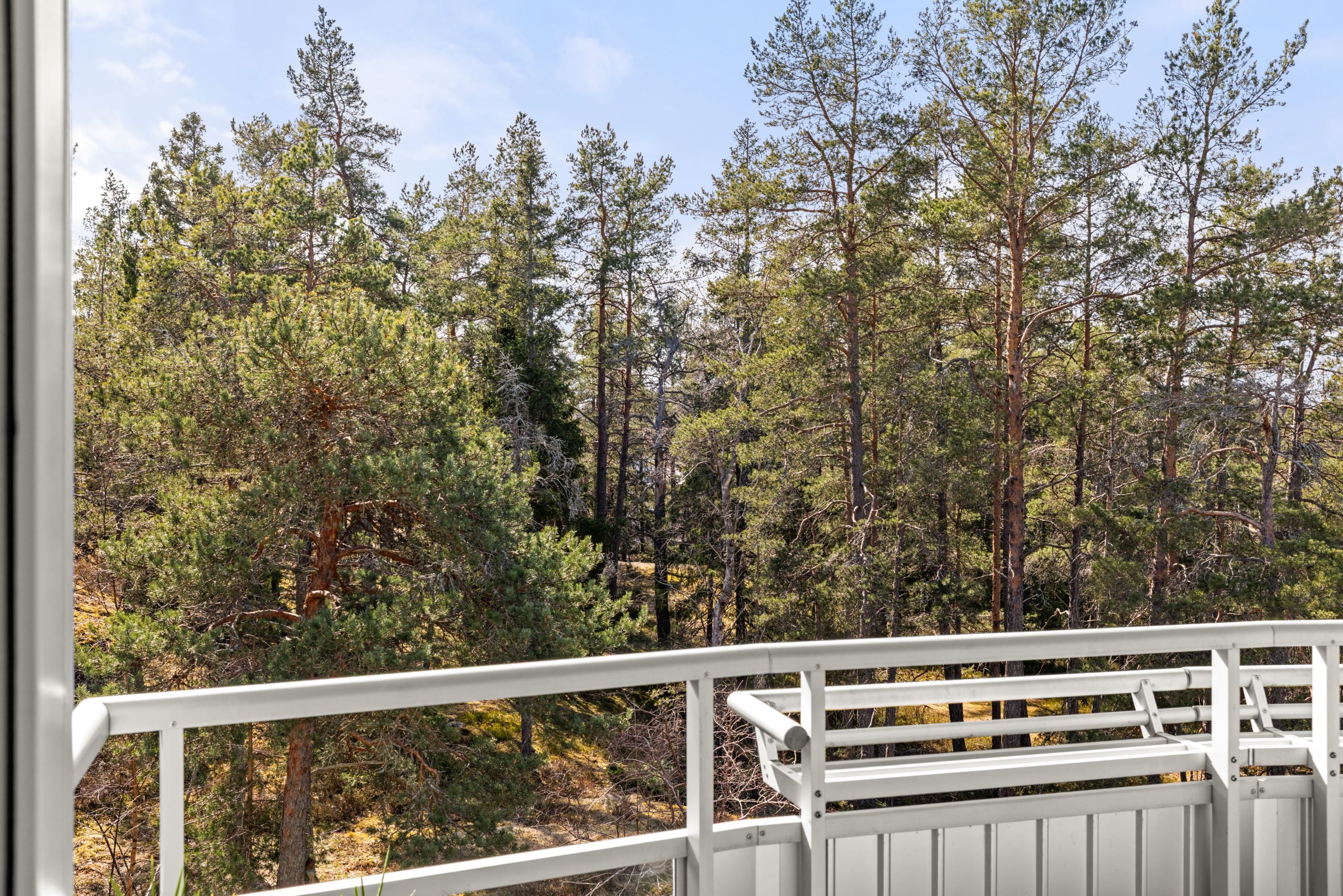 Gavelfyra högst upp med balkong i sydväst och fri utsikt mot skog
