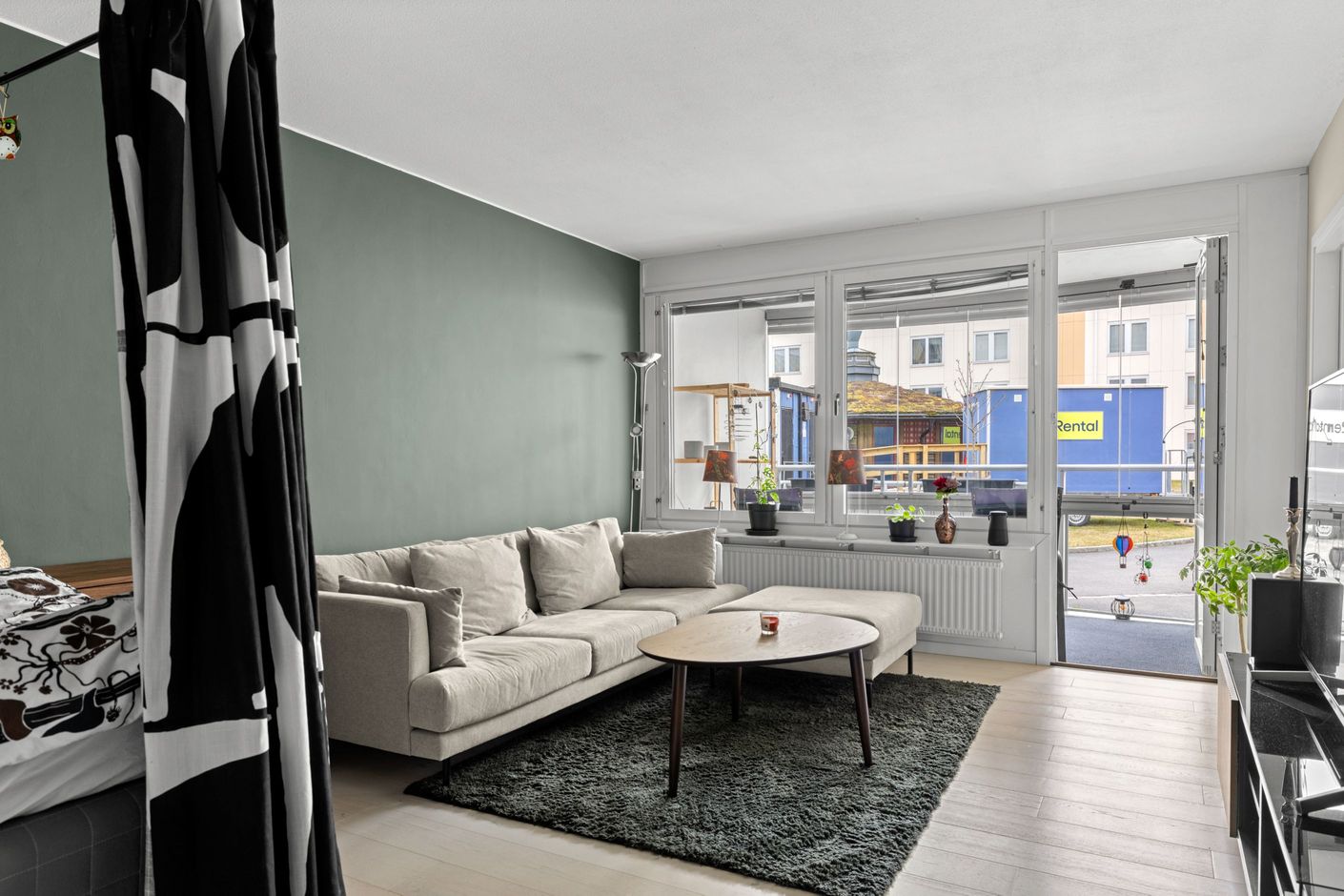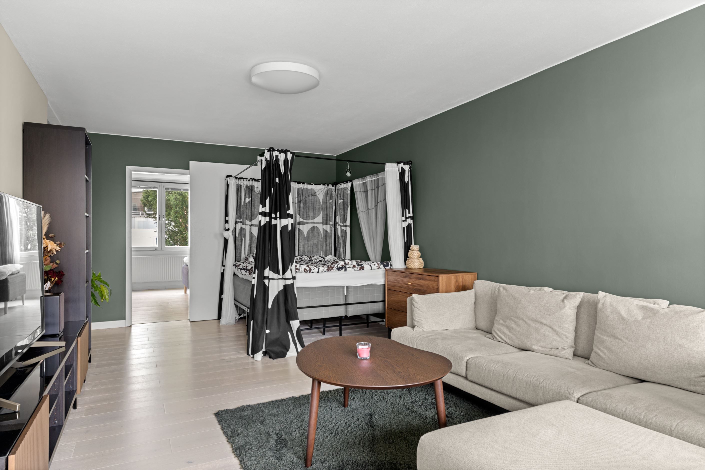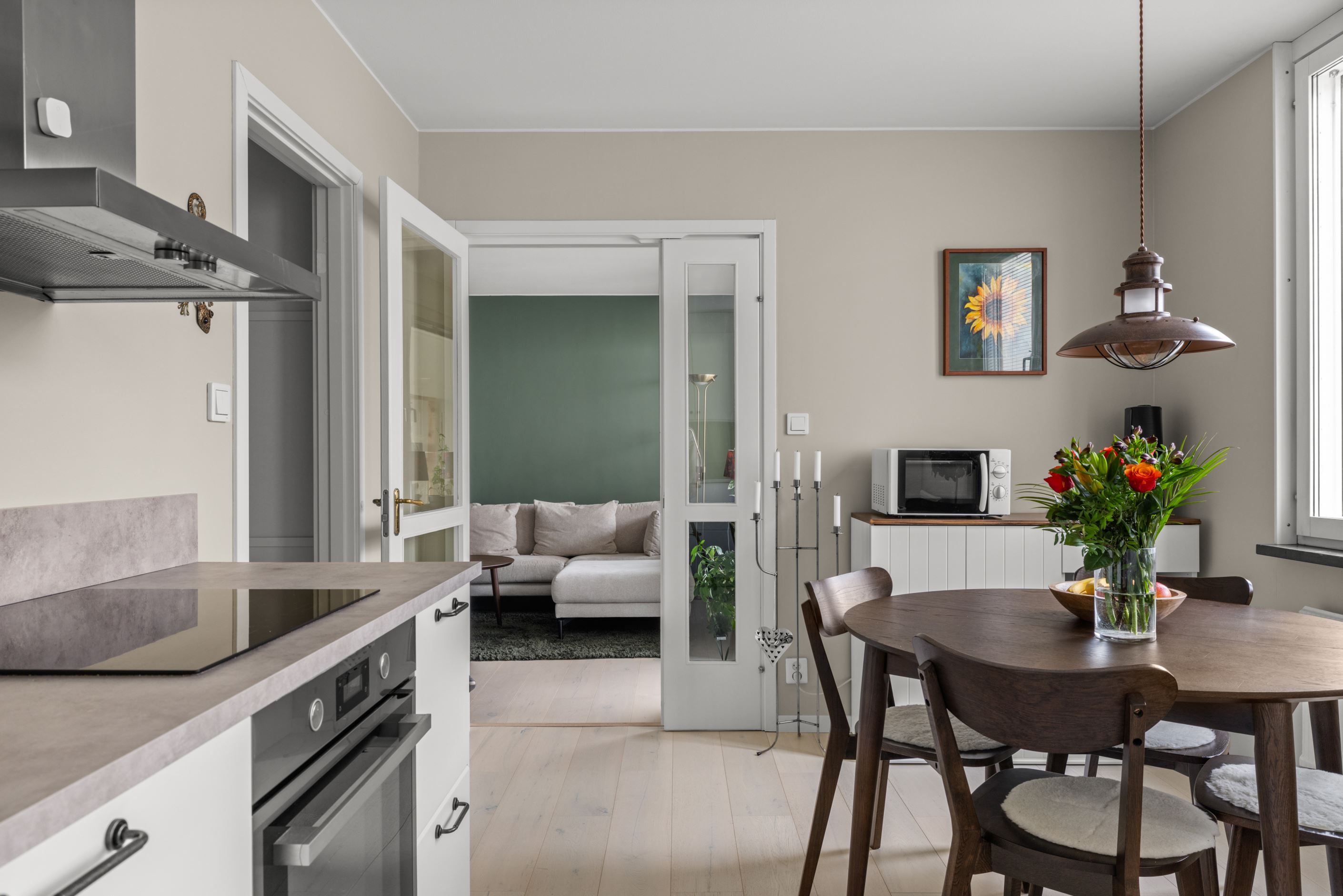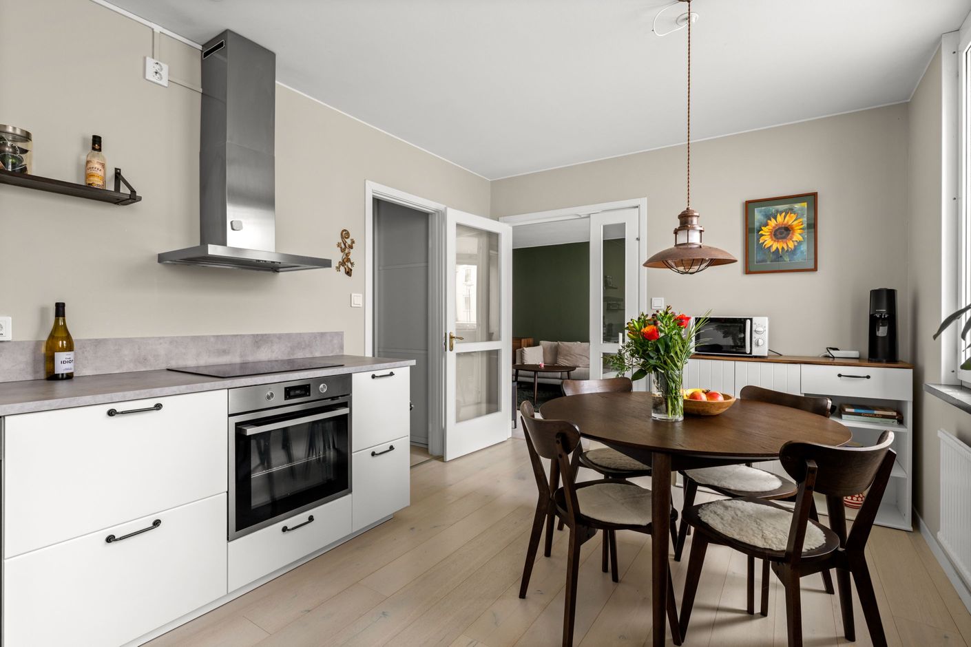Det moderna köket, renoverat 2021, är både funktionellt och socialt med gott om plats för matgrupp – en naturlig samlingspunkt för både vardag och middagar med vänner. Vardagsrummet är generöst tilltaget och rymmer enkelt både soffgrupp och matsalsdel, med en flexibel sovalkov som extra bonus.