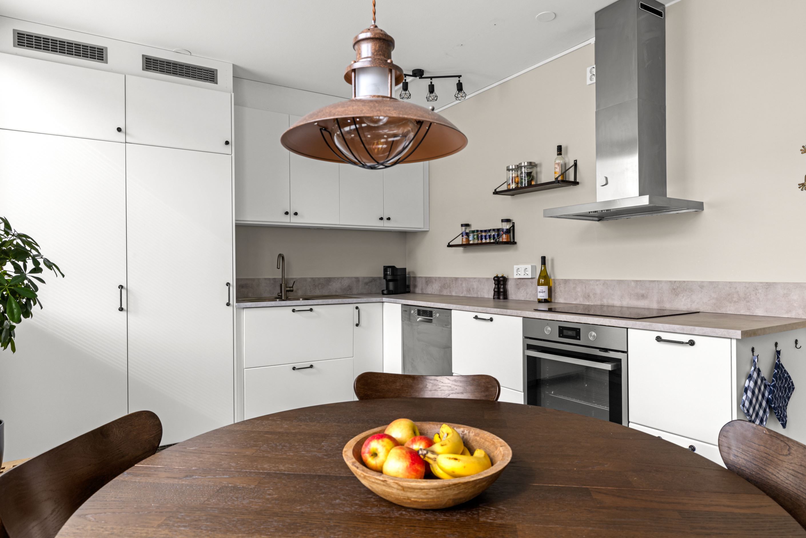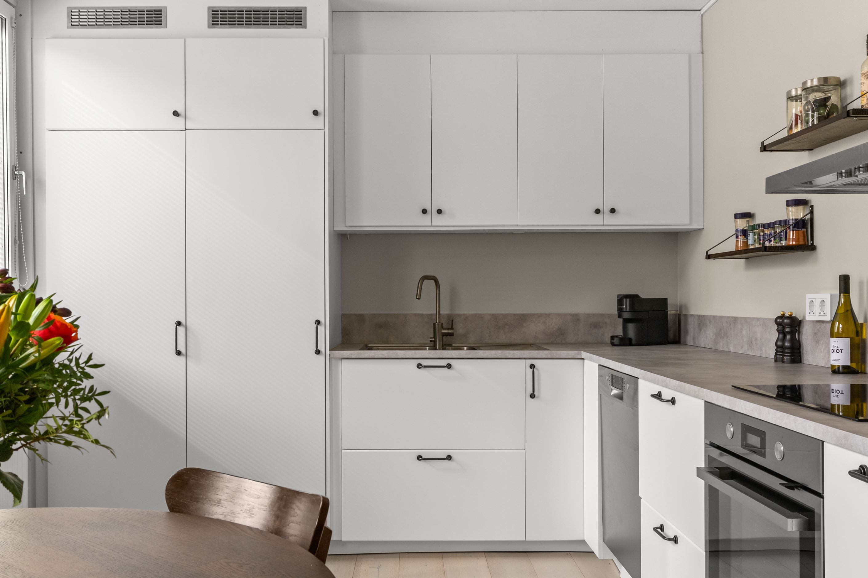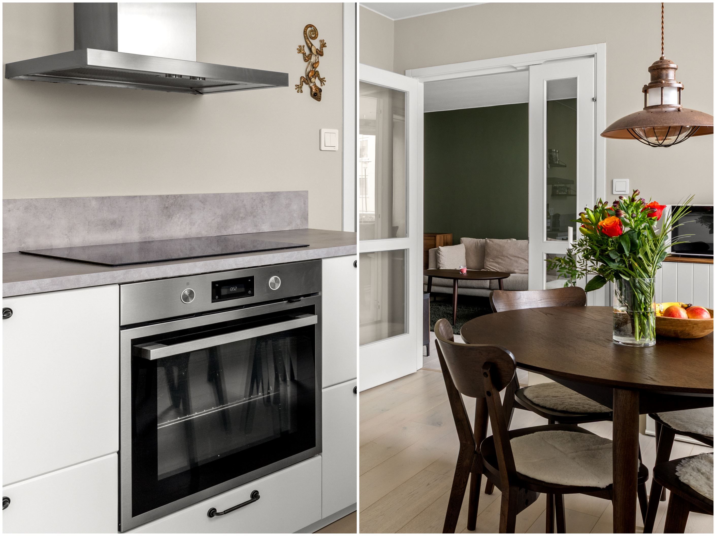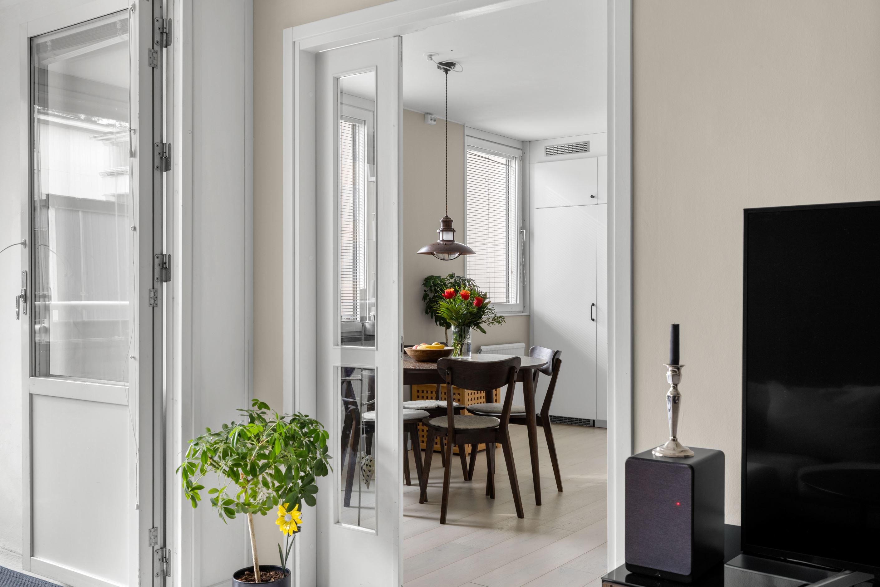 Det moderna köket, renoverat 2021, är både funktionellt och socialt med gott om plats för matgrupp – en naturlig samlingspunkt för både vardag och middagar med vänner. Vardagsrummet är generöst tilltaget och rymmer enkelt både soffgrupp och matsalsdel, med en flexibel sovalkov som extra bonus.