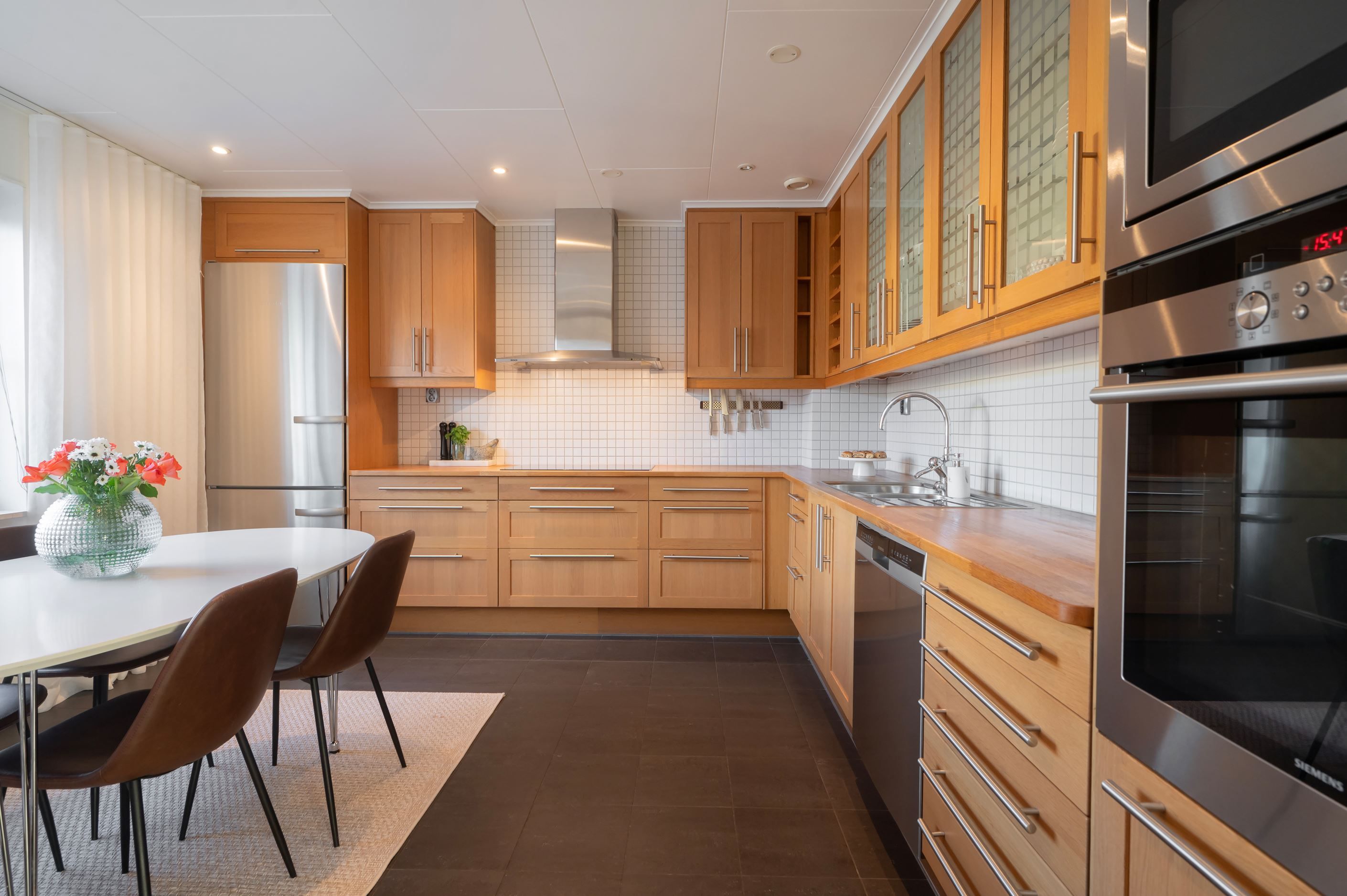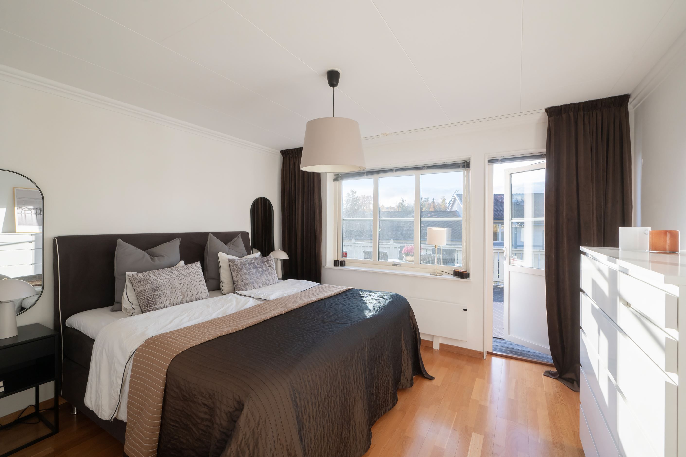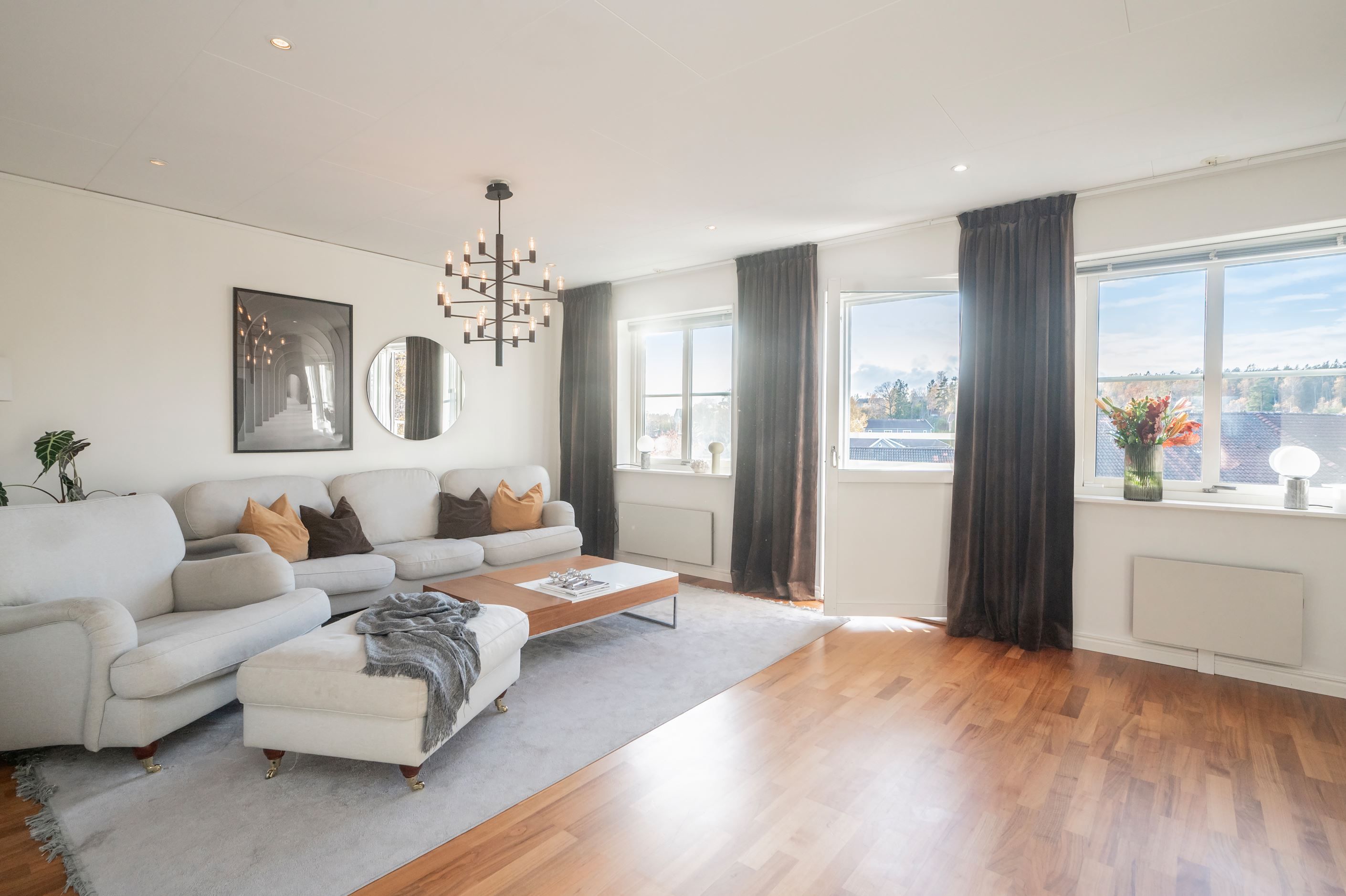 De stora fönsterpartierna ger ett härligt ljusinsläpp och skapar en luftig och inbjudande känsla i hela hemmet. Här möts ni av smakfulla materialval, fina sociala ytor och genomgående parkettgolv som tillsammans ger bostaden dess unika karaktär.