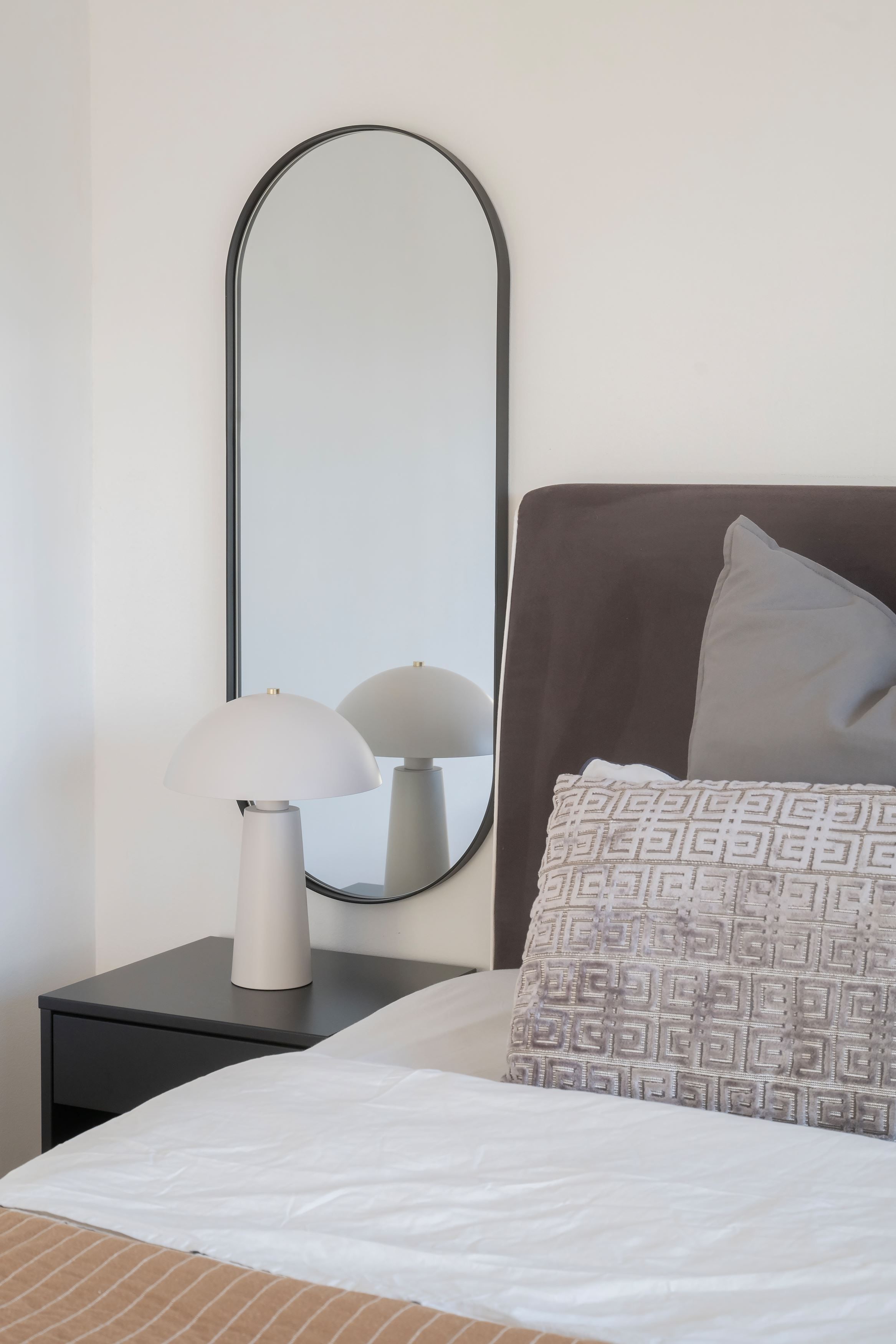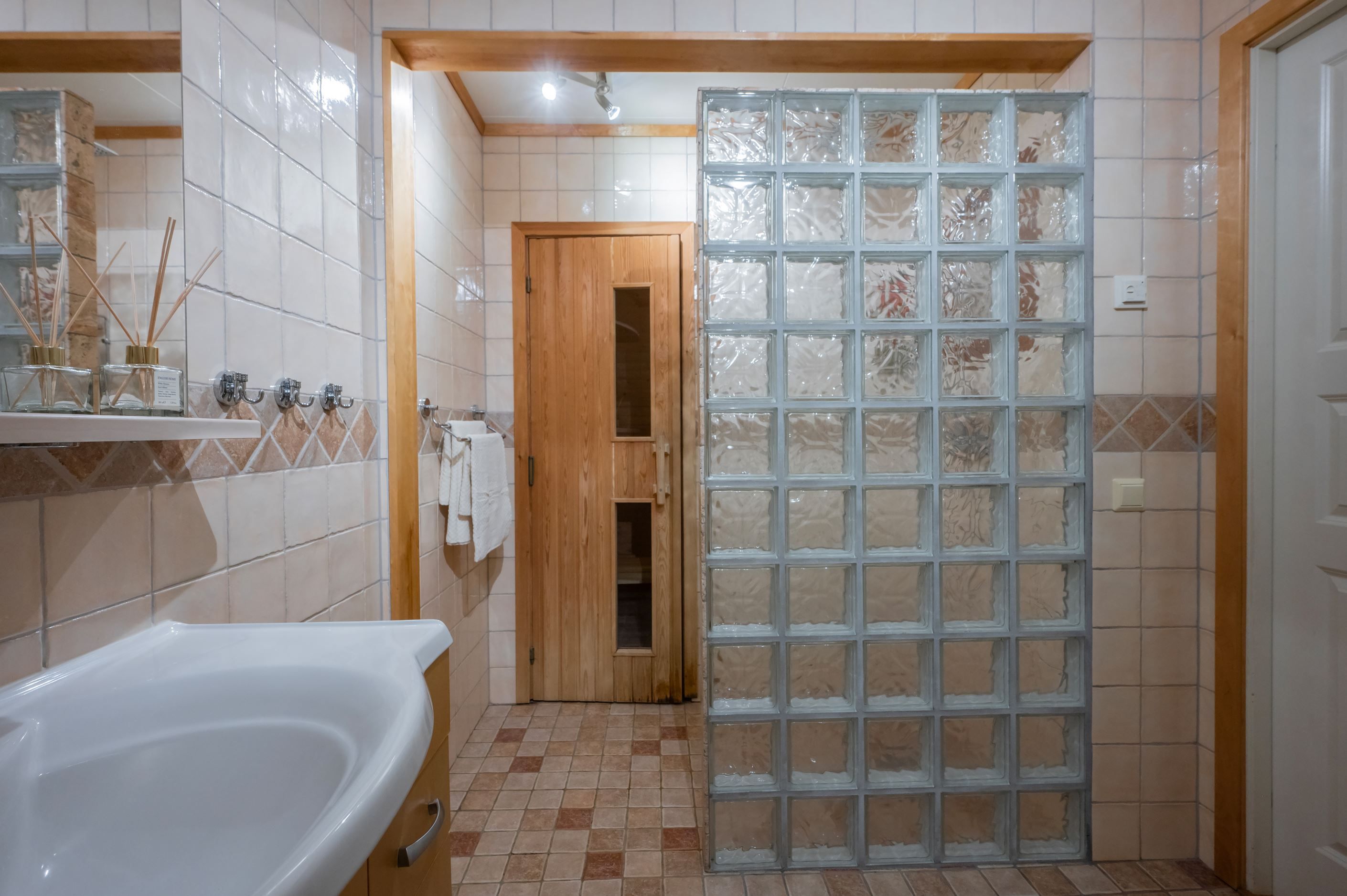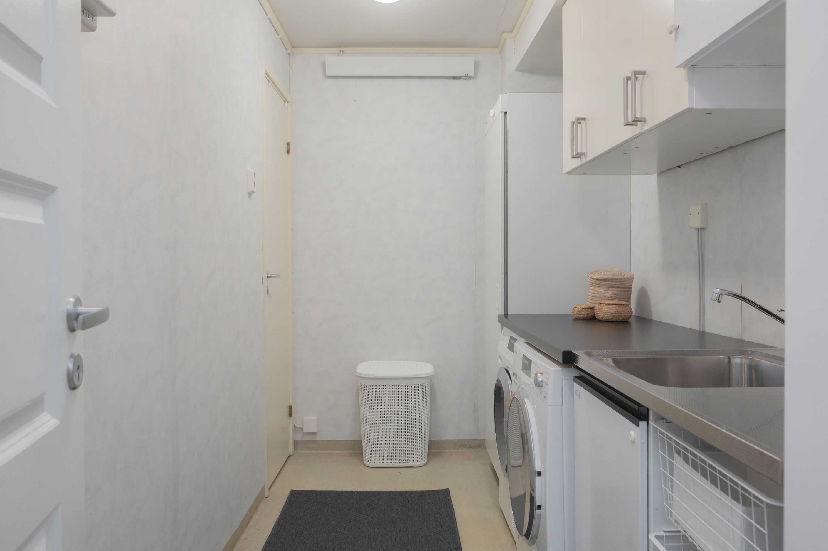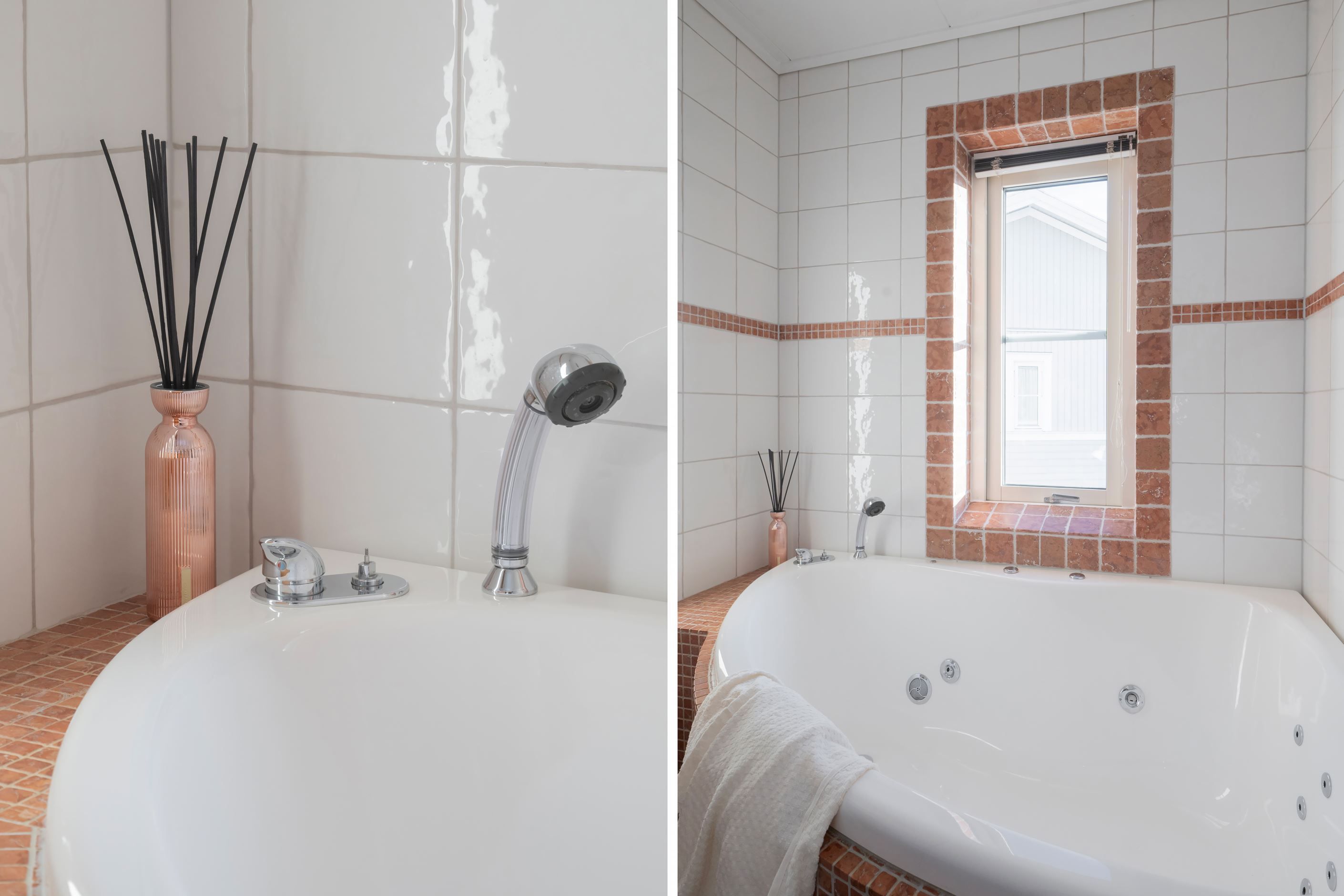 Villan erbjuder två stilrena, helkaklade badrum, ett med dusch och bastu samt ett med badkar. Här finns även en separat tvättstuga för extra bekvämlighet. På framsidan möts ni av en mysig uteplats med utrymme för odling, lek och sociala stunder.