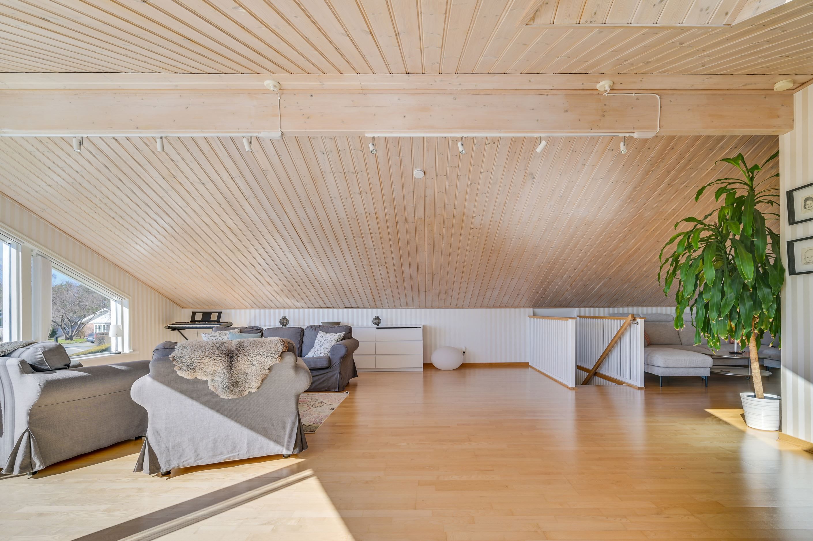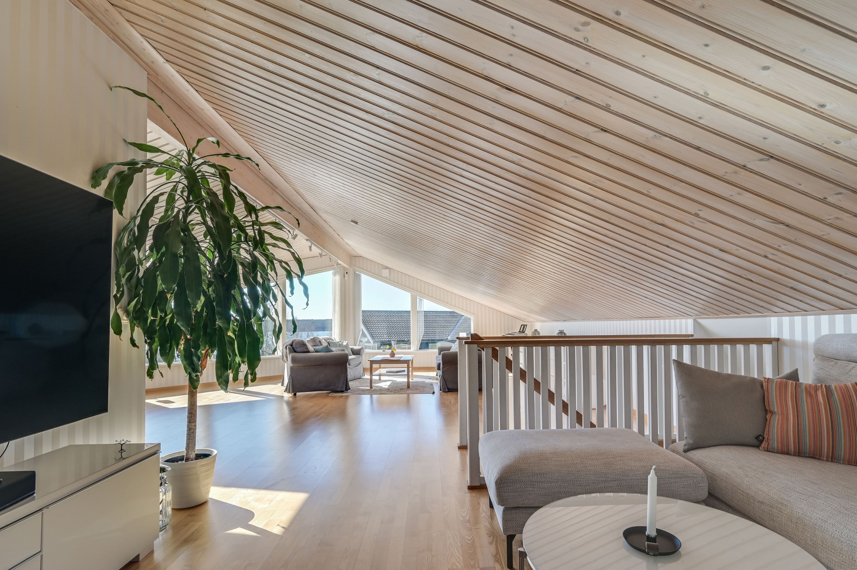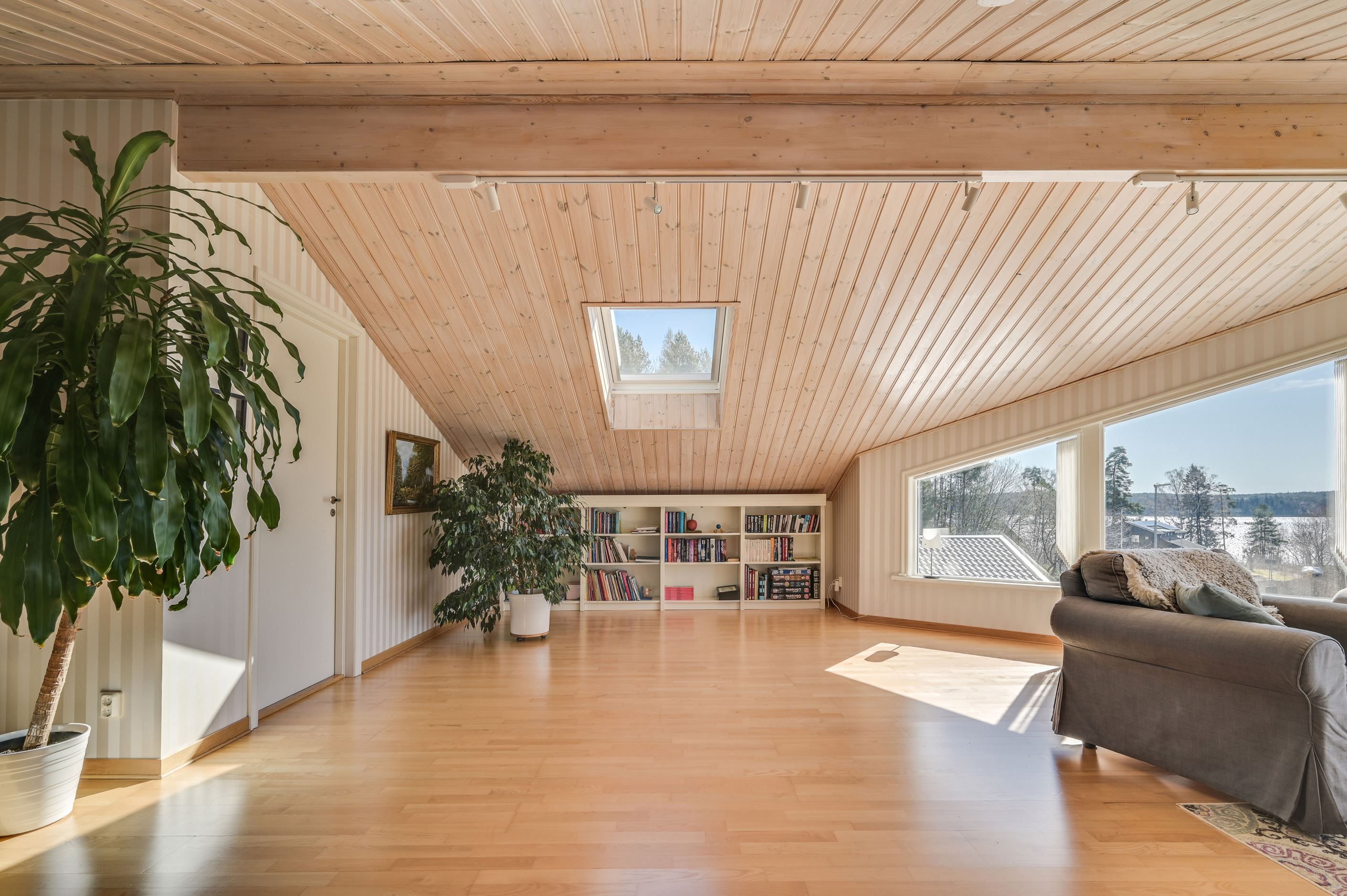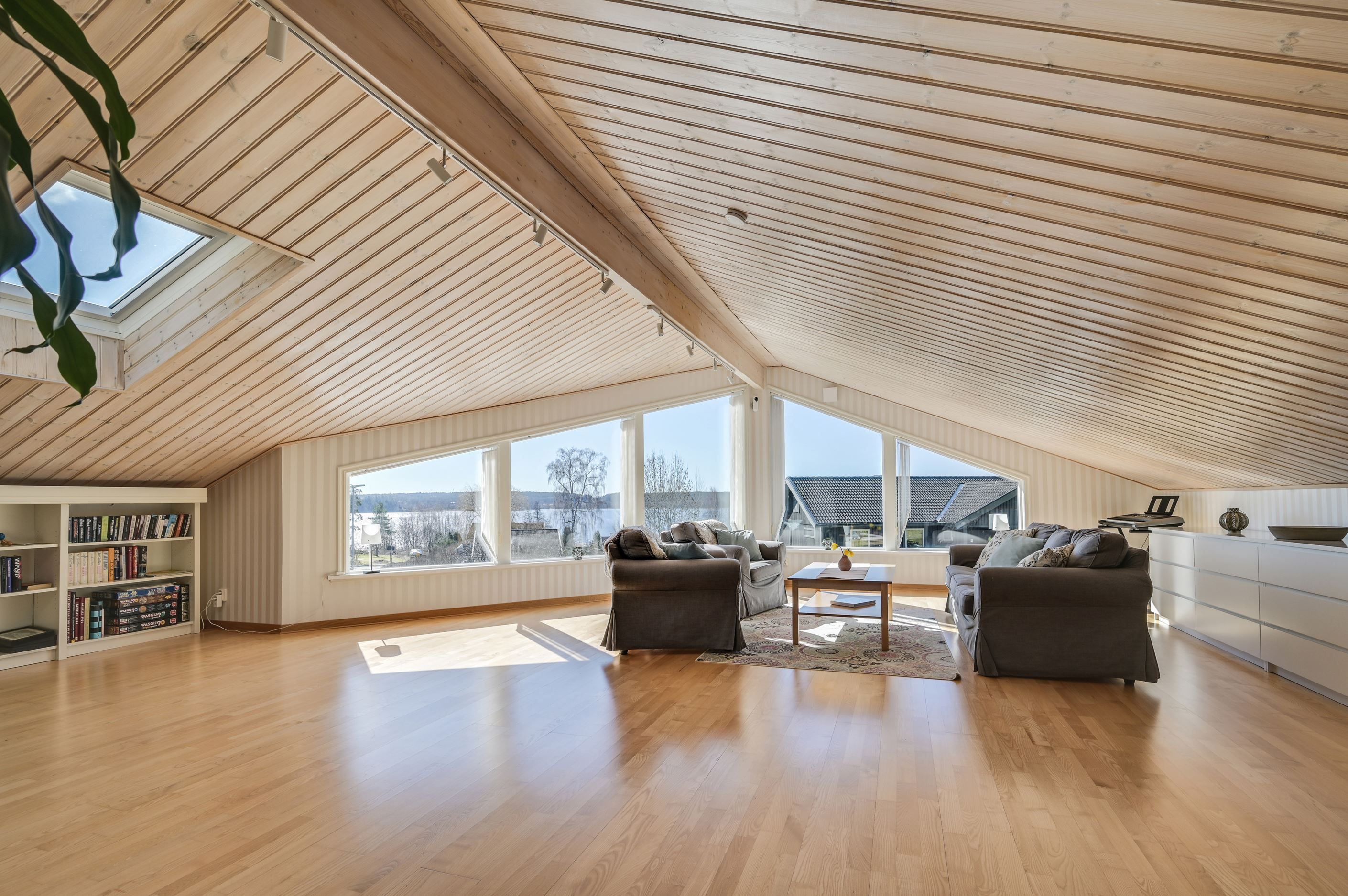 Övre plan erbjuder en imponerande, öppen yta med stora fönsterpartier och vacker vy mot Mälaren. Här finns ytterligare ett sovrum samt en TV-hörna, med möjlighet att skapa ännu ett sovrum för den som önskar.