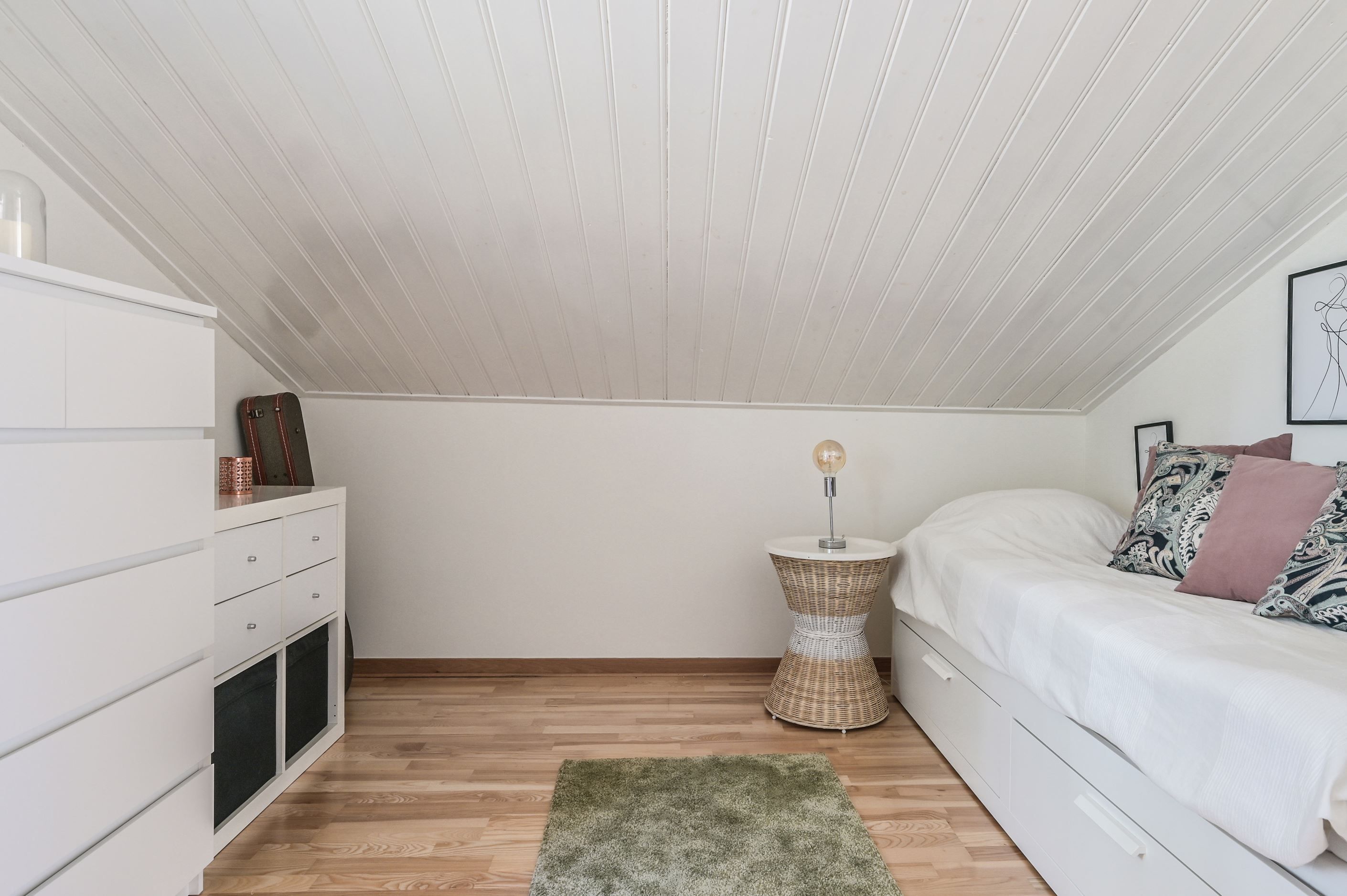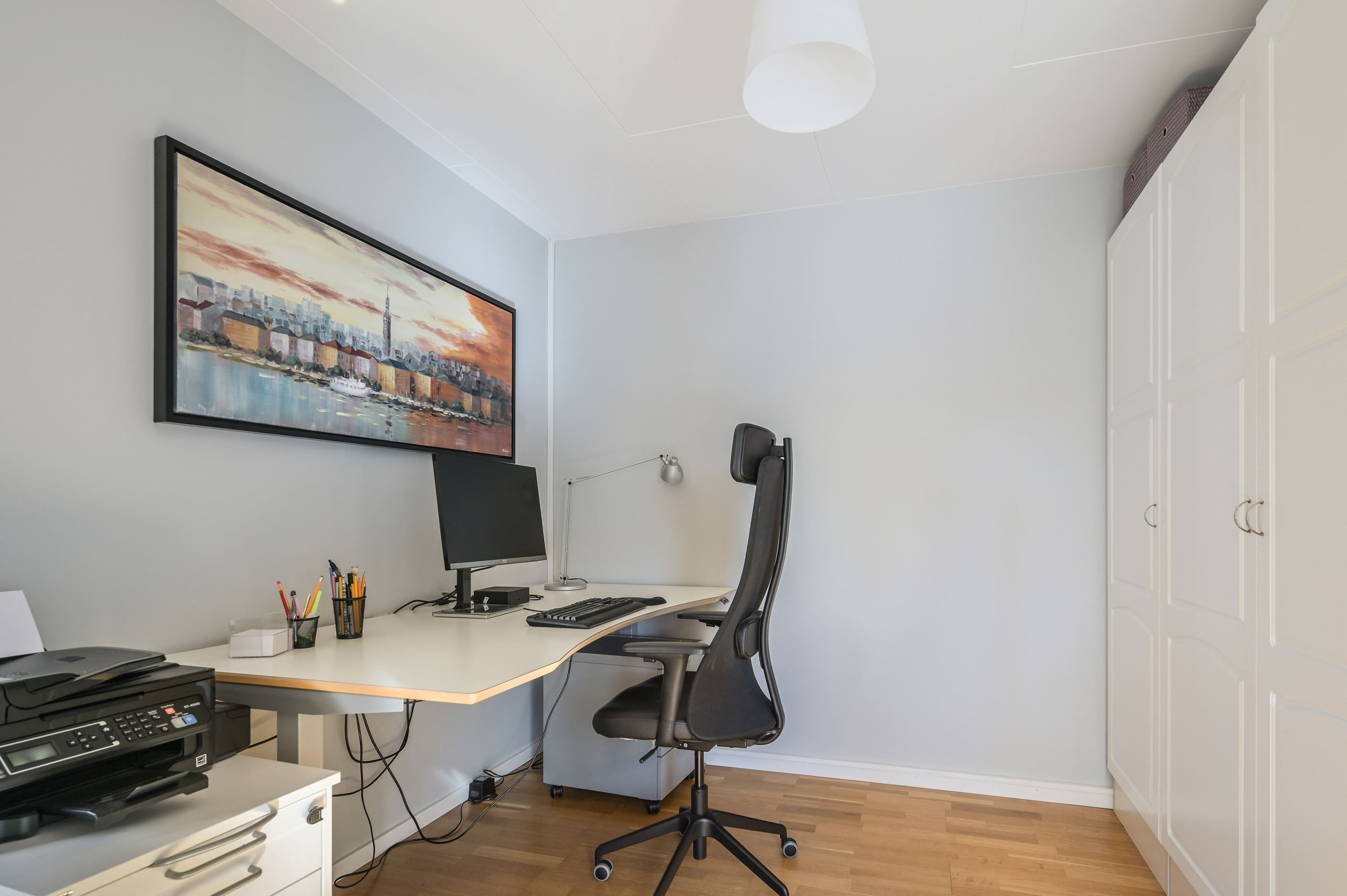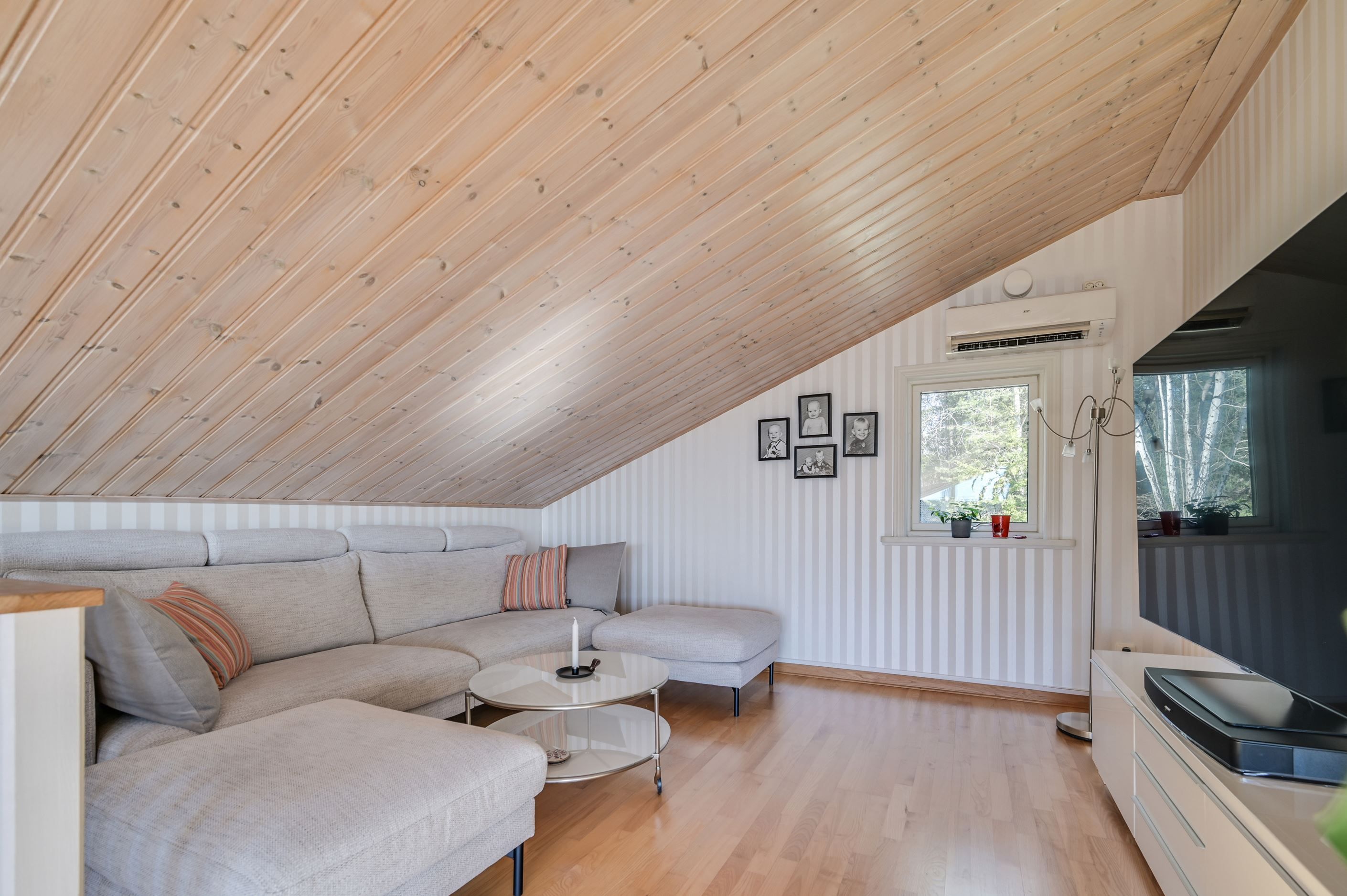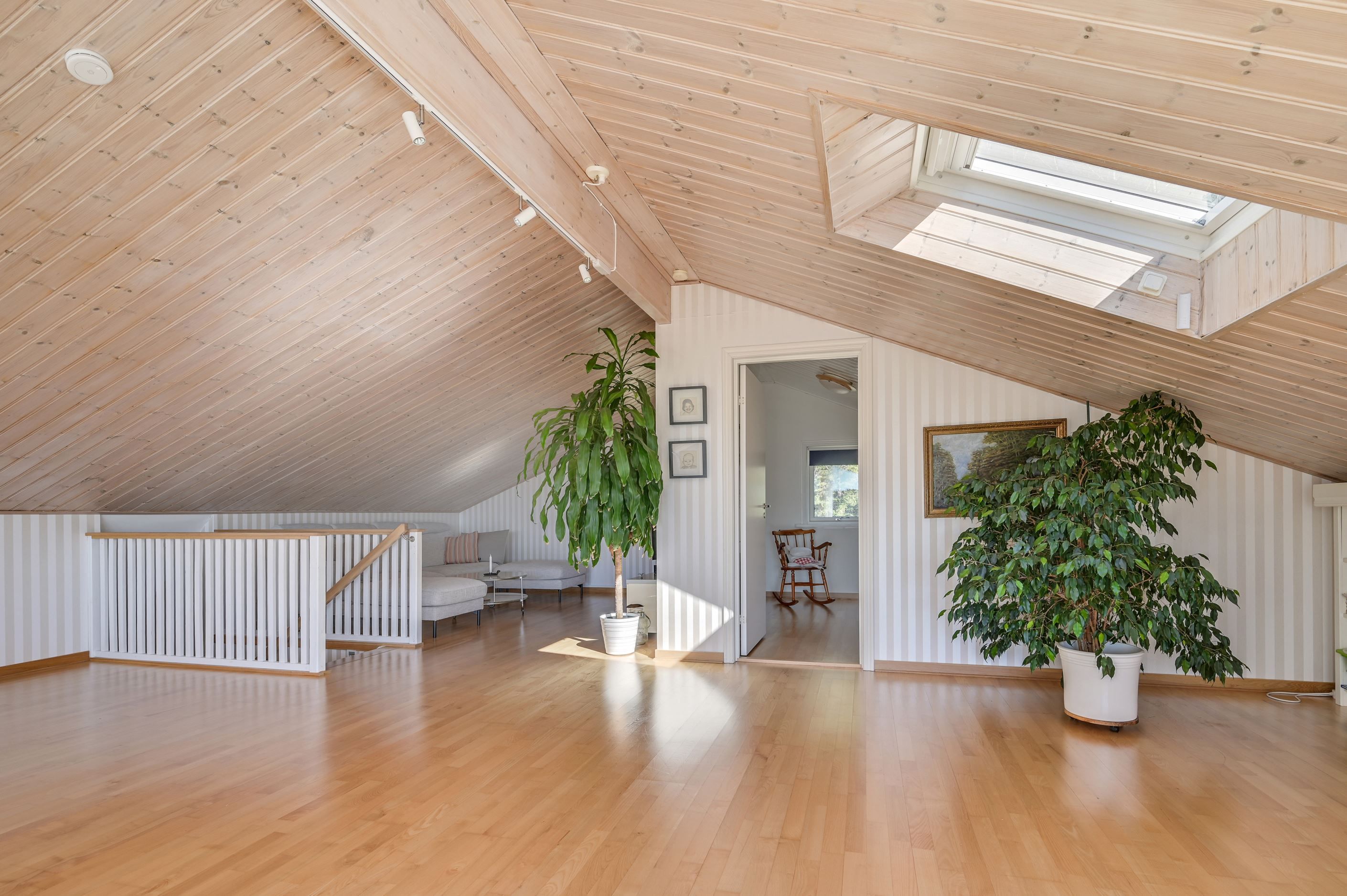 Övre plan erbjuder en imponerande, öppen yta med stora fönsterpartier och vacker vy mot Mälaren. Här finns ytterligare ett sovrum samt en TV-hörna, med möjlighet att skapa ännu ett sovrum för den som önskar.