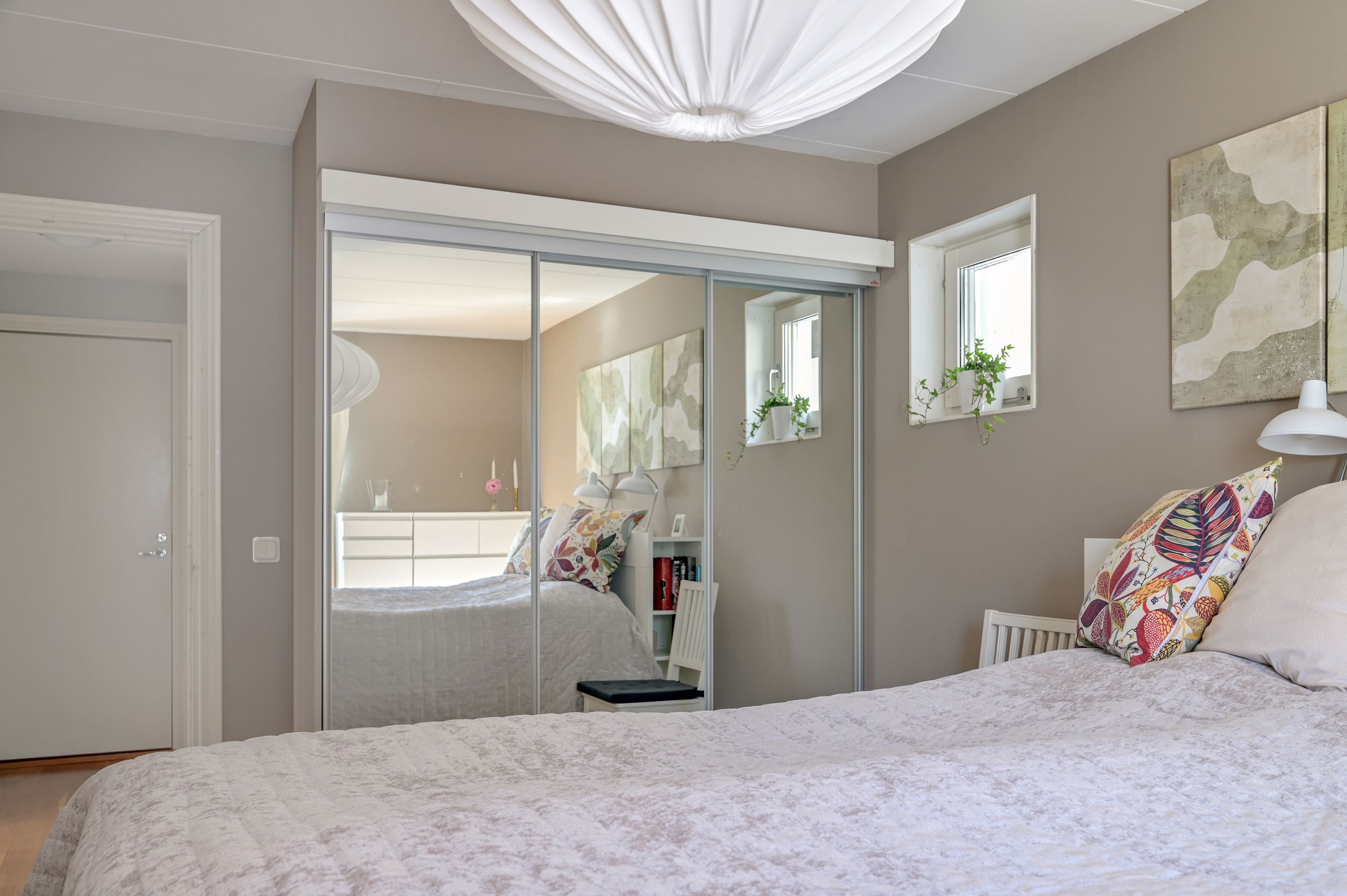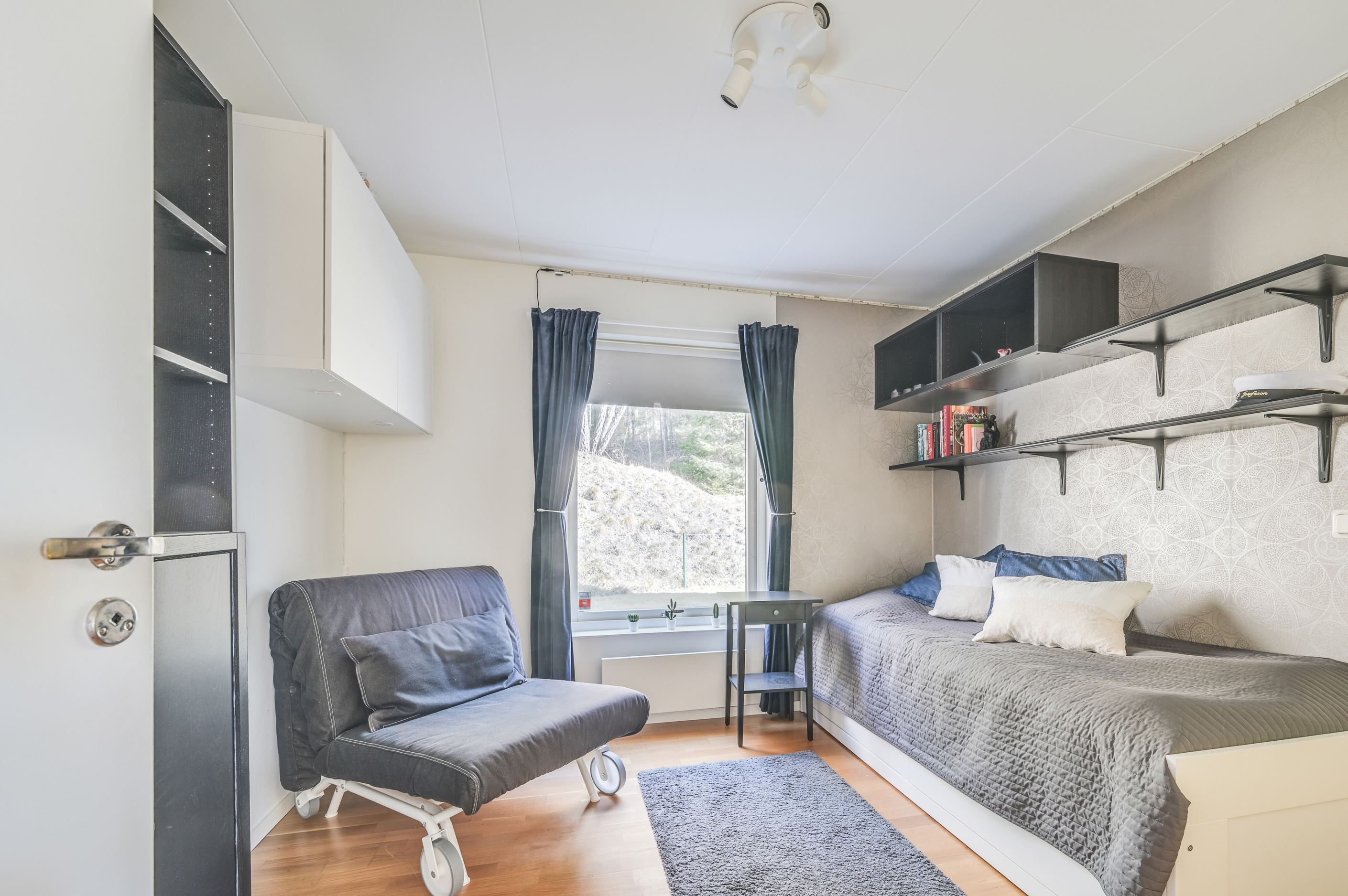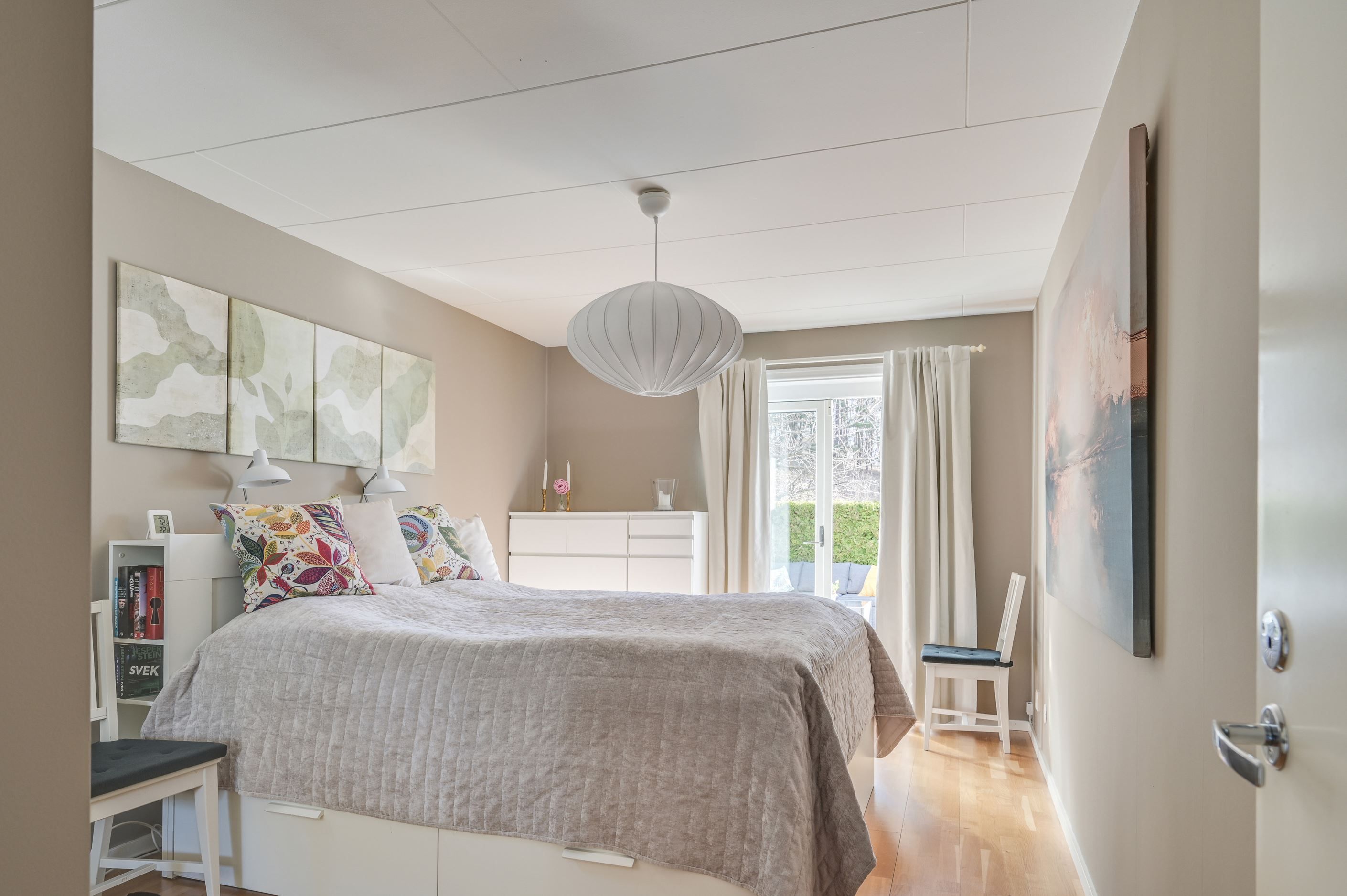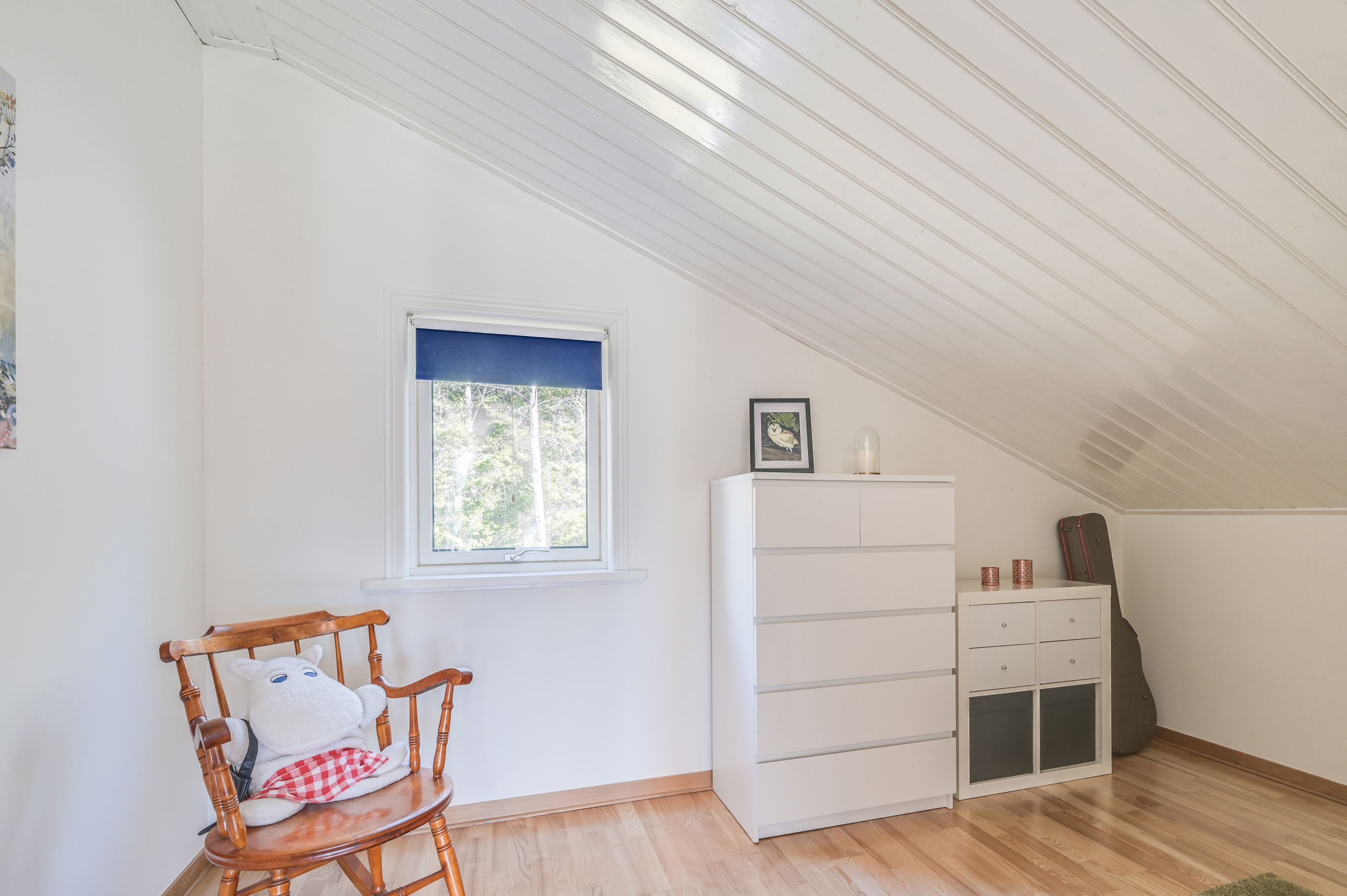 Övre plan erbjuder en imponerande, öppen yta med stora fönsterpartier och vacker vy mot Mälaren. Här finns ytterligare ett sovrum samt en TV-hörna, med möjlighet att skapa ännu ett sovrum för den som önskar.