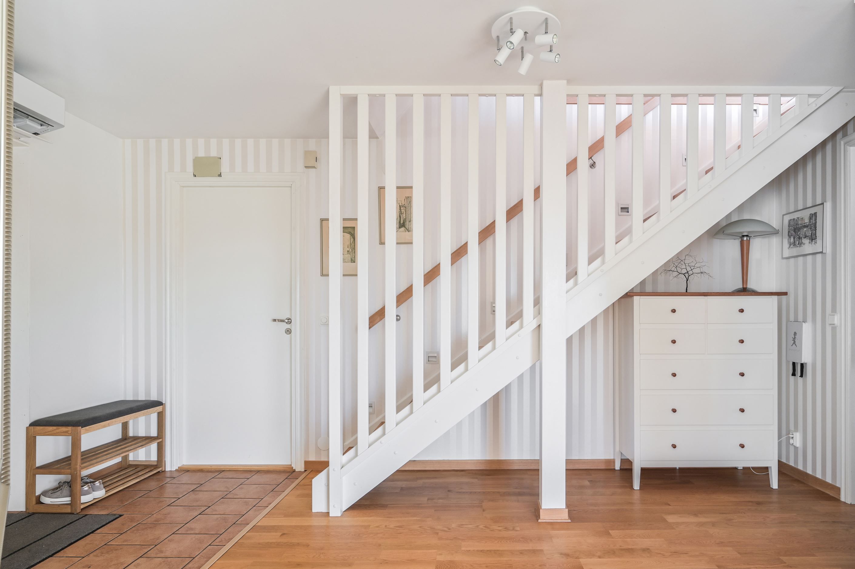 Entréplanet präglas av en delvis öppen planlösning där kök och vardagsrum samspelar på ett inbjudande sätt. Det fullt utrustade köket erbjuder goda arbetsytor och ligger i direkt anslutning till de sociala ytorna, vilket skapar en naturlig samlingspunkt. I vardagsrummet bidrar en braskamin till både värme och en härlig mysfaktor. Här finns tre rymliga sovrum samt ett stort, helkaklat badrum och en separat WC. Interiören är genomgående ljus och fräsch med en trivsam atmosfär. Från entréplanet nås en solsäker altan i söderläge – perfekt för långa, avkopplande dagar i solen. Via tvättstugan nås även baksidan, där sommarvatten finns tillgängligt för bevattning och extra bekvämlighet under årets varmare månader.