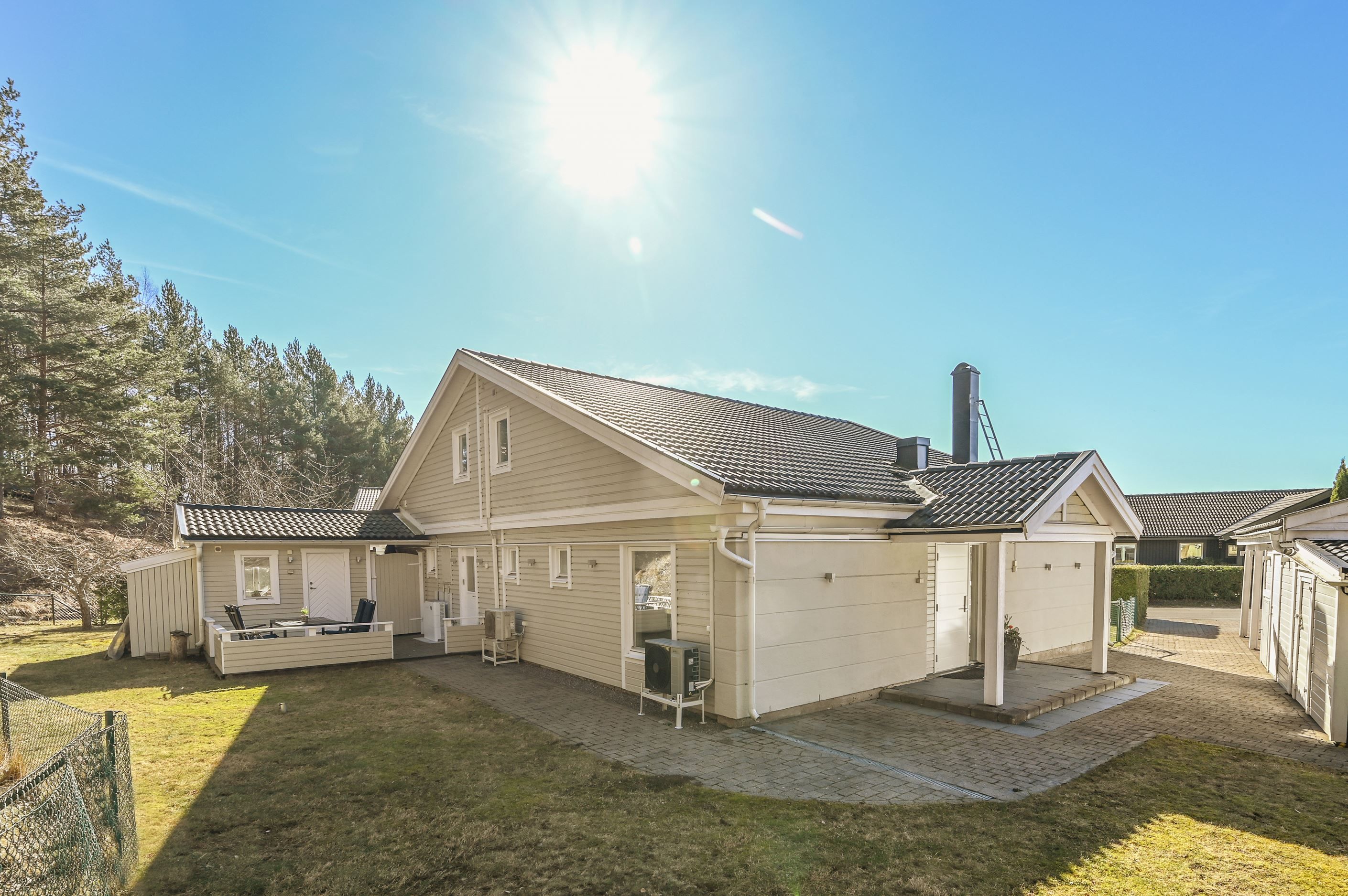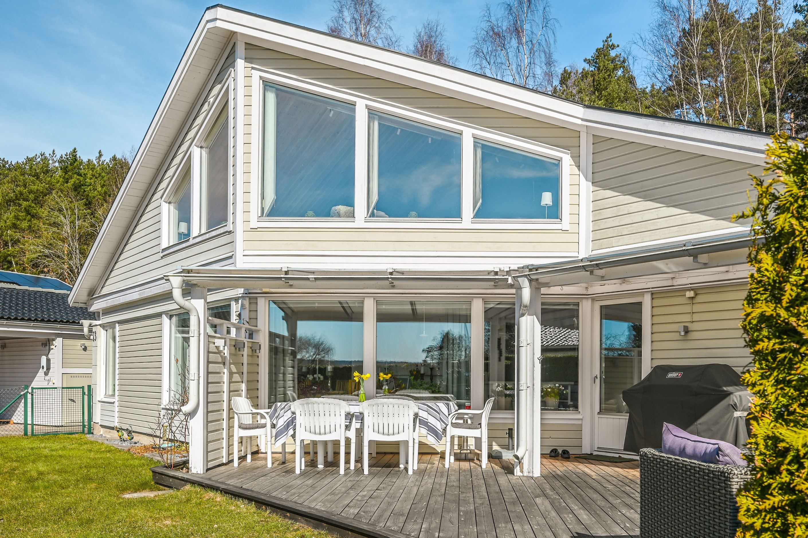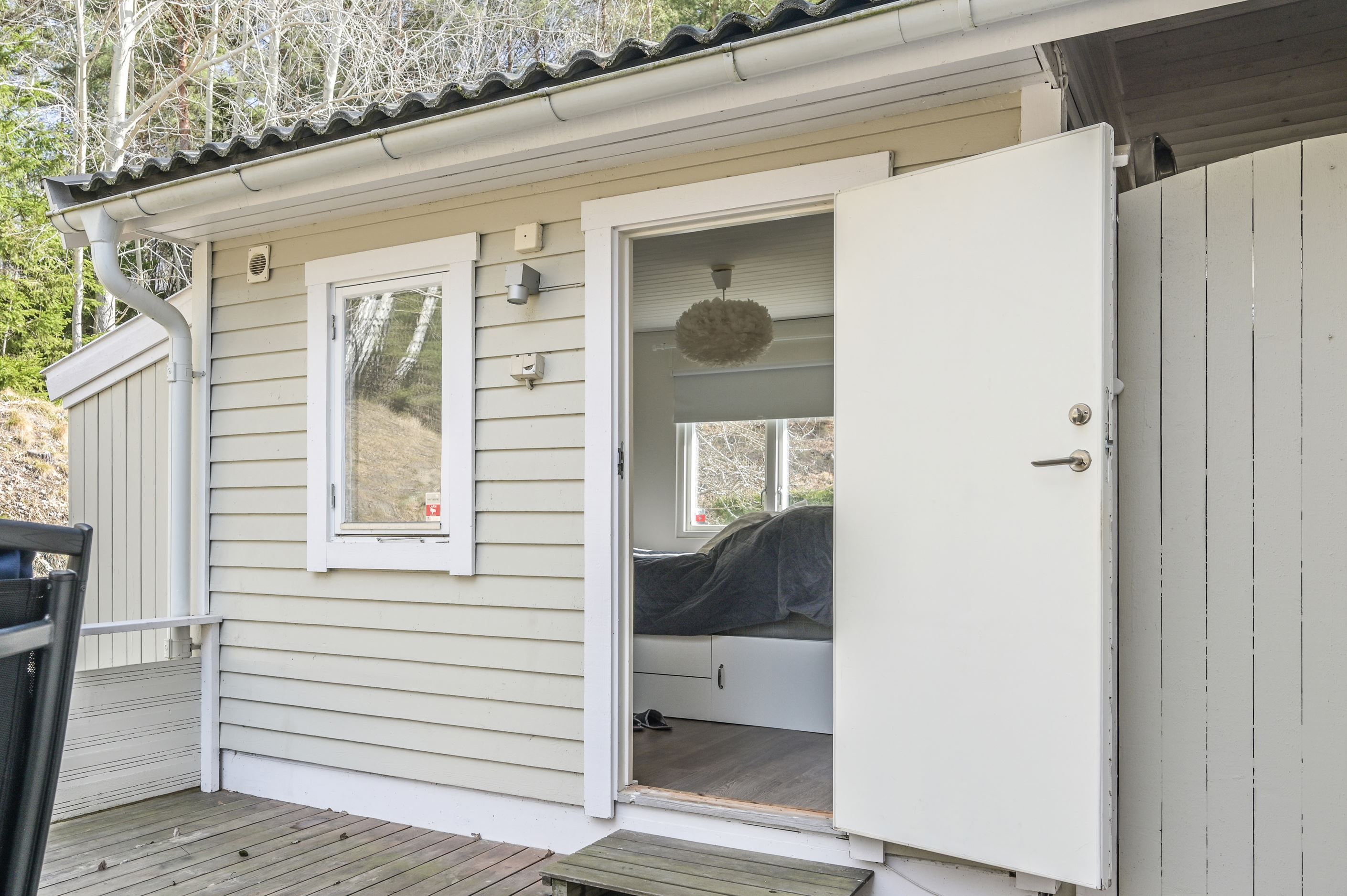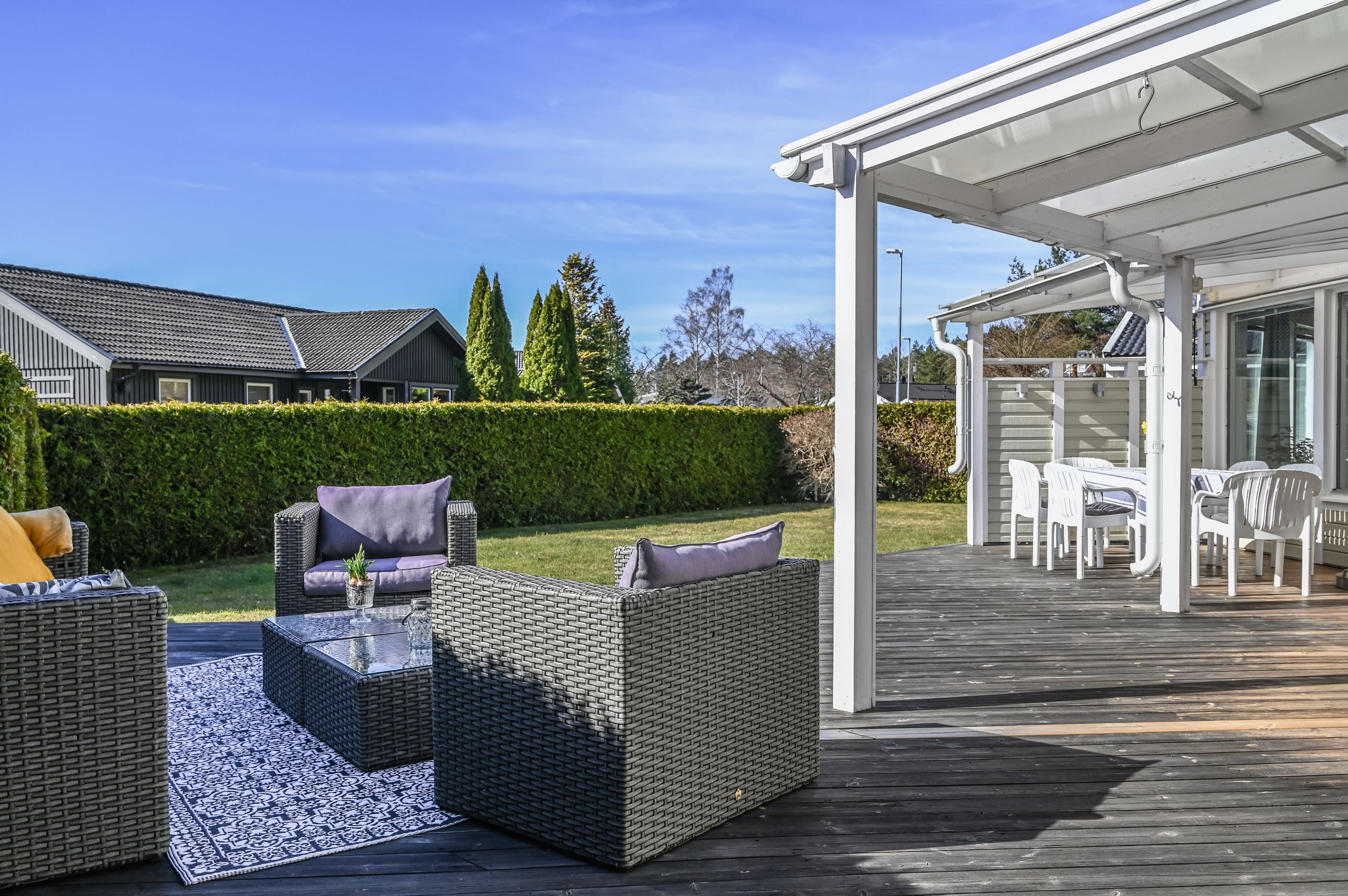 Den plana tomten är lättskött och gränsar till allmänning, vilket ger en härlig känsla av rymd och närhet till naturen. Uteplatserna är genomtänkt placerade för att skapa skyddade och privata miljöer, där du kan njuta ostört oavsett tid på dagen. På baksidan finns ytterligare en altan för skuggiga stunder samt en separat stuga – idealisk som lekhus, gästrum eller tonårsboende. Goda förvaringsmöjligheter erbjuds via flera förråd och uterum.