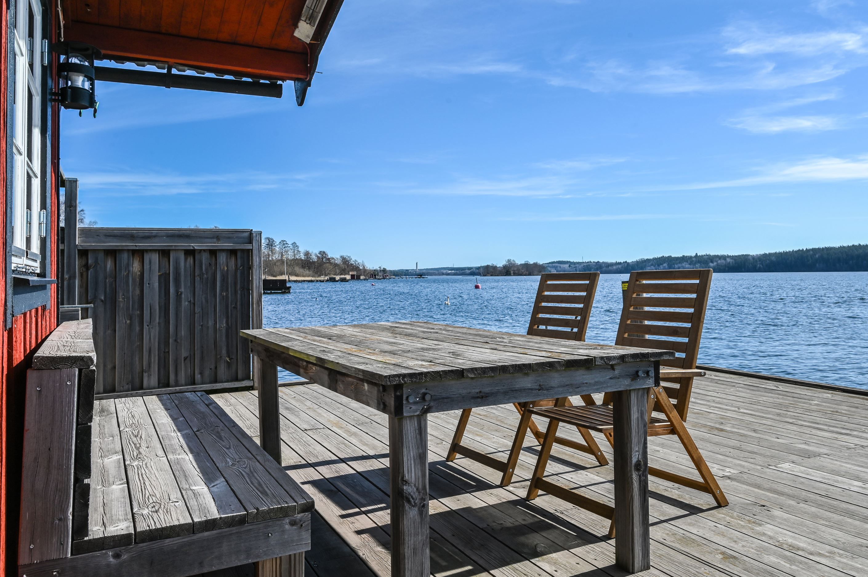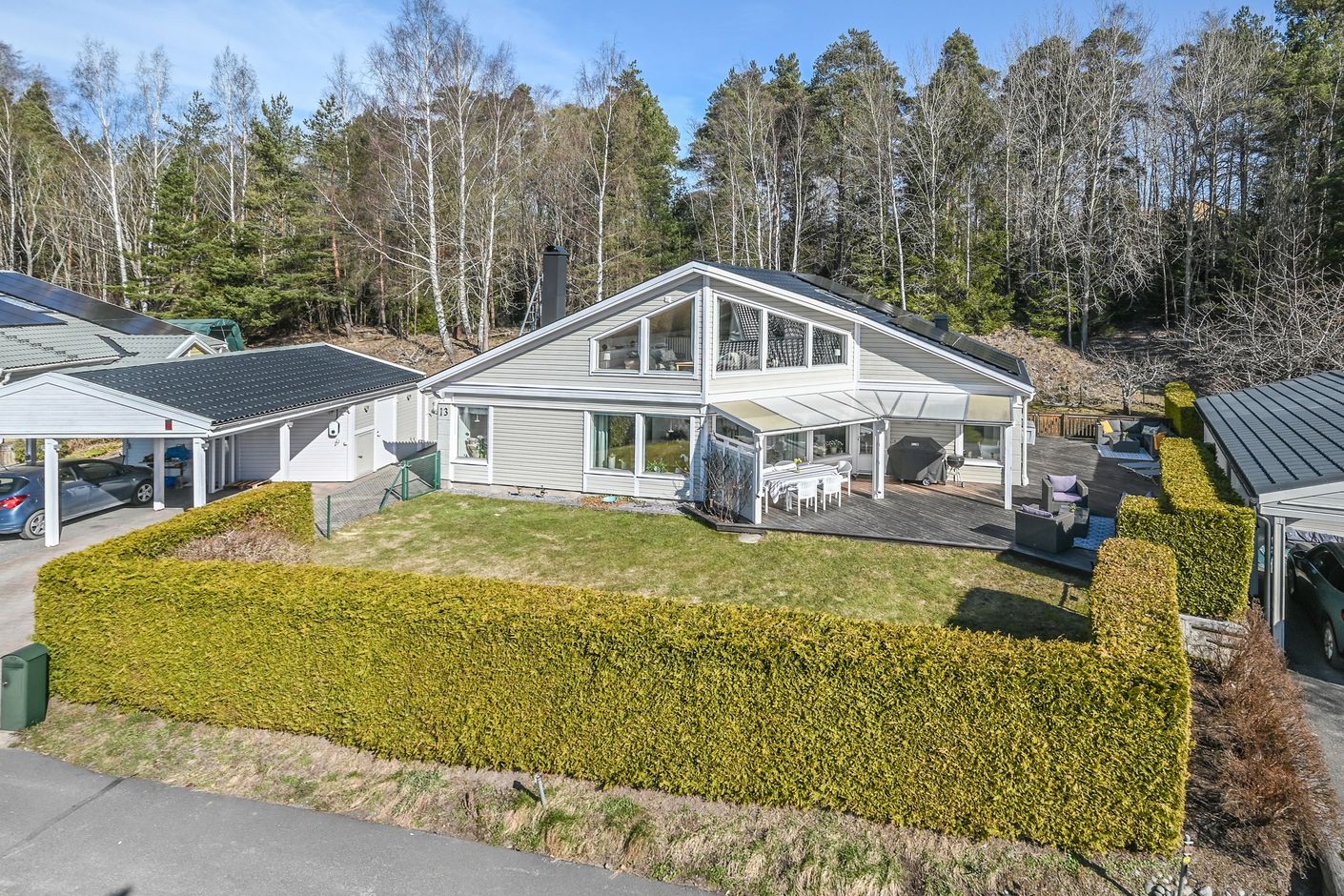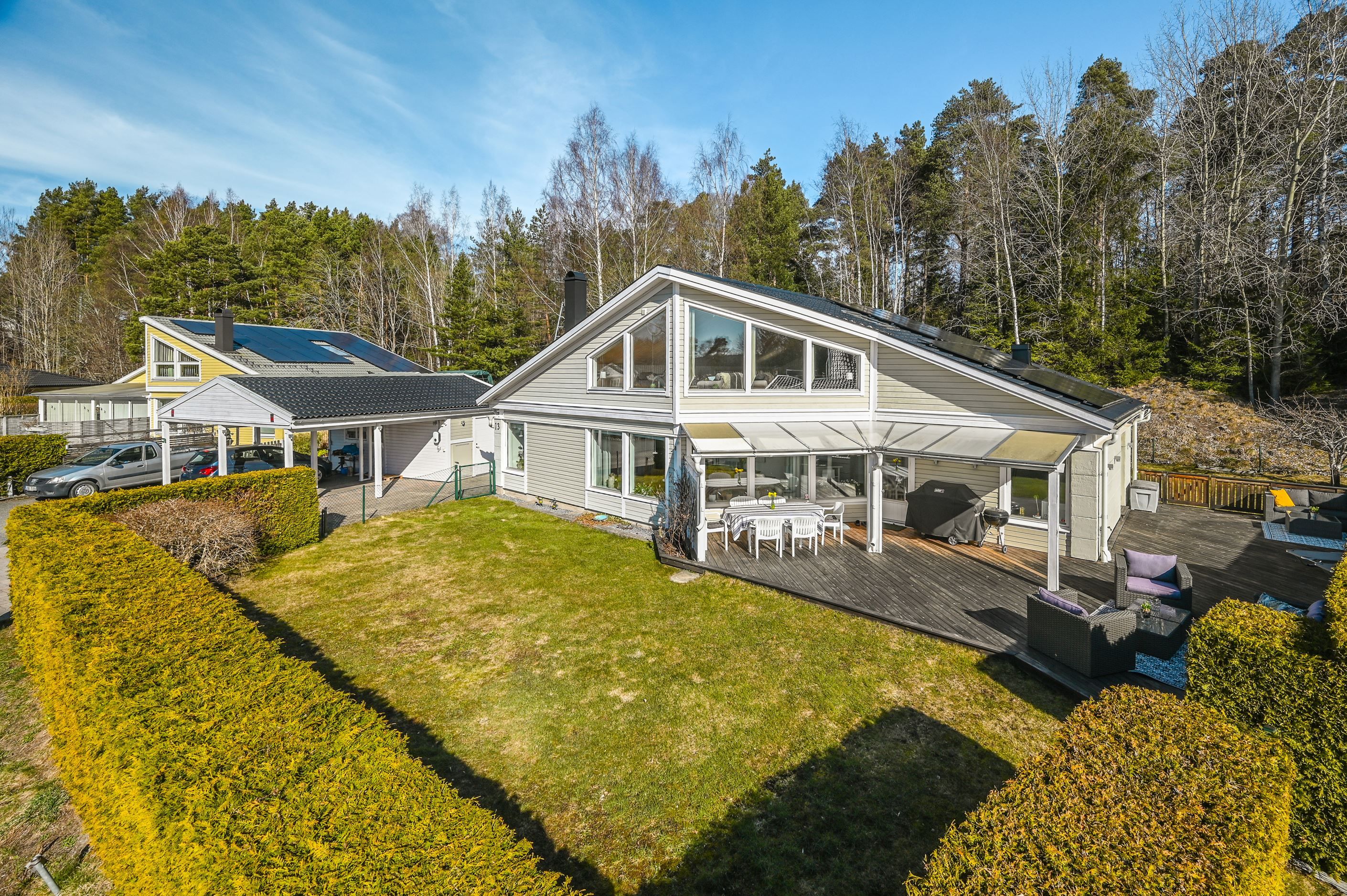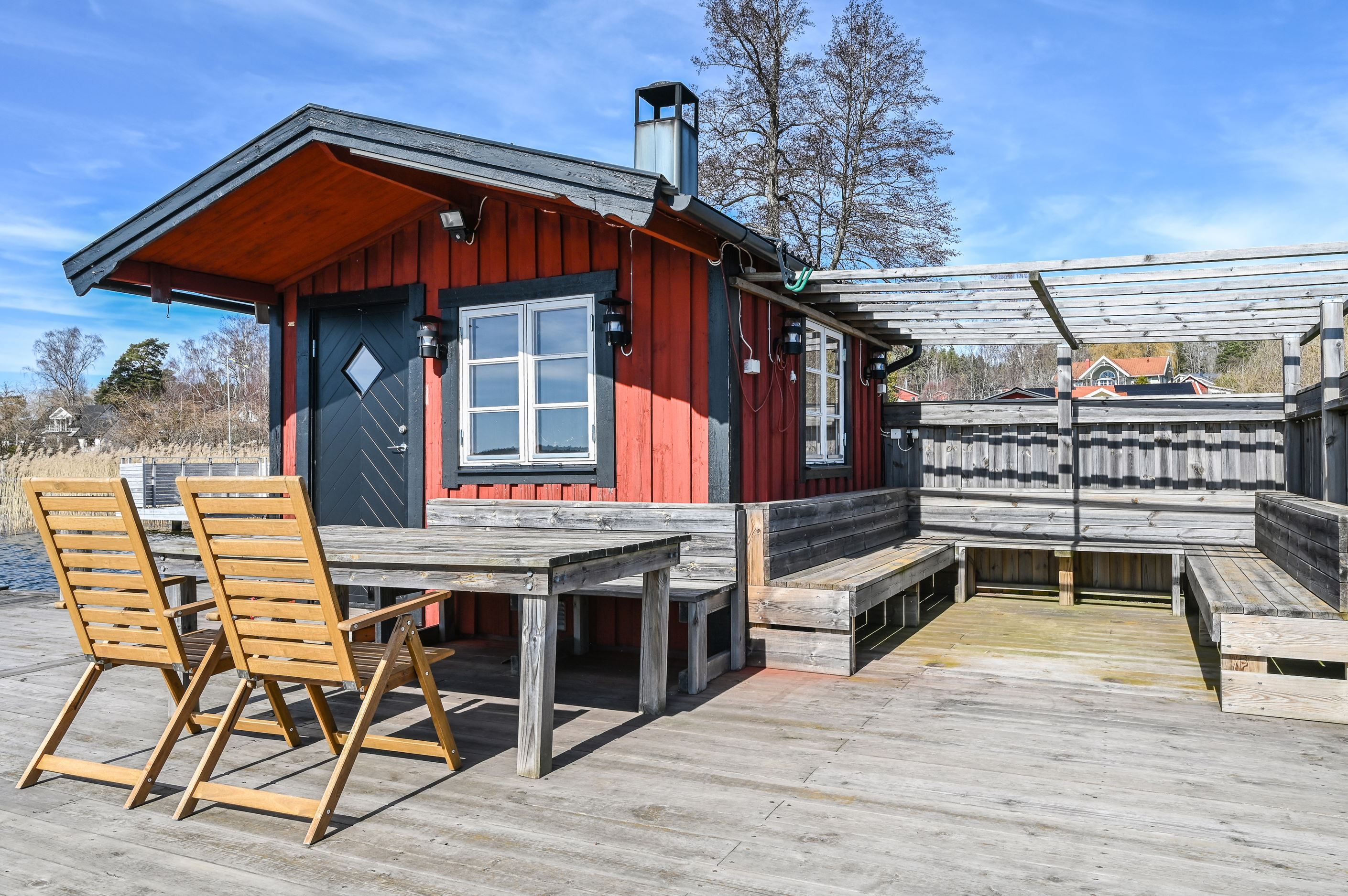 Den plana tomten är lättskött och gränsar till allmänning, vilket ger en härlig känsla av rymd och närhet till naturen. Uteplatserna är genomtänkt placerade för att skapa skyddade och privata miljöer, där du kan njuta ostört oavsett tid på dagen. På baksidan finns ytterligare en altan för skuggiga stunder samt en separat stuga – idealisk som lekhus, gästrum eller tonårsboende. Goda förvaringsmöjligheter erbjuds via flera förråd och uterum.