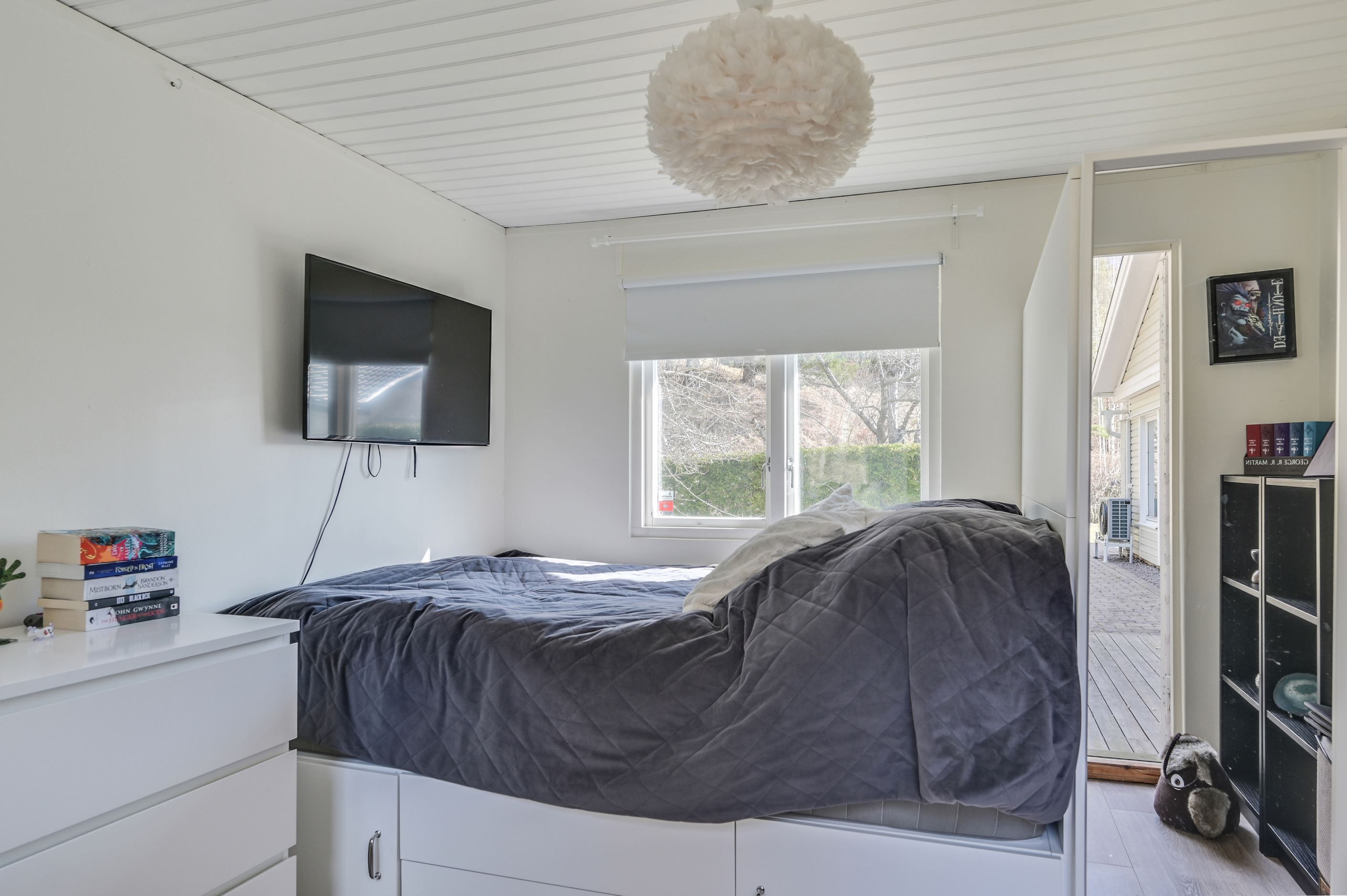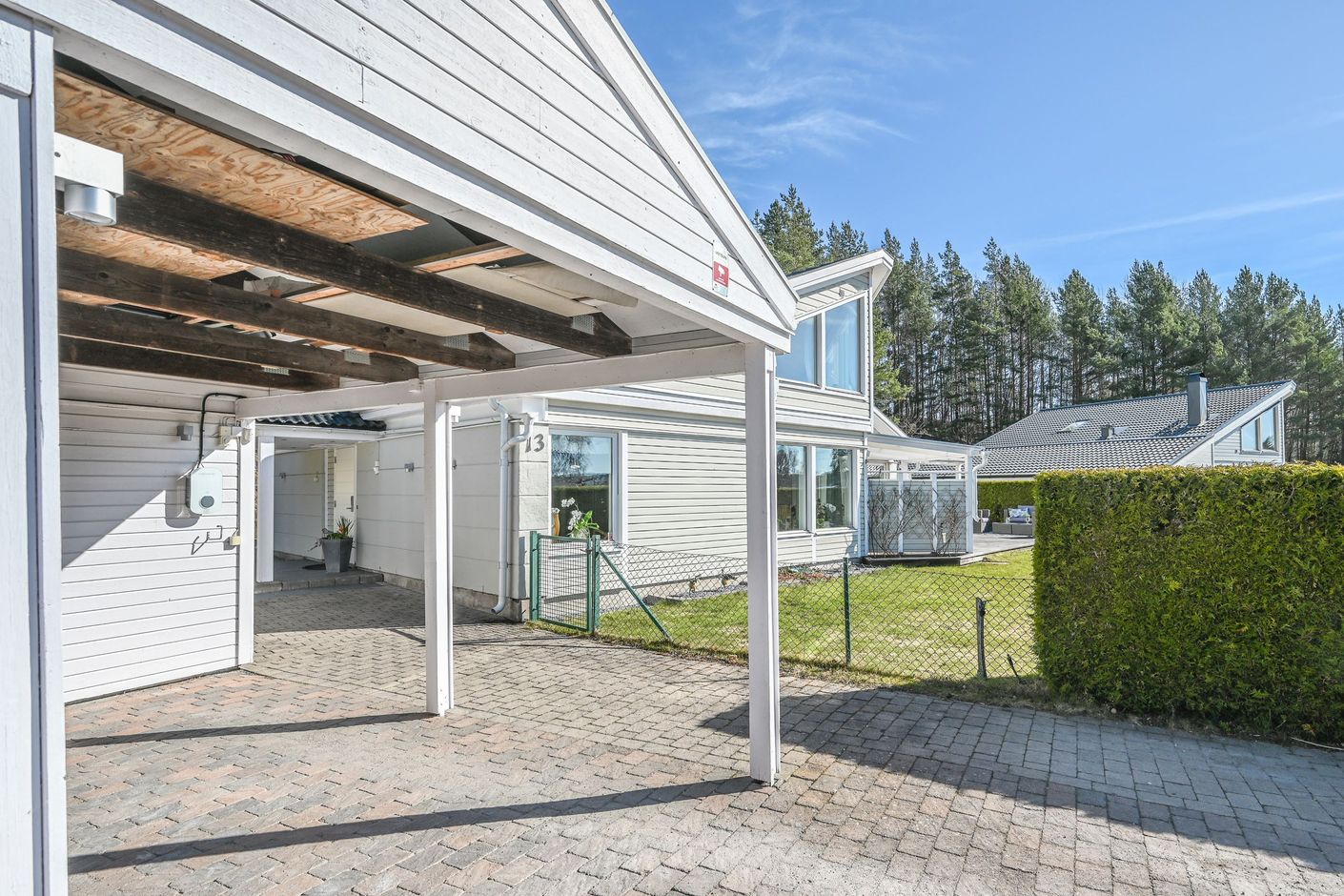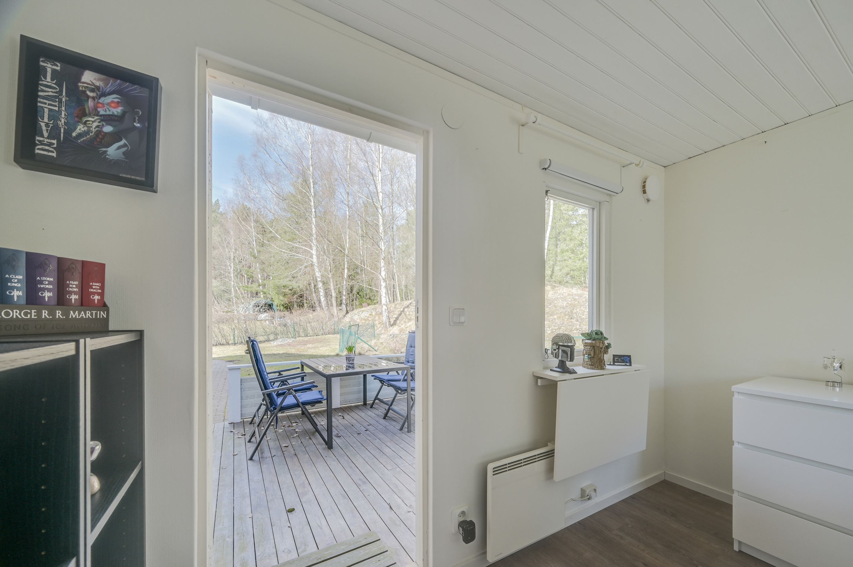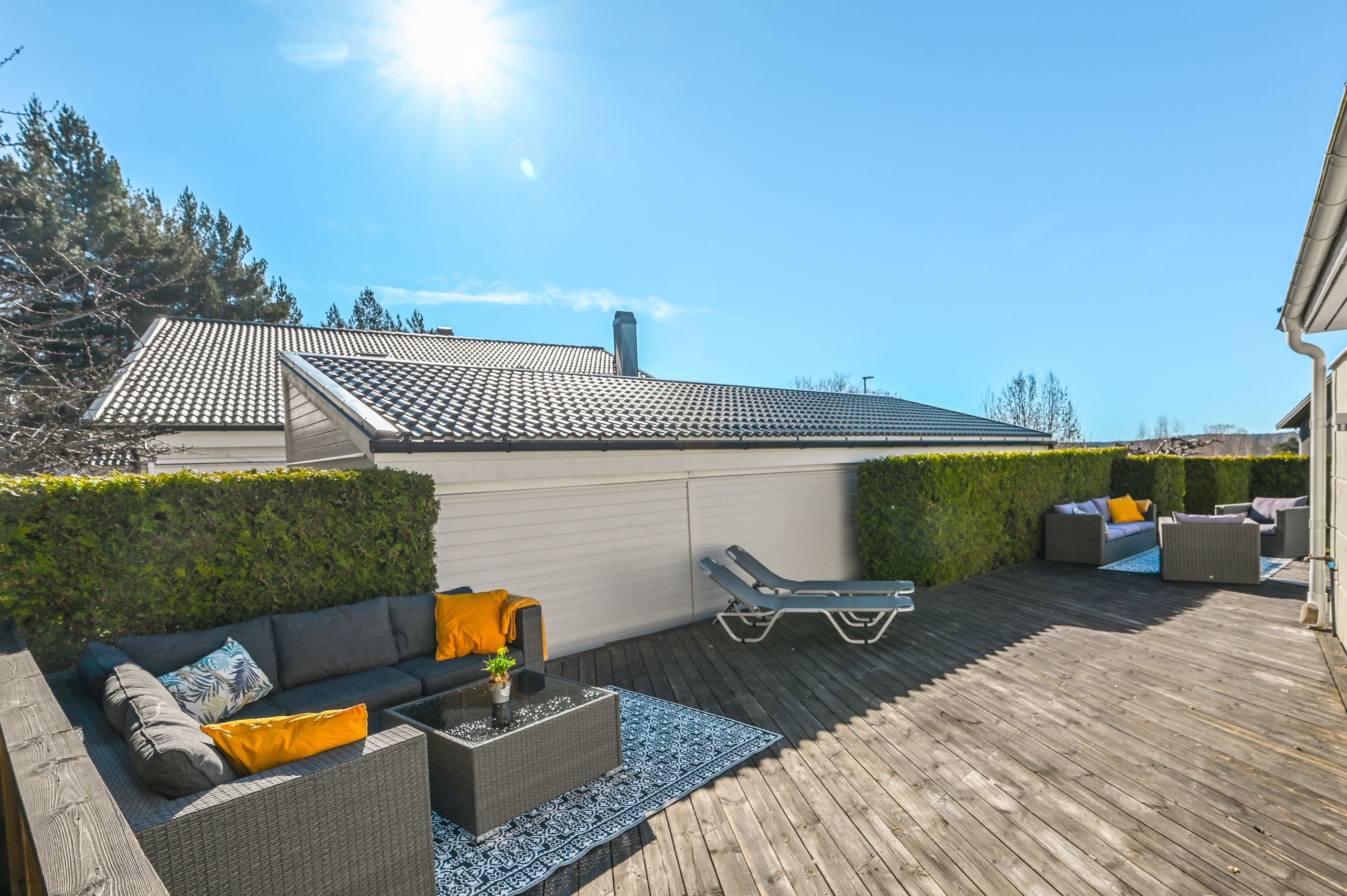 Den plana tomten är lättskött och gränsar till allmänning, vilket ger en härlig känsla av rymd och närhet till naturen. Uteplatserna är genomtänkt placerade för att skapa skyddade och privata miljöer, där du kan njuta ostört oavsett tid på dagen. På baksidan finns ytterligare en altan för skuggiga stunder samt en separat stuga – idealisk som lekhus, gästrum eller tonårsboende. Goda förvaringsmöjligheter erbjuds via flera förråd och uterum.