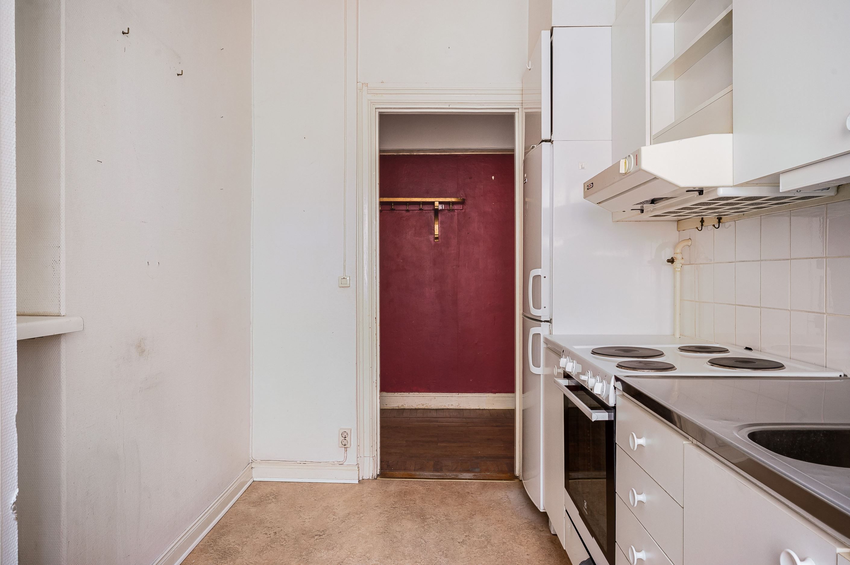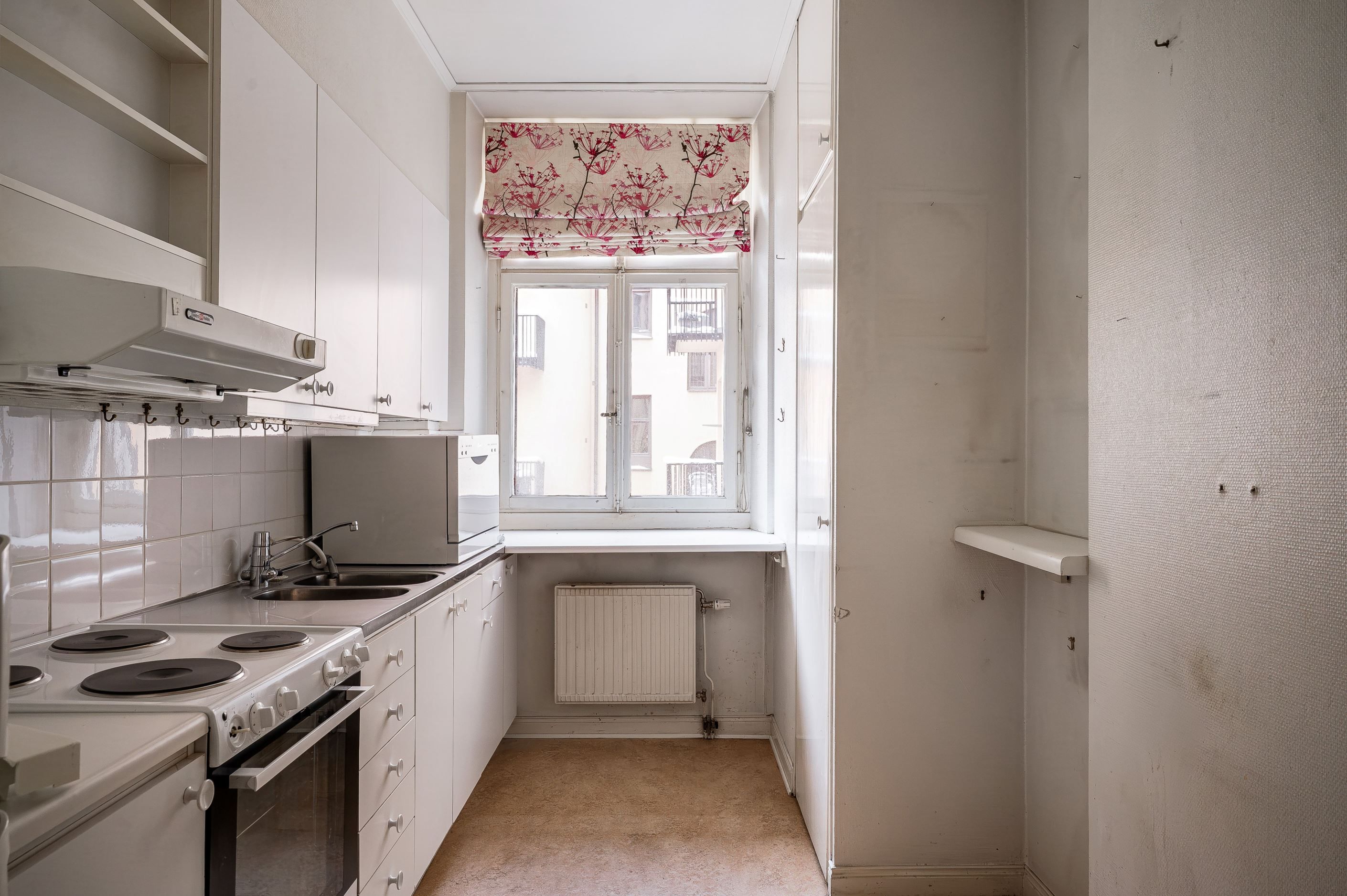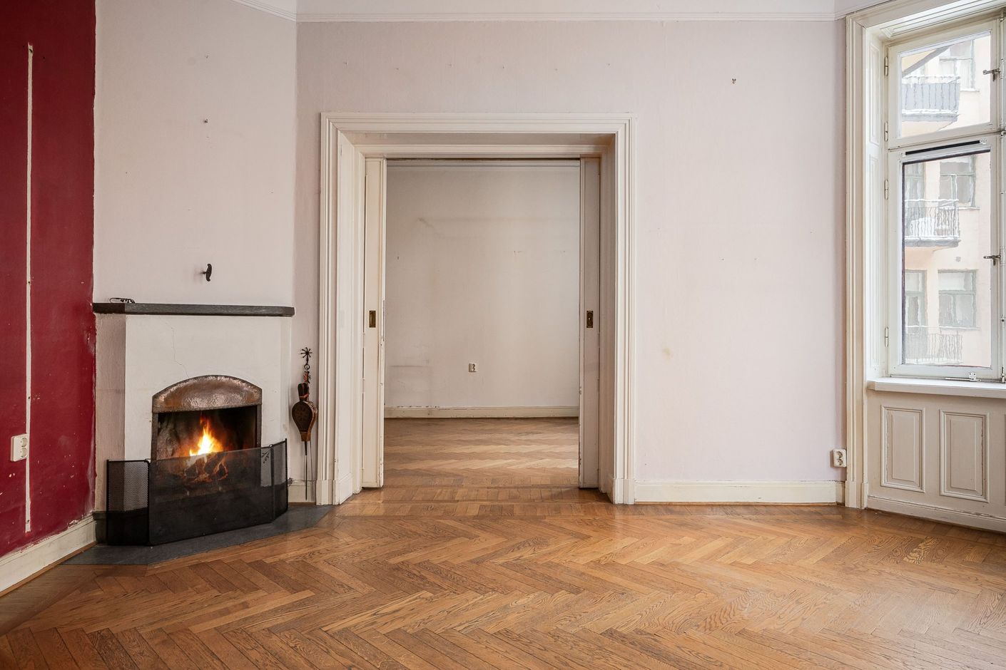 Lägenheten präglas av tidstypiska attribut såsom vackert fiskbensparkettgolv, hög takhöjd, stora fönster med djupa, speglade nischer och ett magnifikt burspråk som ger vardagsrummet ett härligt ljusinsläpp och rymd. Den öppna spisen blir en naturlig mittpunkt och förstärker den klassiska sekelskifteskänslan ytterligare.