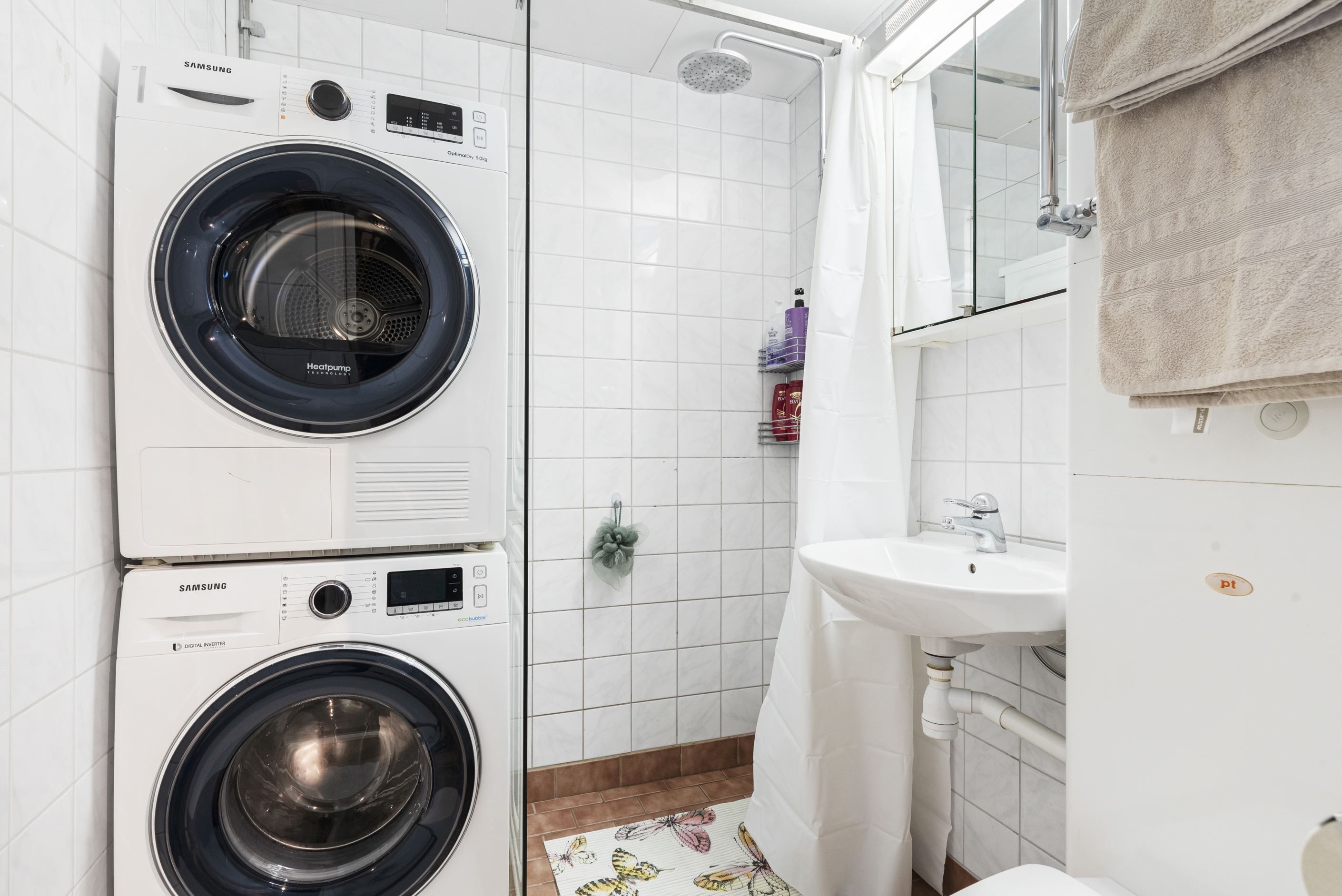 Lägenheten har två rymliga sovrum och ett helkaklat badrum med takdusch och tvättpelare - ett stänk av lyx. Vardagsrummet badar i naturligt ljus tack vare stora fönster, vilket skapar en trivsam atmosfär.