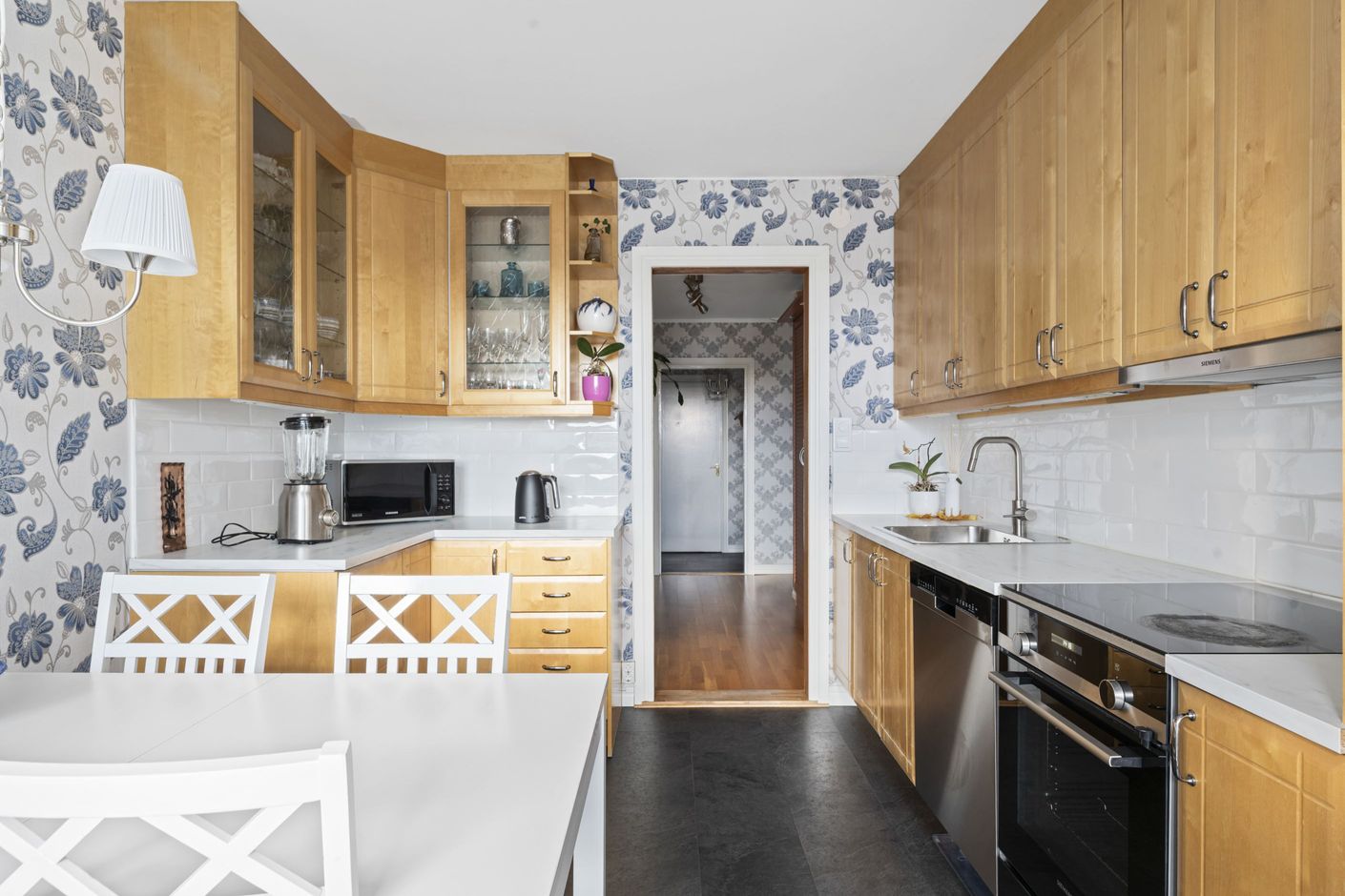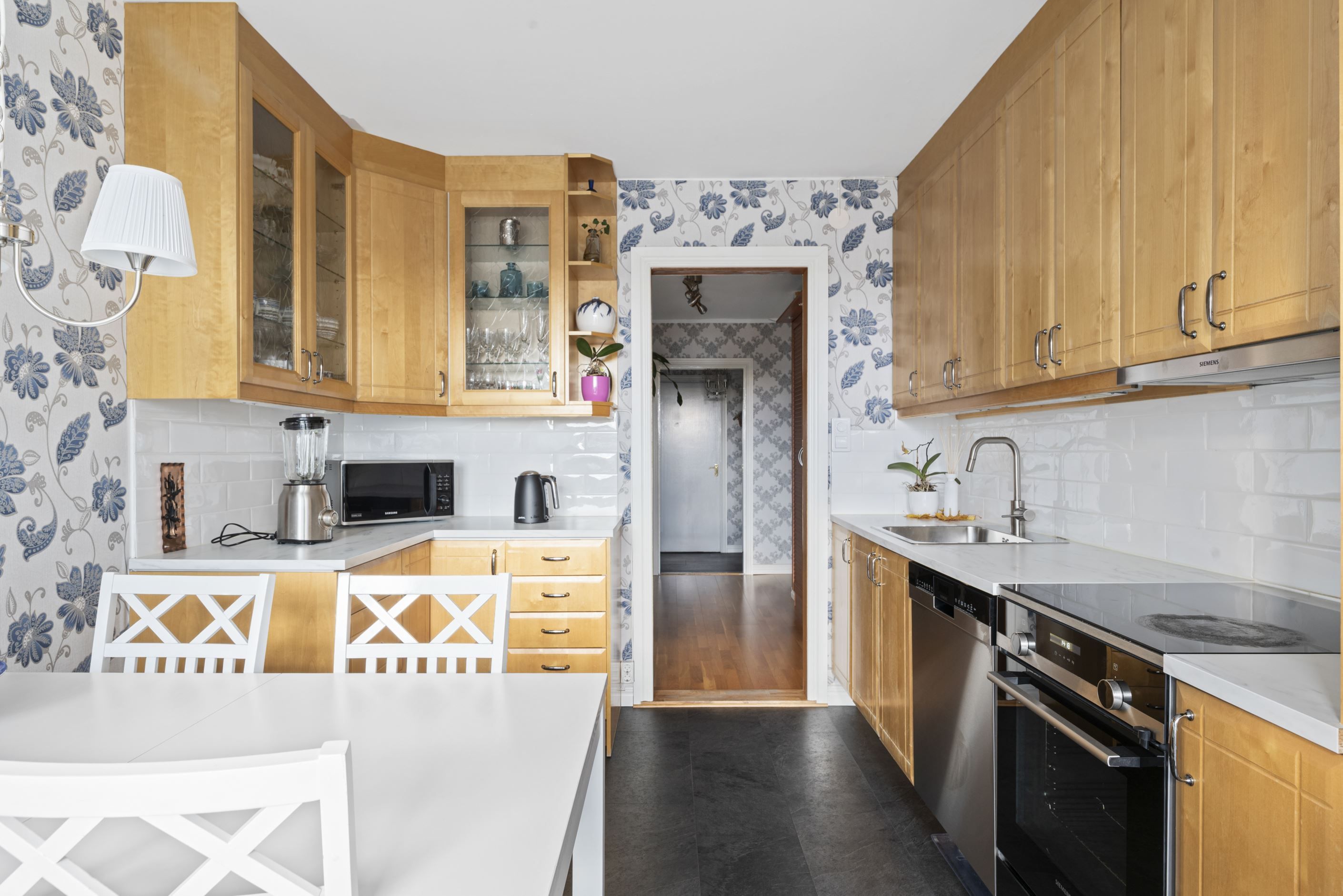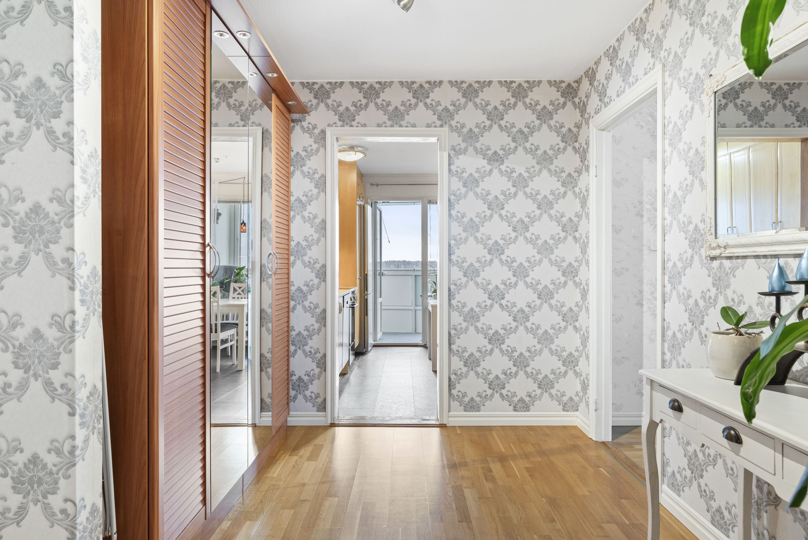 Elegans och komfort sammanstrålar högt över marken i denna strålande 3:a i Näsbydal, belägen på elfte våningen. Med en generös yta om 83 kvadratmeter välkomnas du av en ljus hall utrustad med stilfull ekparkett och praktisk klädkammare. Det fullt utrustade köket, som är drömmen för matälskaren, bjuder dessutom på access till en solfylld balkong.
