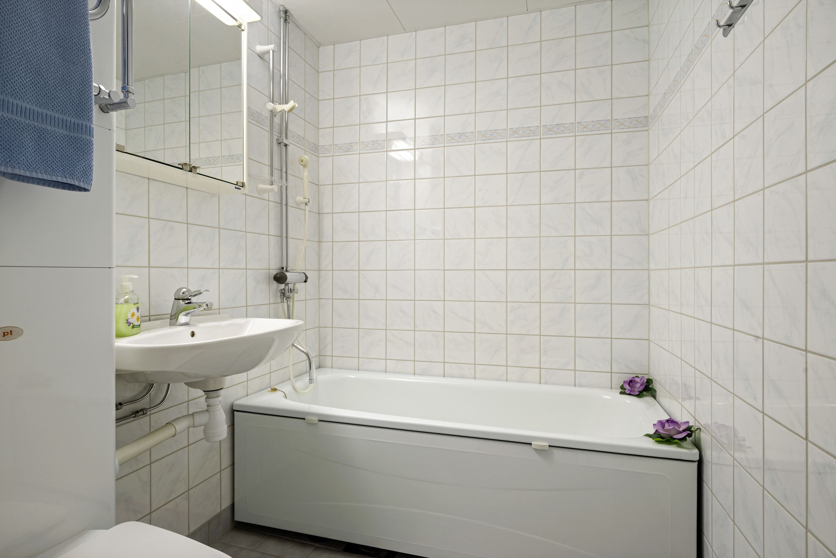 Badrummet är helkaklat och renoverades i samband med stambytet (2000–2003). Här finns badkar för lugna och avkopplande stunder.