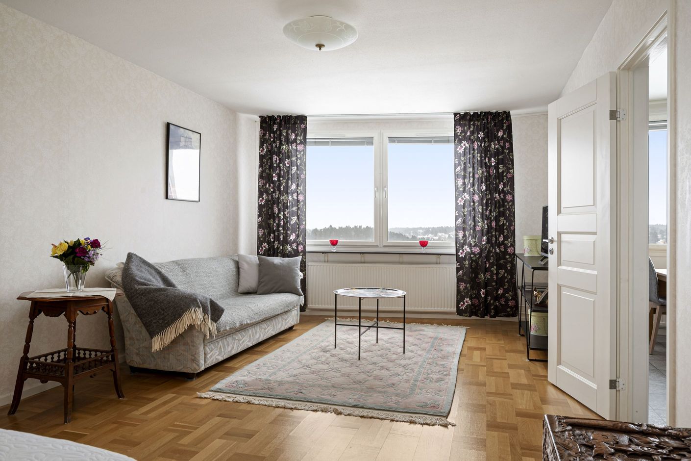 Det luftiga vardagsrummet är lättmöblerat och erbjuder gott om plats för både säng, soffhörna och hemmakontor. De stora fönsterpartierna ger ett härligt ljusinsläpp som förstärker känslan av rymd.
